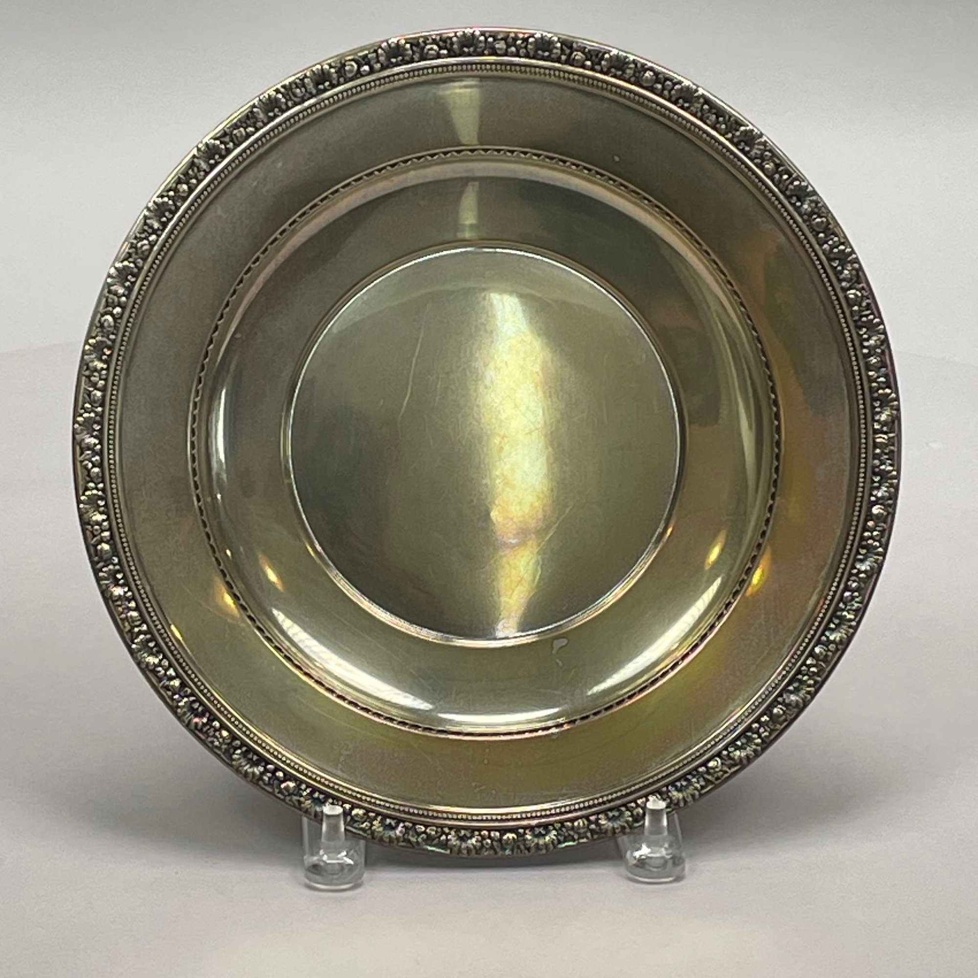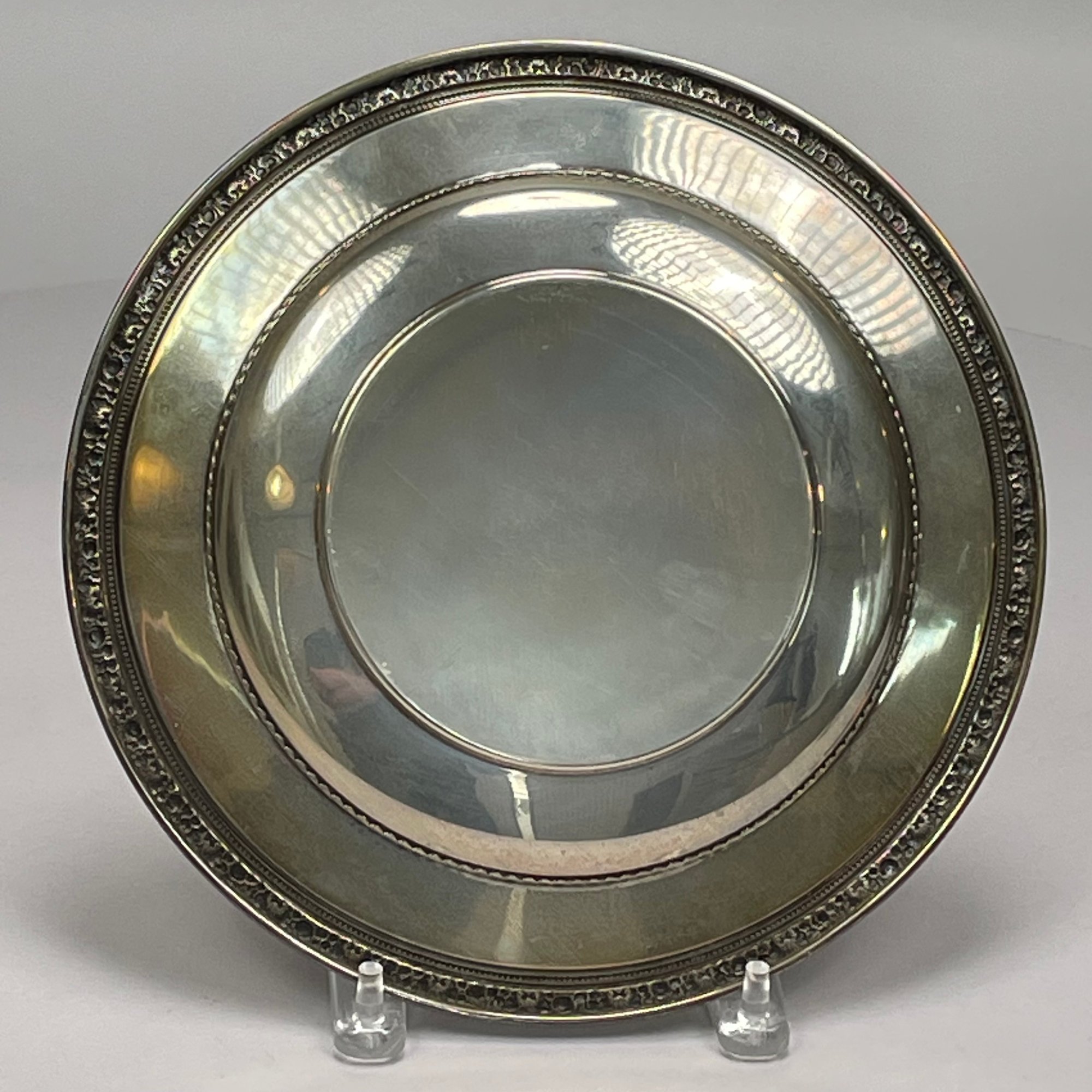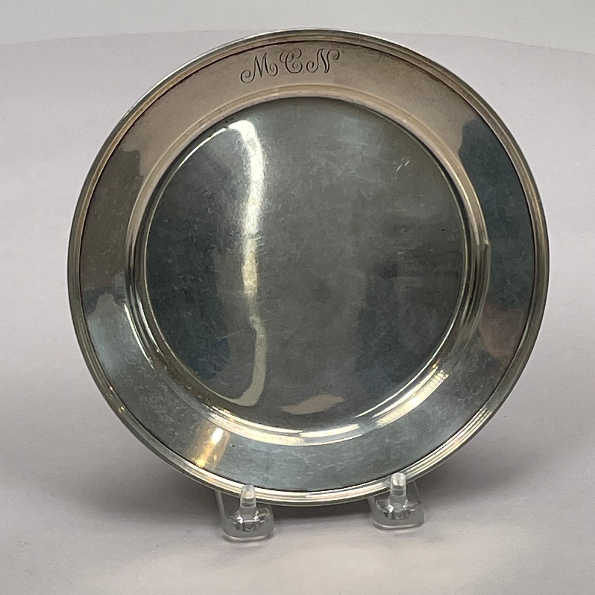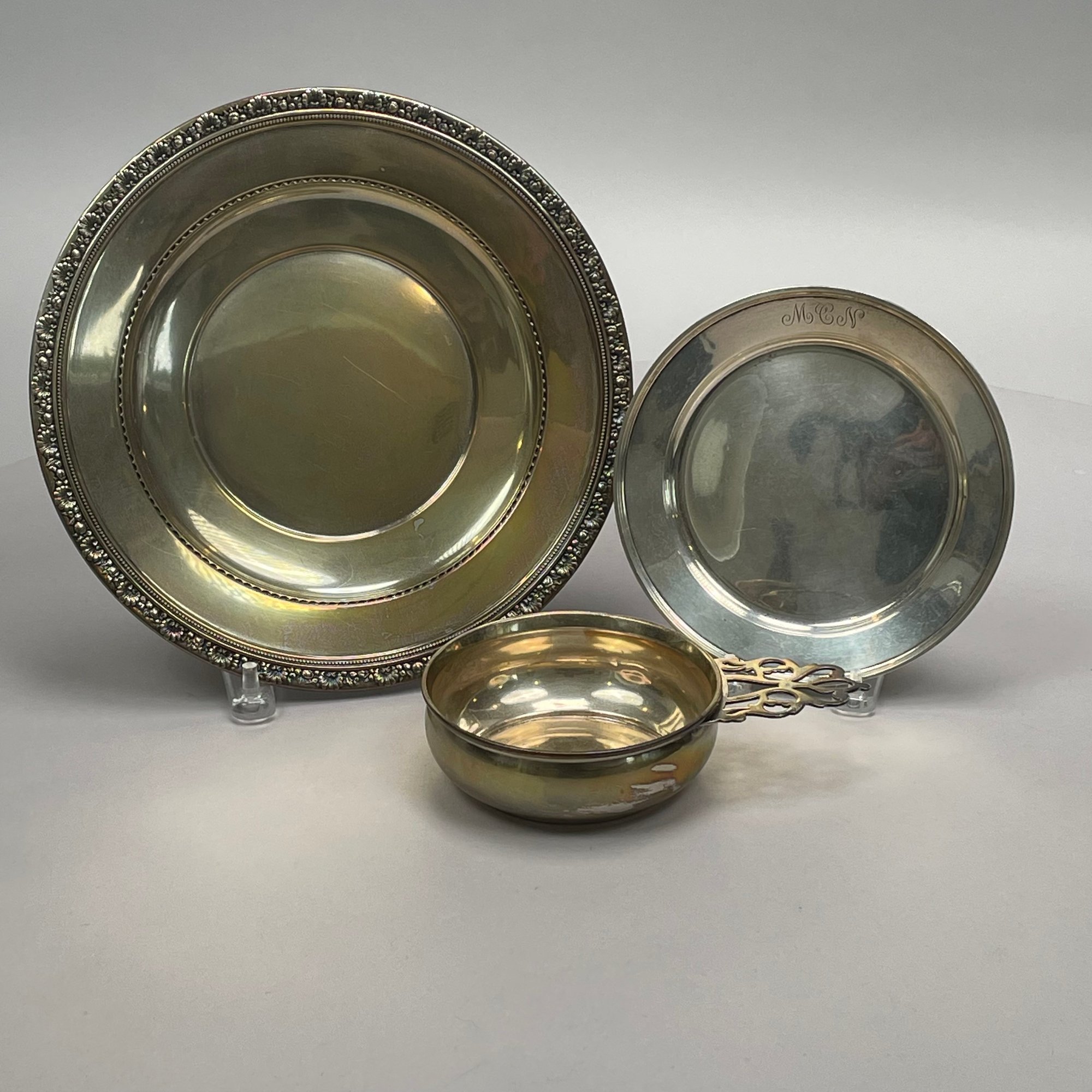 Three American Sterling Silver Serving Wares, Mid-Twentieth Century. Comprising a porringer, Towle Silversmiths, monogrammed; a 7- inch plate, Whiting Mfg. Co., date mark for 1912, monogrammed; and a dish, Reed & Barton, date code for 1940, not monogrammed.