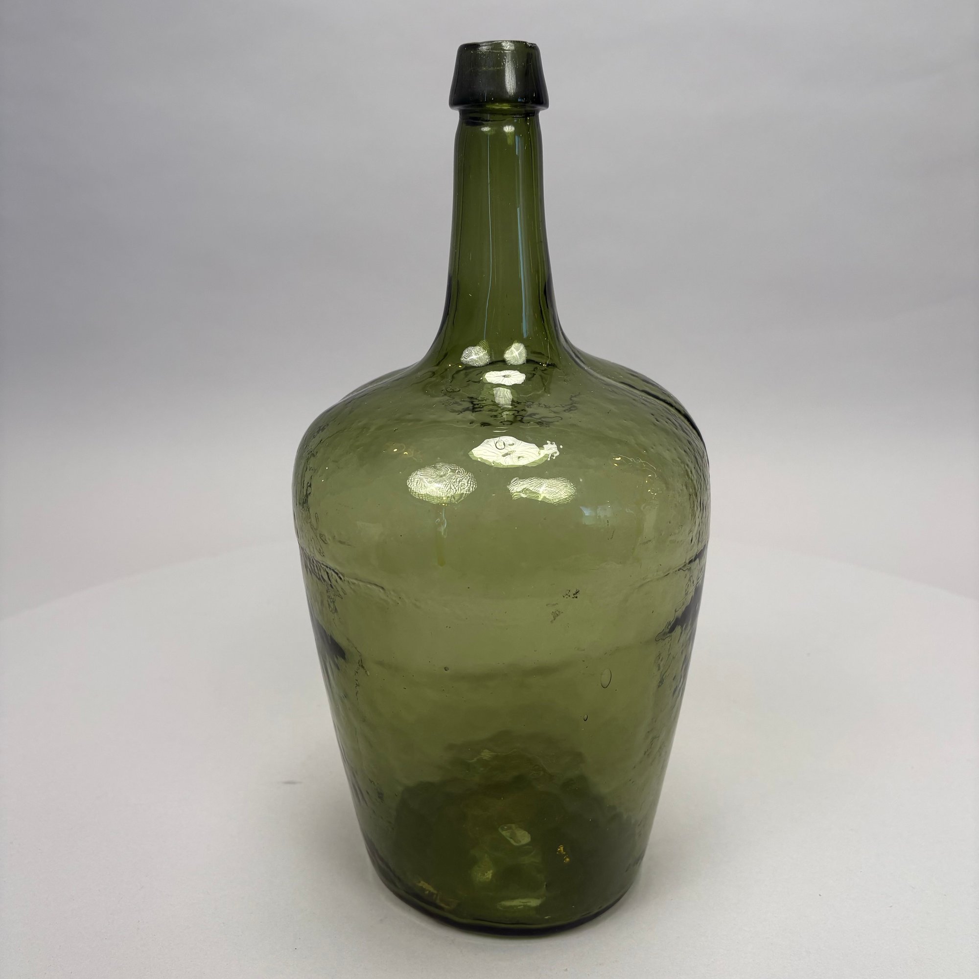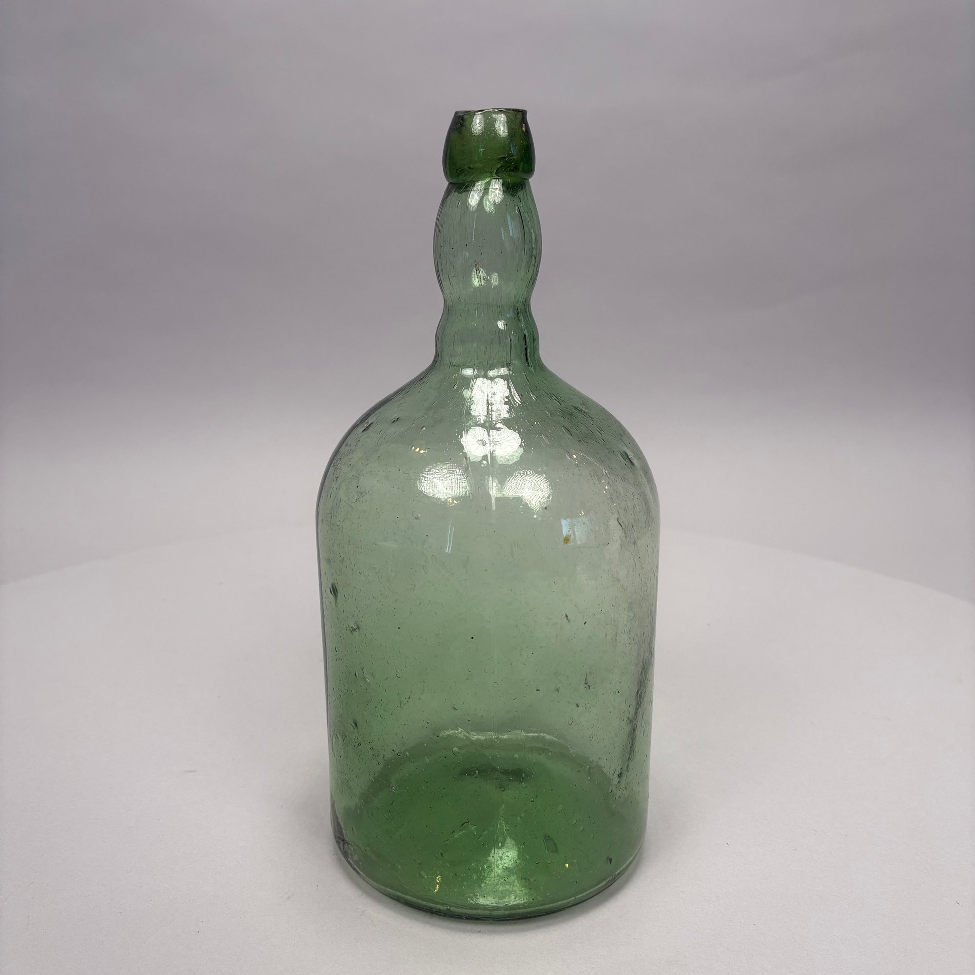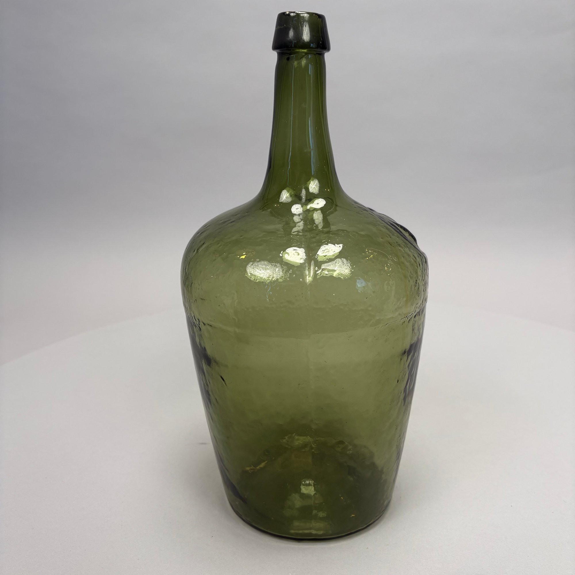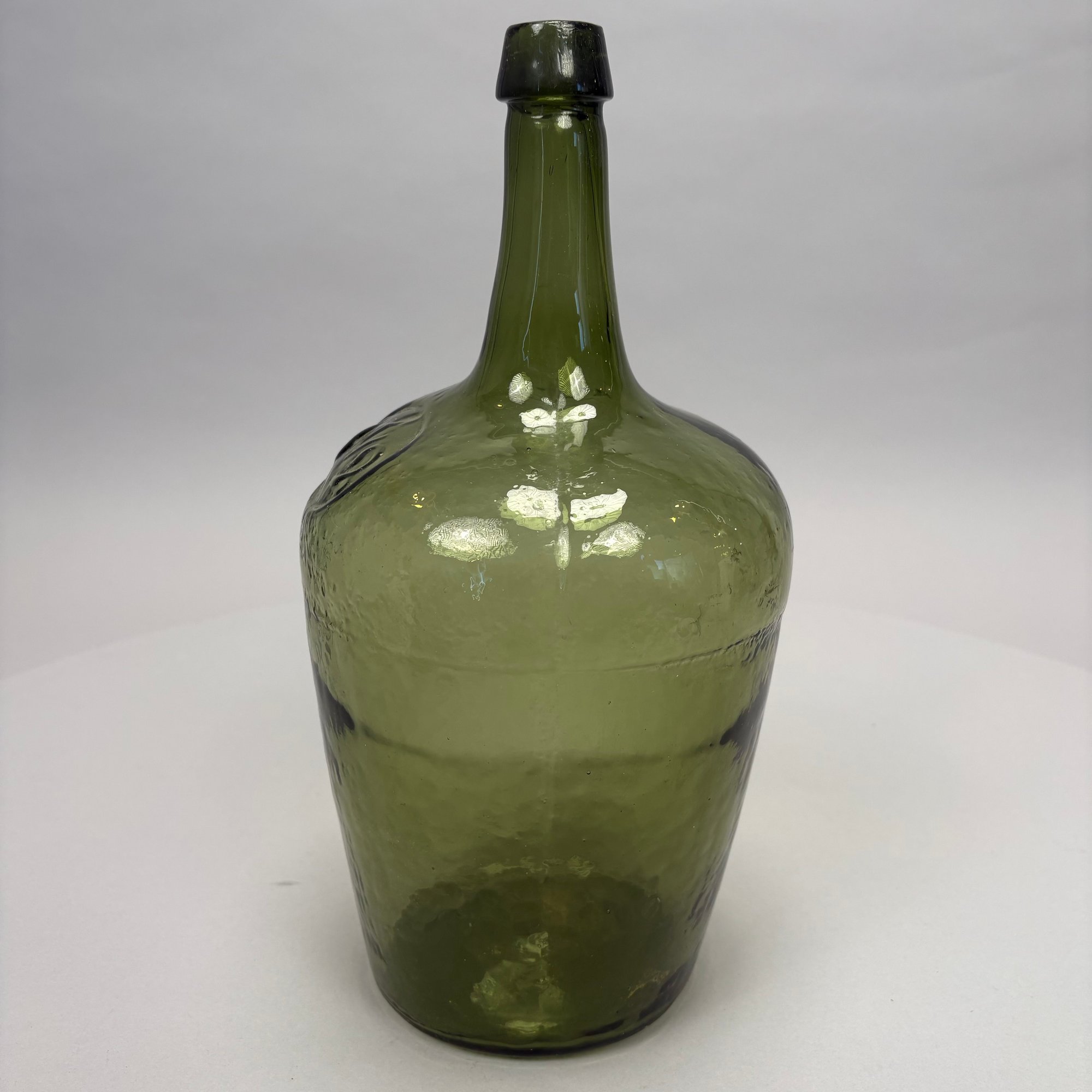 Three Blown Molded Glass Utilitarian Demijohn Bottles. In amber and two shades of green, the tallest molded "4 1/2."