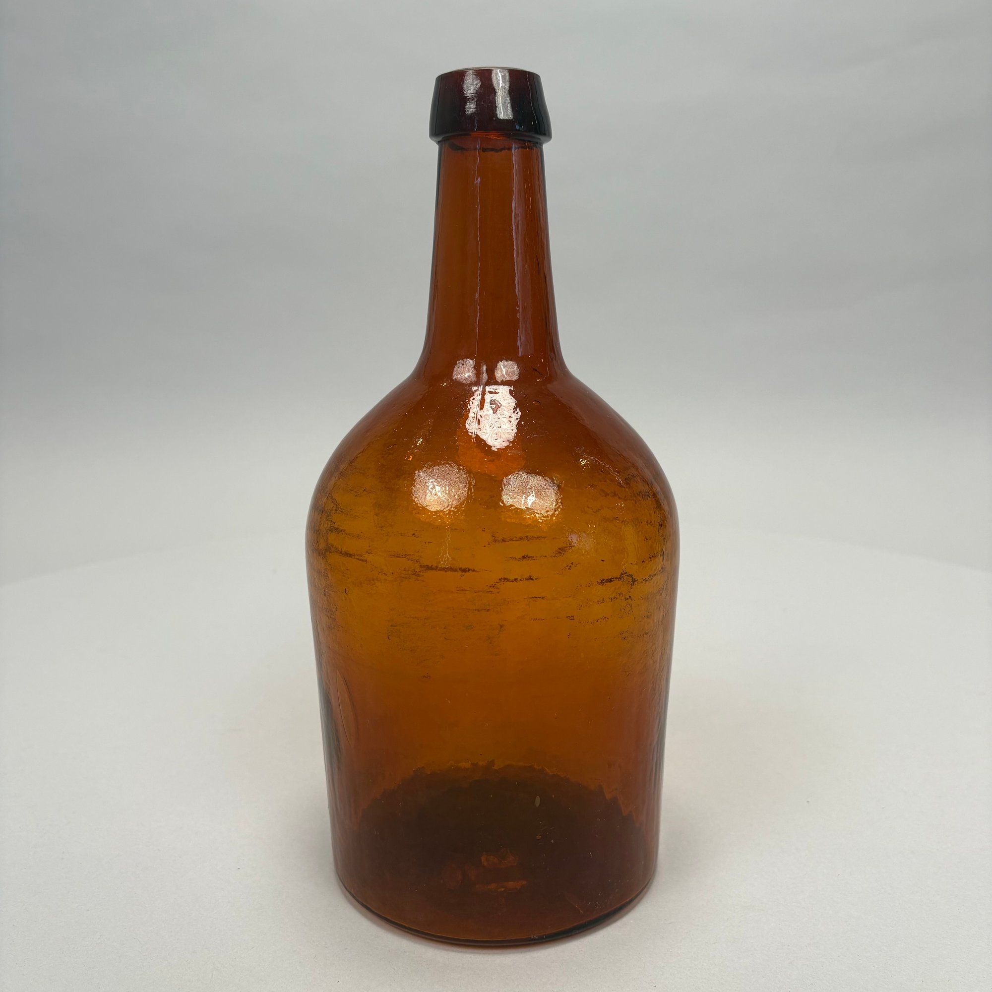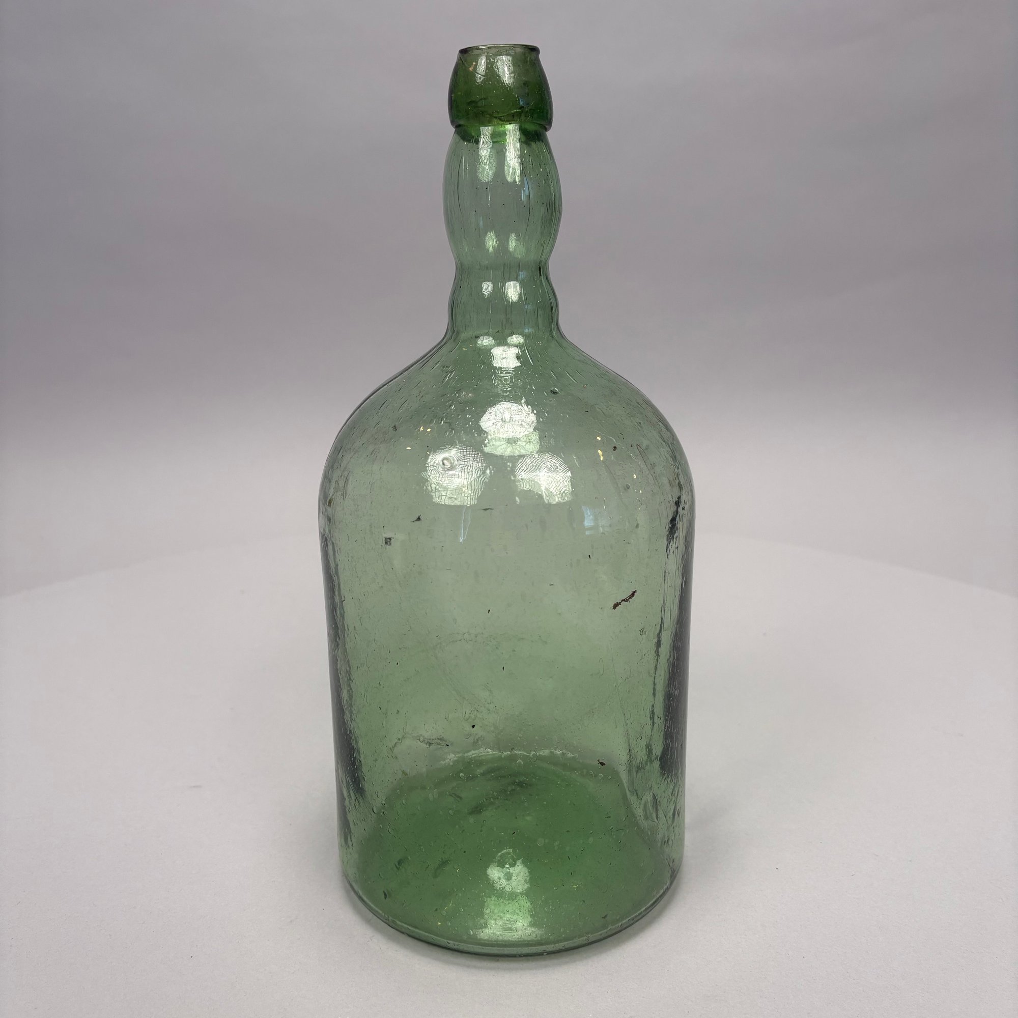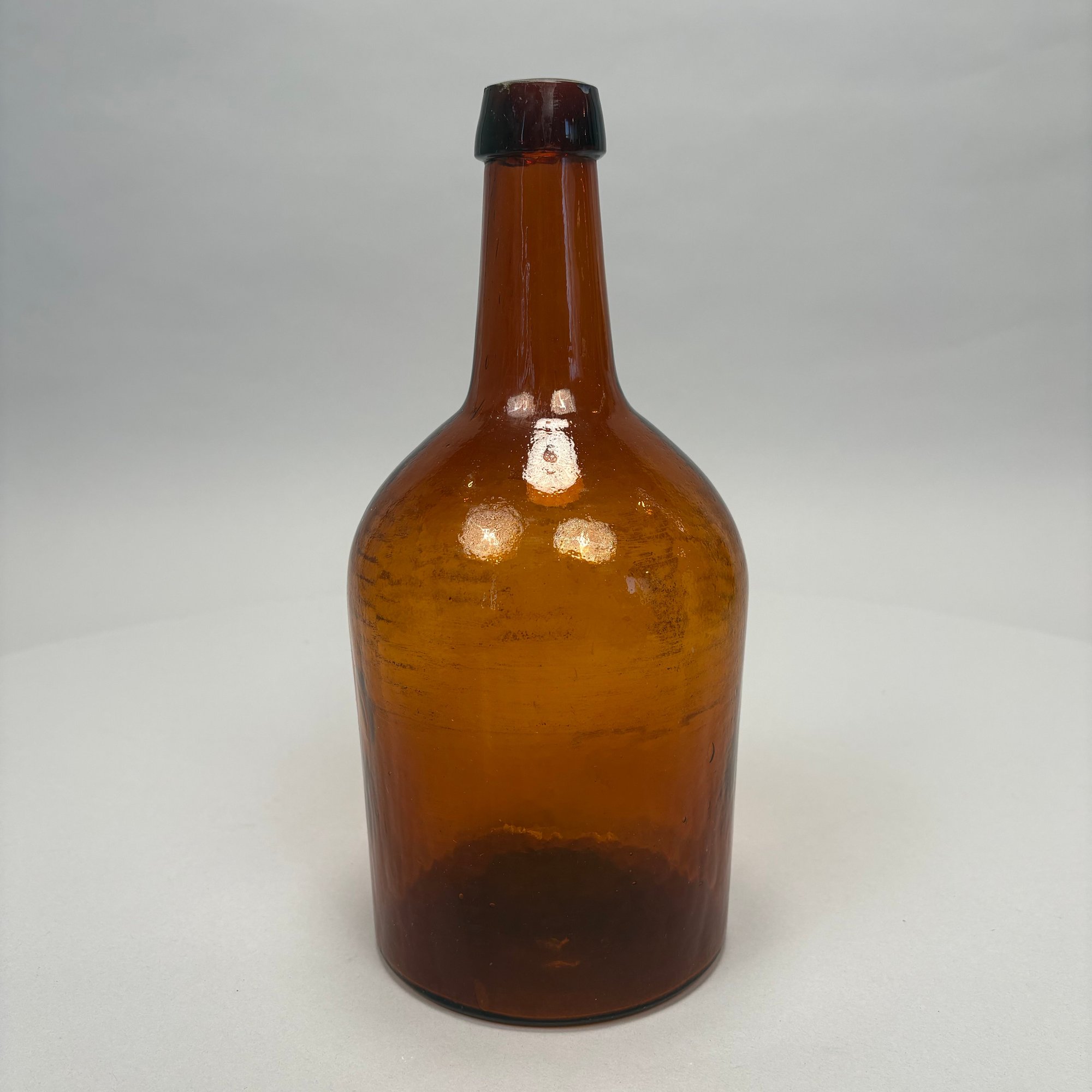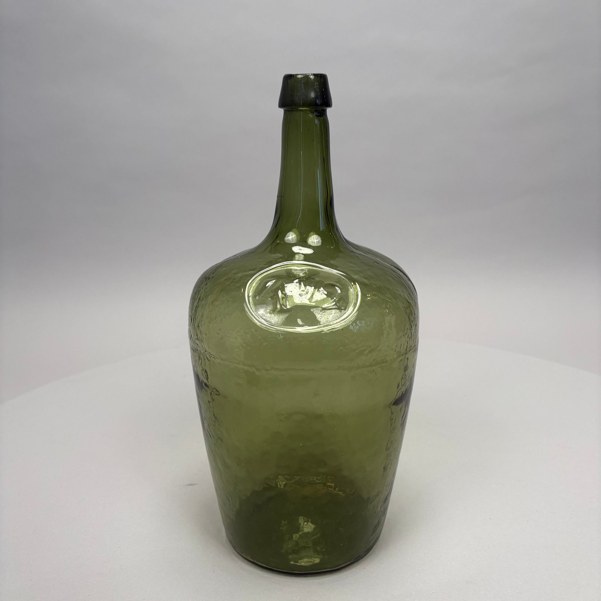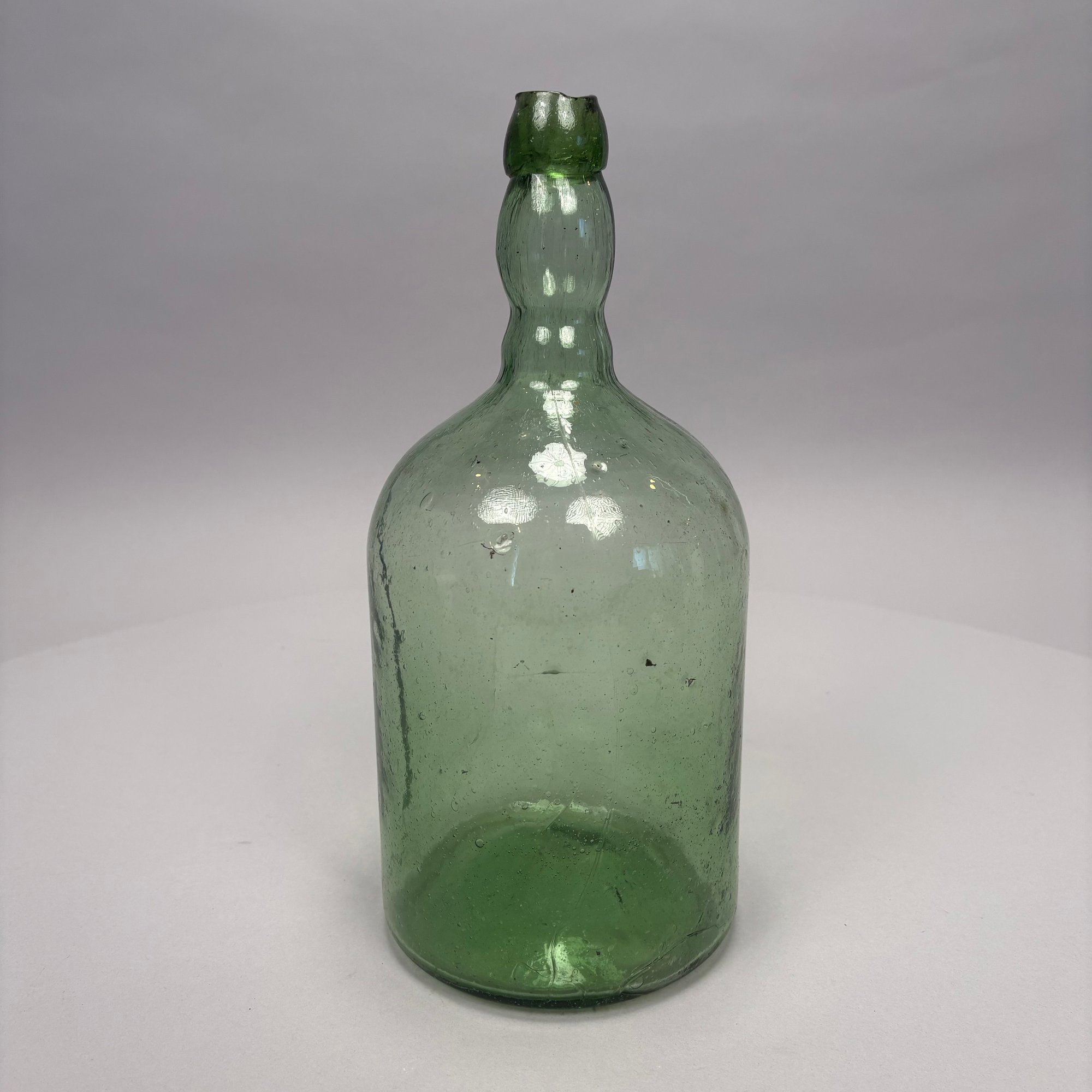 Three Blown Molded Glass Utilitarian Demijohn Bottles. In amber and two shades of green, the tallest molded "4 1/2."