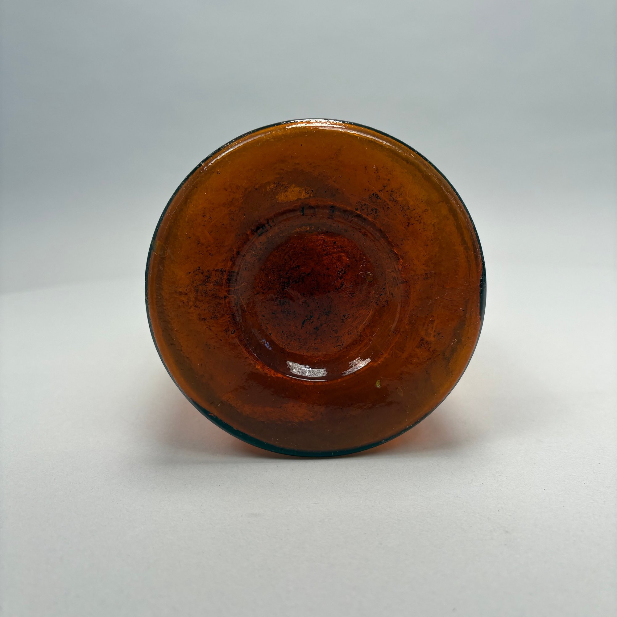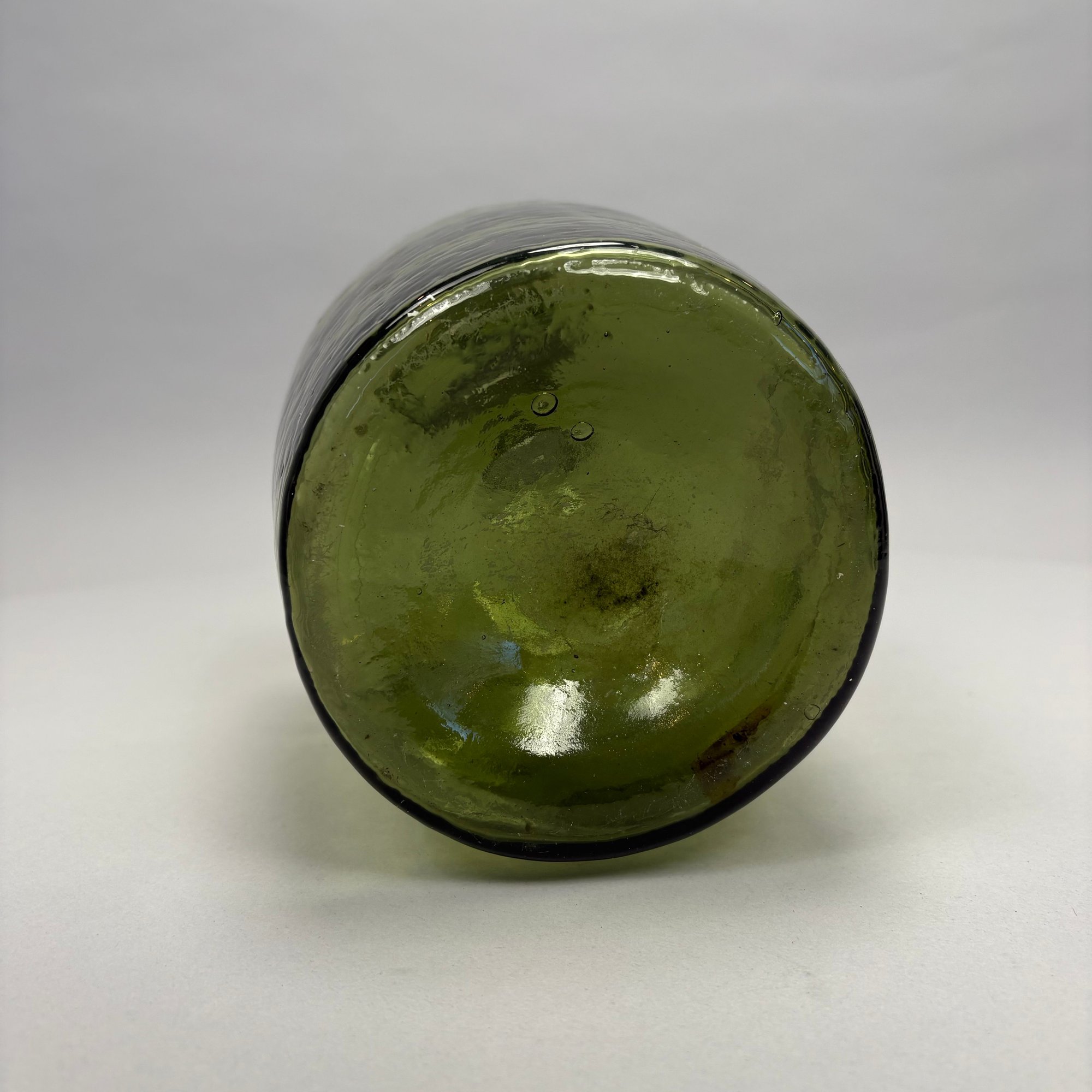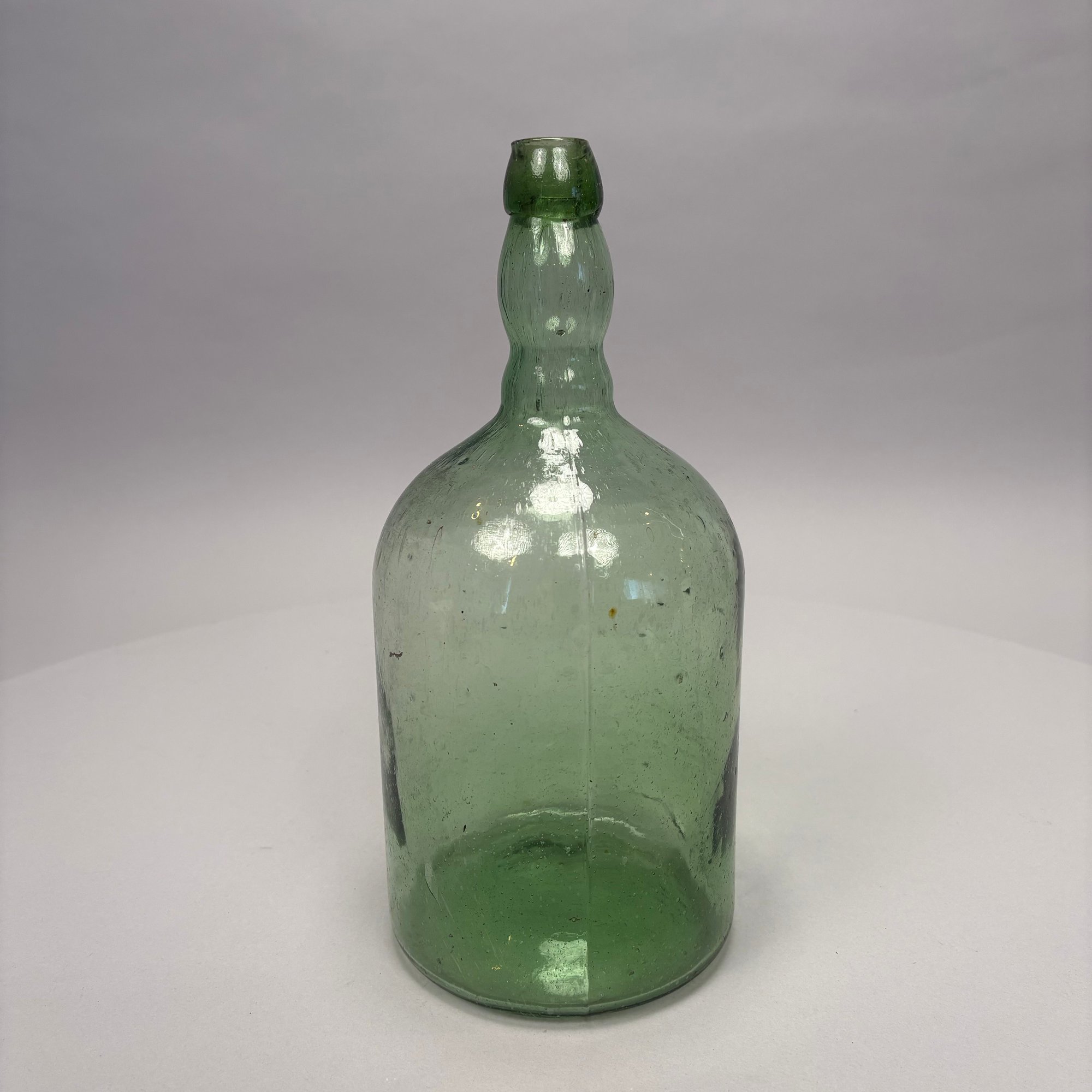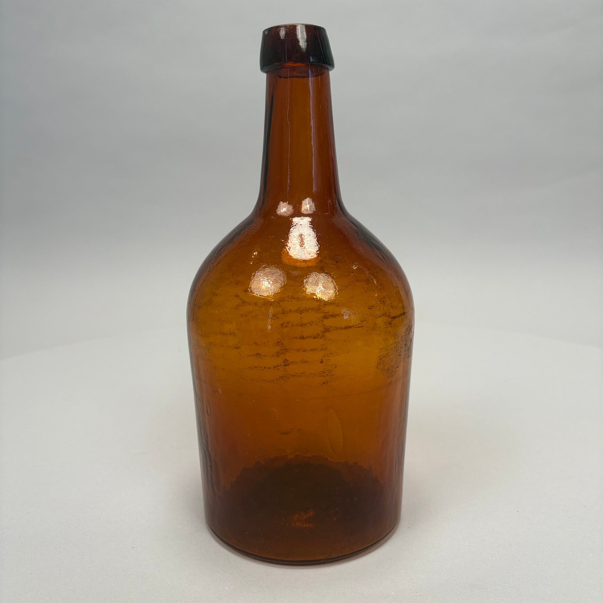 Three Blown Molded Glass Utilitarian Demijohn Bottles. In amber and two shades of green, the tallest molded "4 1/2."