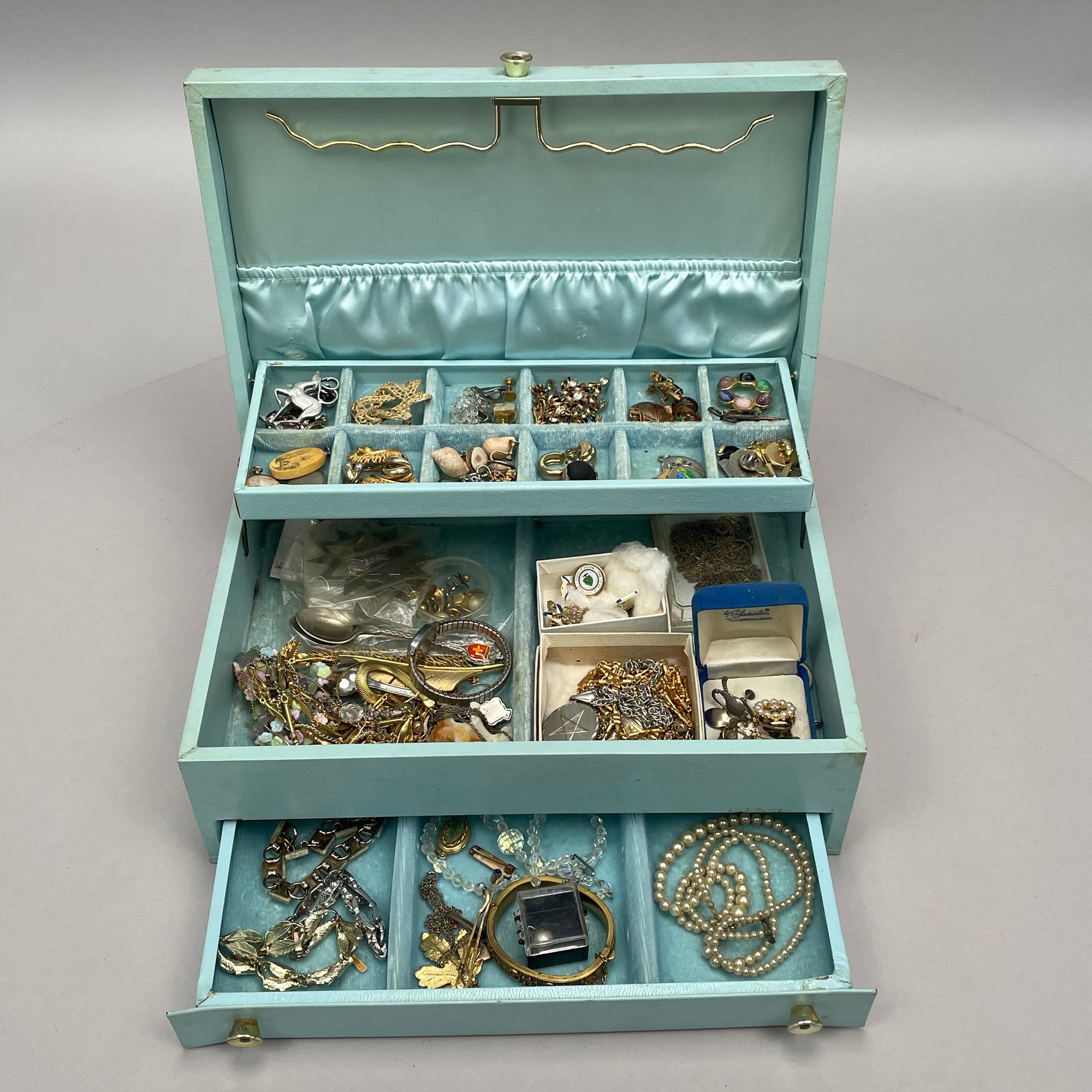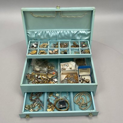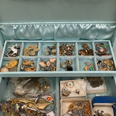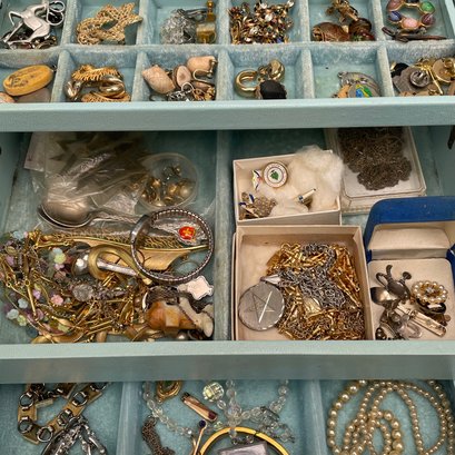 Three Boxes Containing Costume Jewelry. Comprising necklaces, bracelets, pins, hair ornaments, earrings and trinkets.