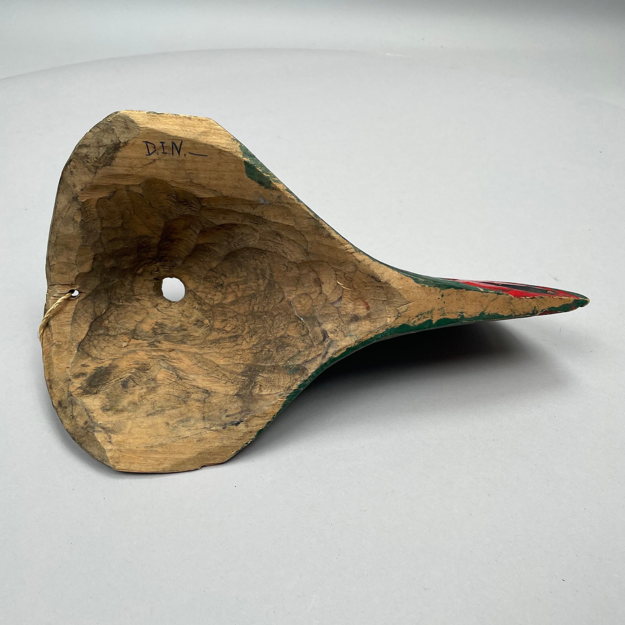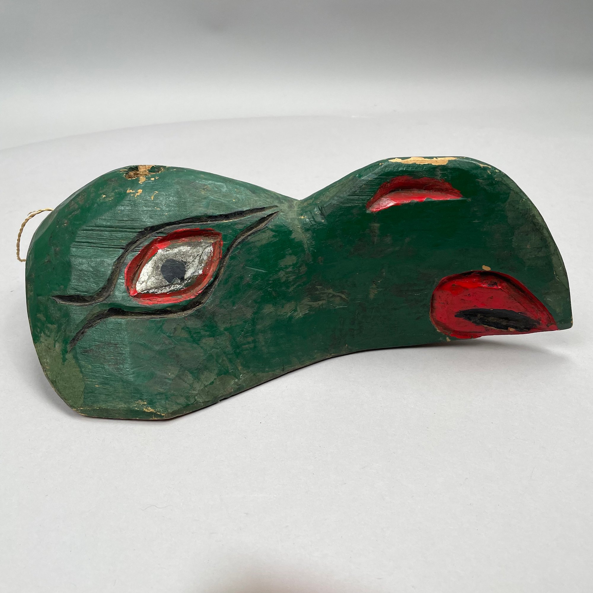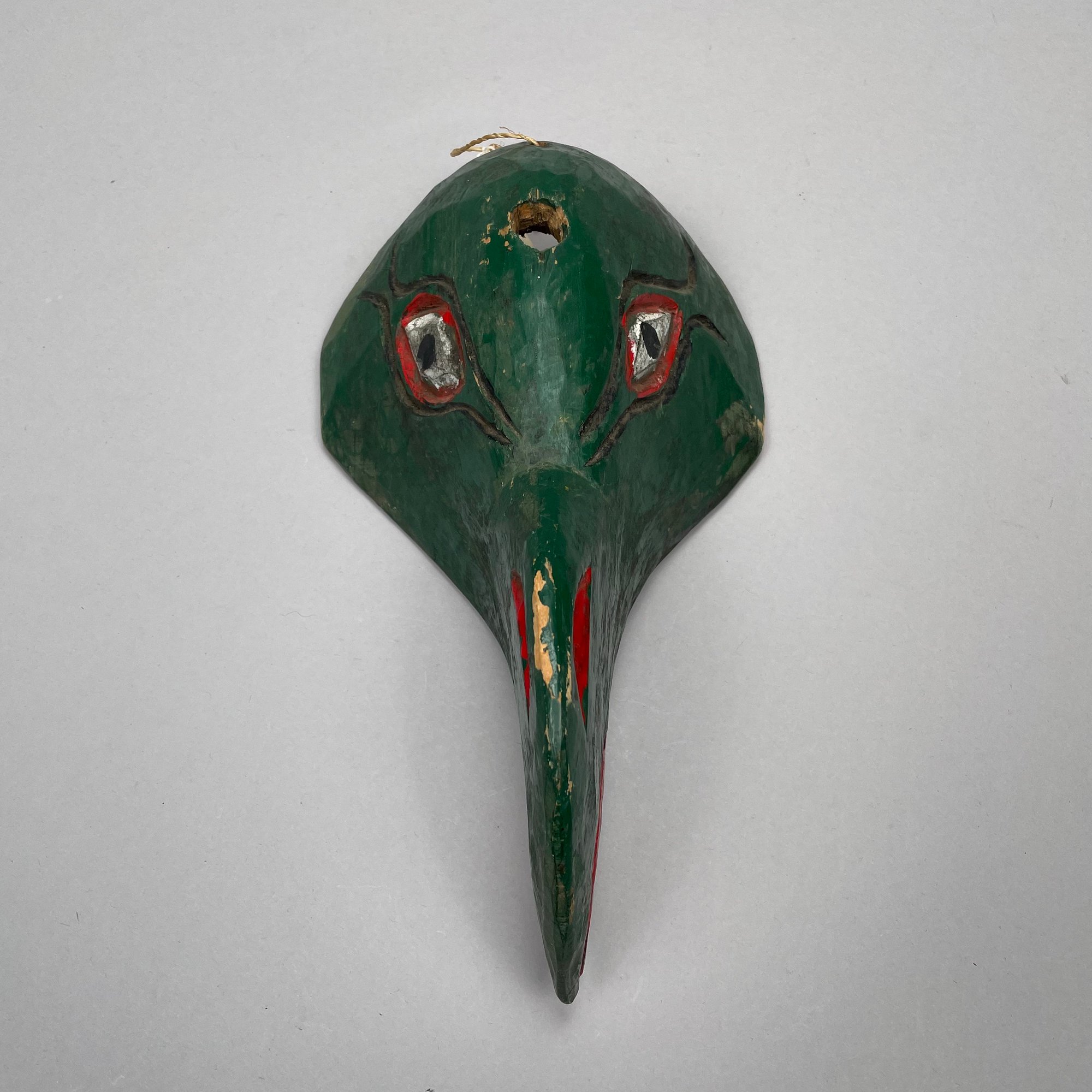 Green bird's head mask: H: 4.5 in., W: 12.25 in., D: 7 in.
