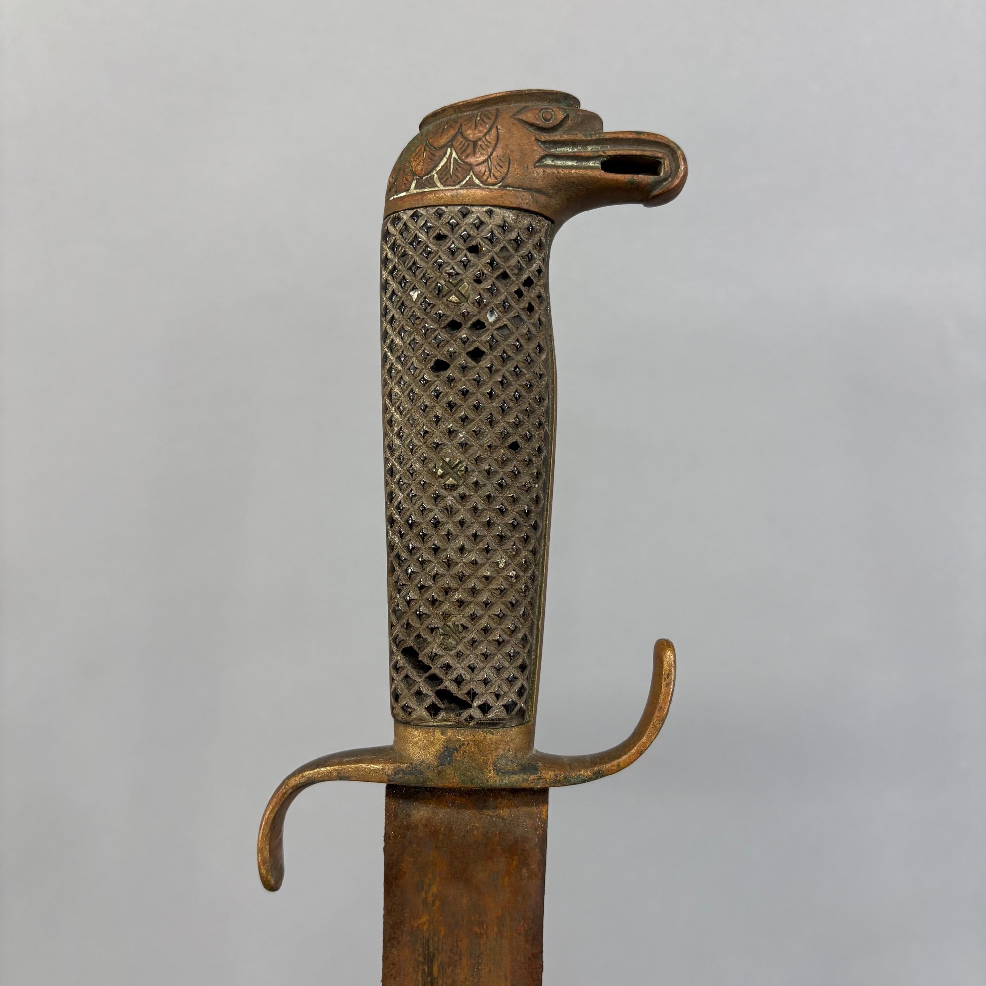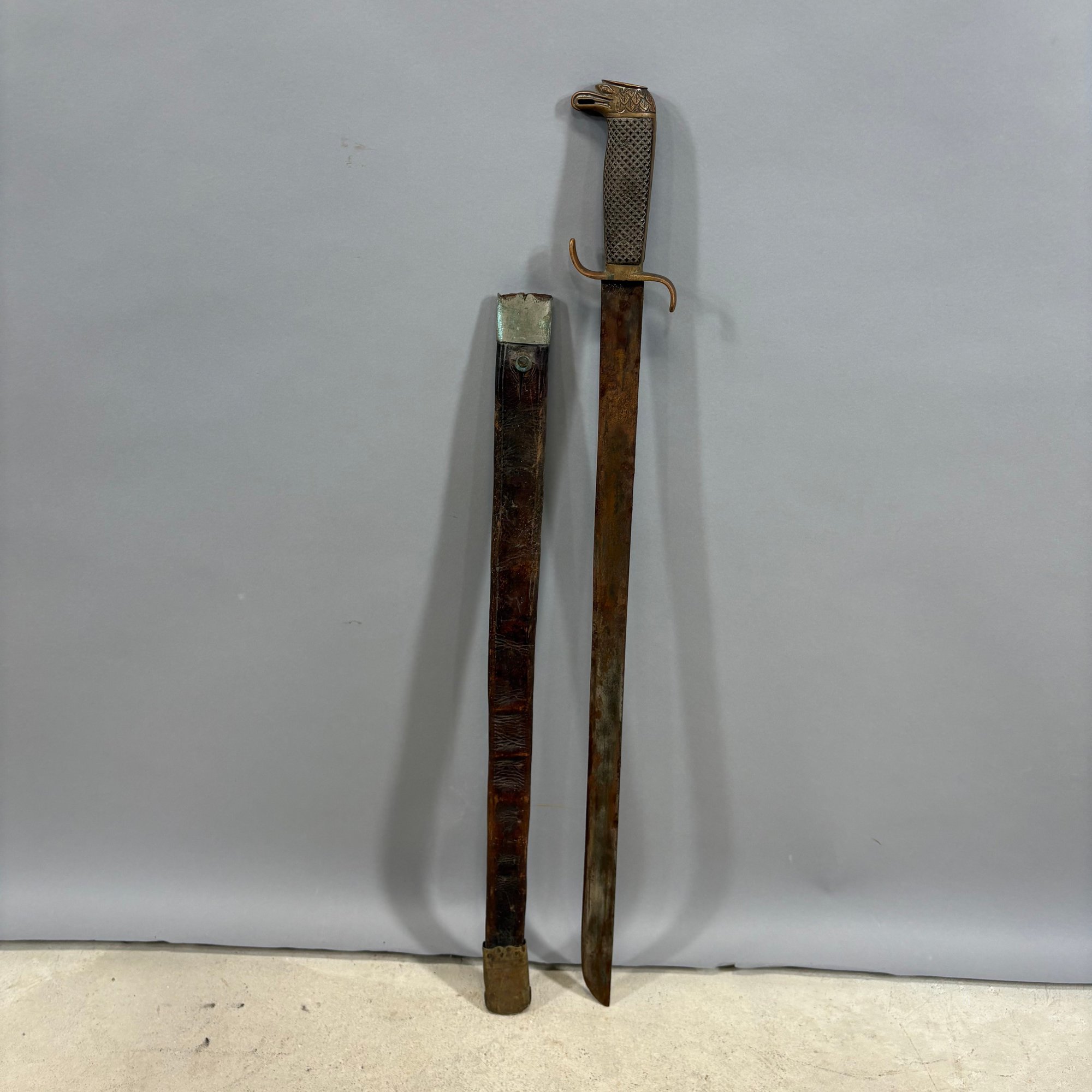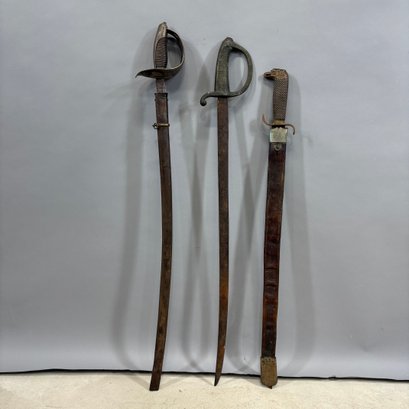 Three Continental Brass, Steel And Leather Swords. Comprising a European Briquet (Briquette), 19th Century, marked "No. 817" on the guard, worn number on the front of the grip; a Spanish "Eagle Pommel" machete with leather scabbard; and the third engraved with initials on the hilt, with scabbard.
