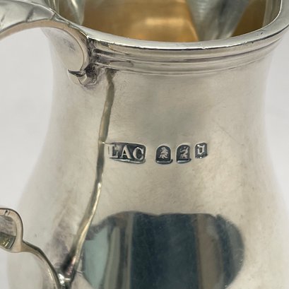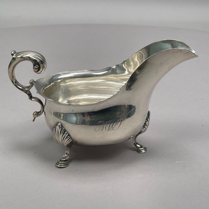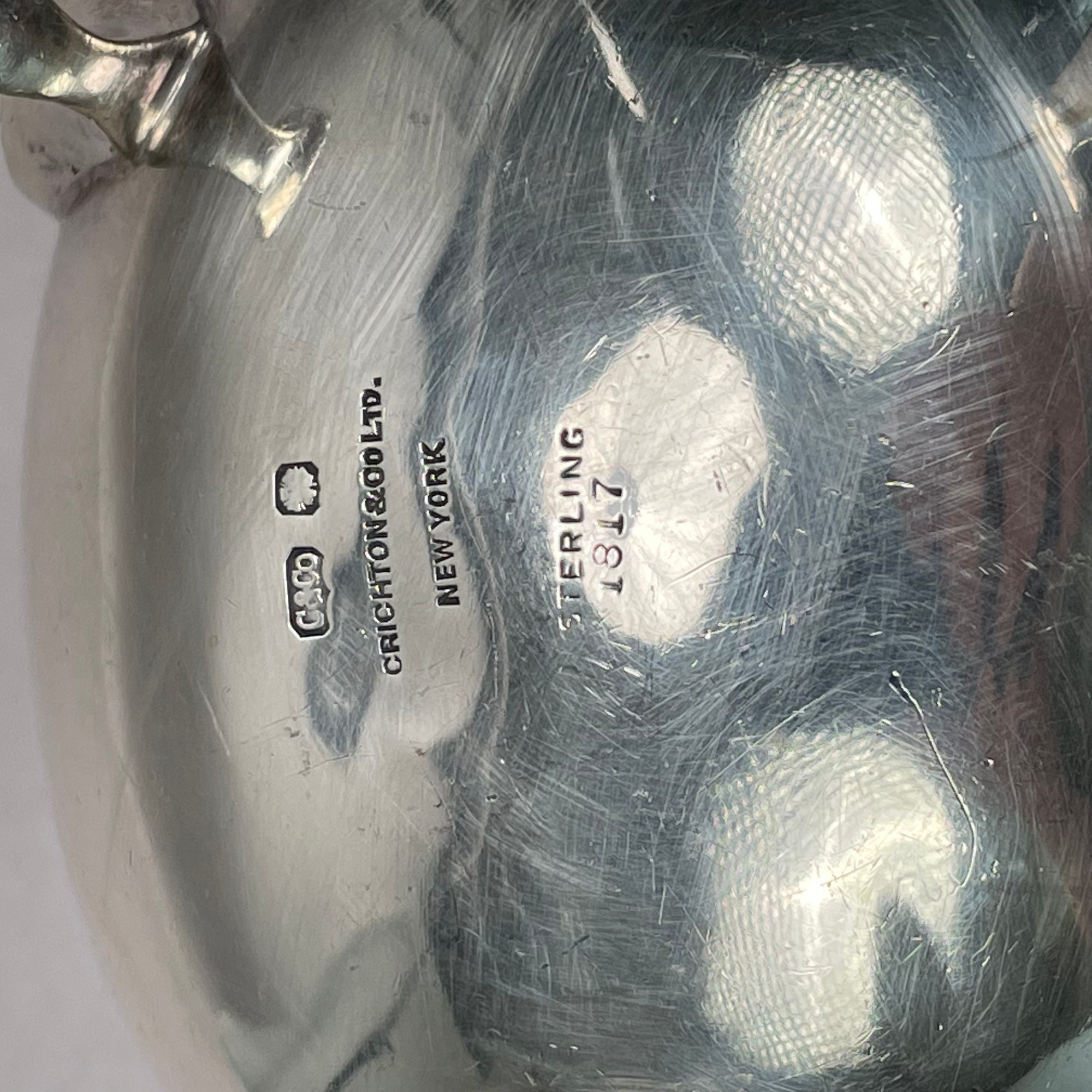 Three English and American Sterling Silver Tablewares, Twentieth Century. Comprising a George V Britannia cream pitcher, Crichton Bros., London, 1919; a sauceboat, Crichton & Co., Ltd., New York, engraved initials "MWT;" and an individual coffeepot , Poole Silver Co., Taunton, Massachusetts, engraved initials "MRC," all marked.