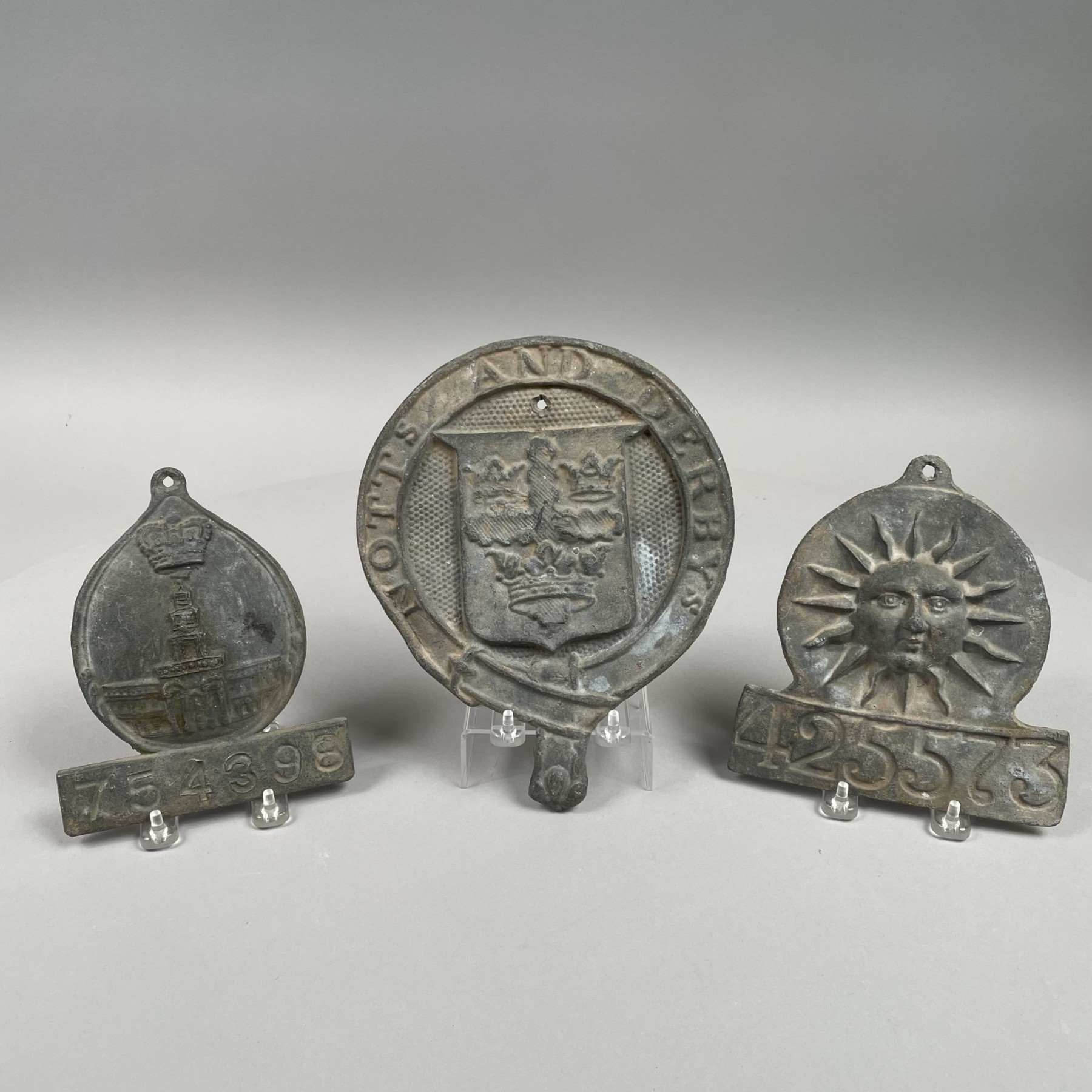 Comprising a "NOTTS AND DERBYS" fire mark with coat-of-arms, a N. 754398 Royal Exchange Assurance fire mark, and a N. 425773 Sun Insurance fire mark.
