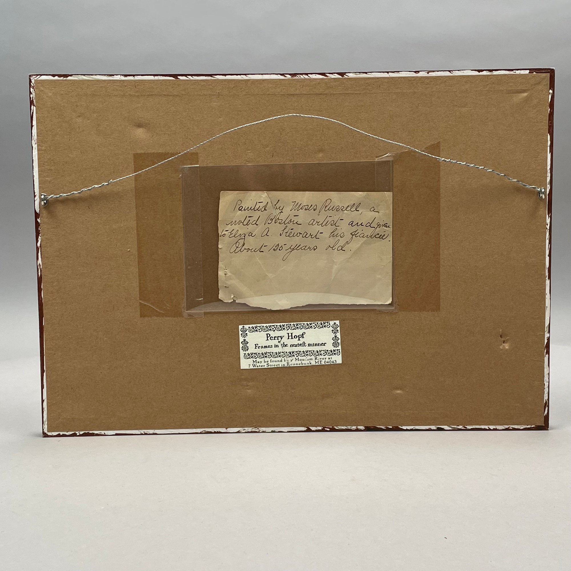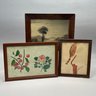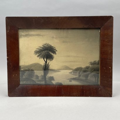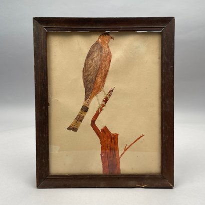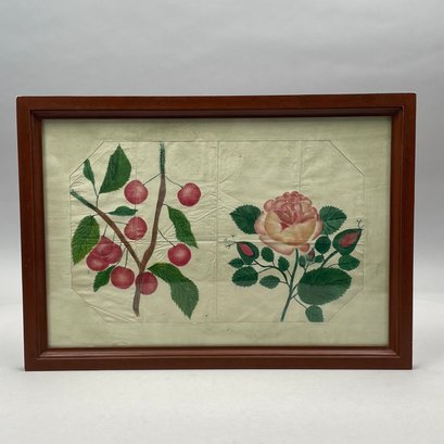 Three Folk Art Watercolor and Sand Paintings, Nineteenth Century, Comprising a painting of a hawk, possibly Pennsylvania; a double painting of a cherry branch and a rose stem, Moses Russell; and a sand painting depicting a river landscape, anonymous.