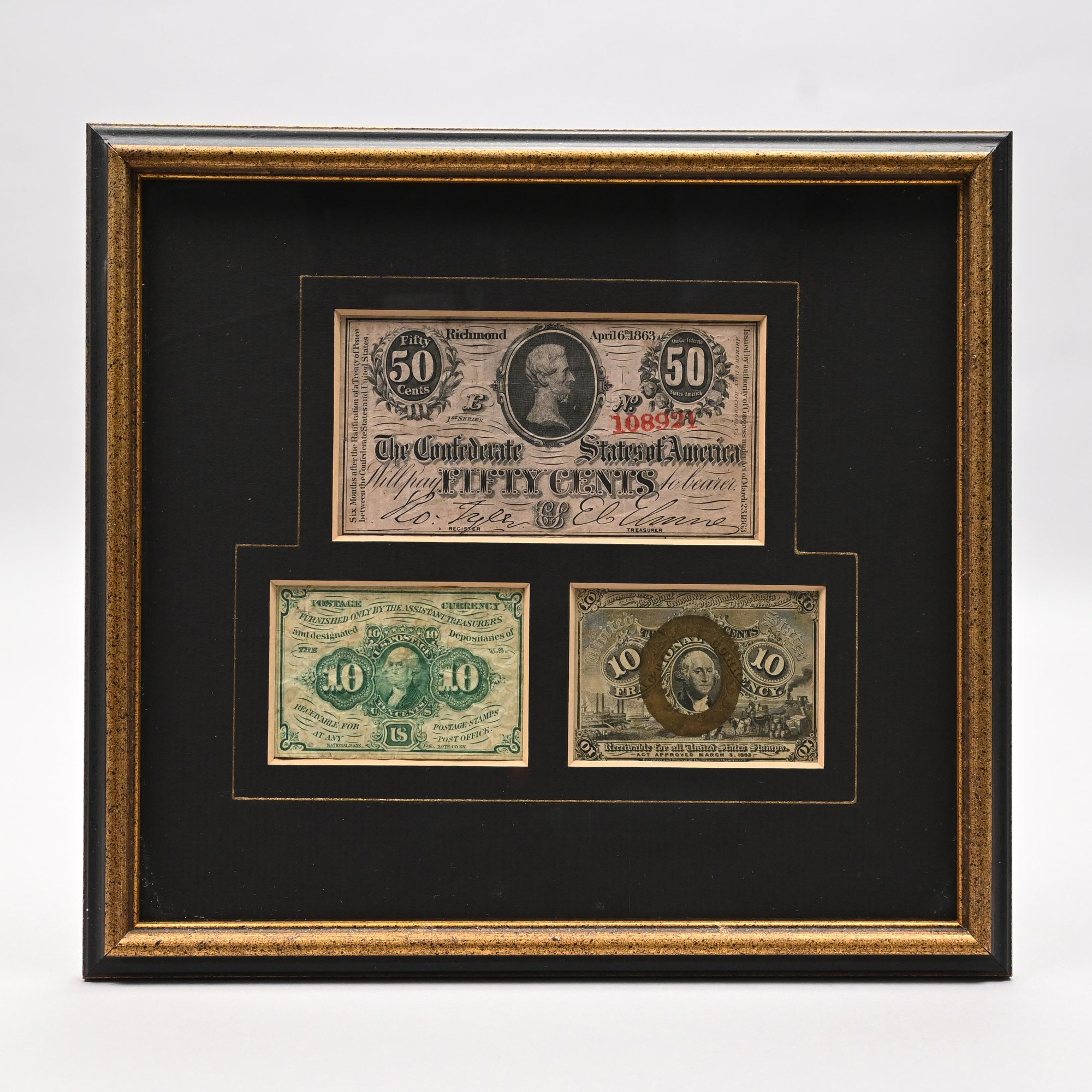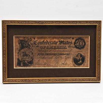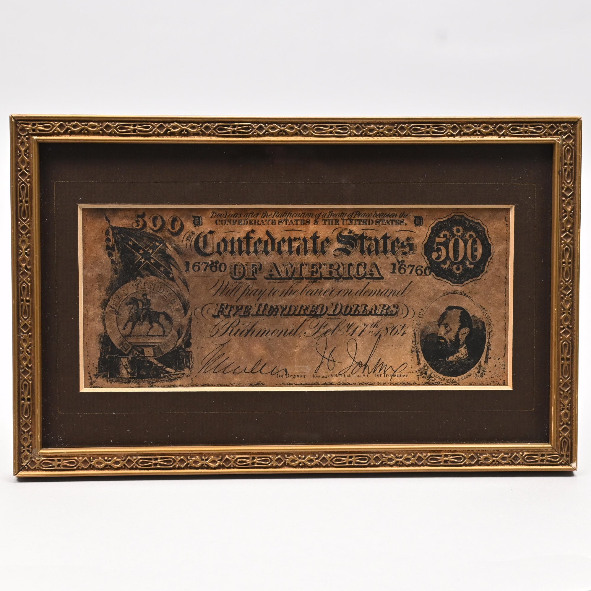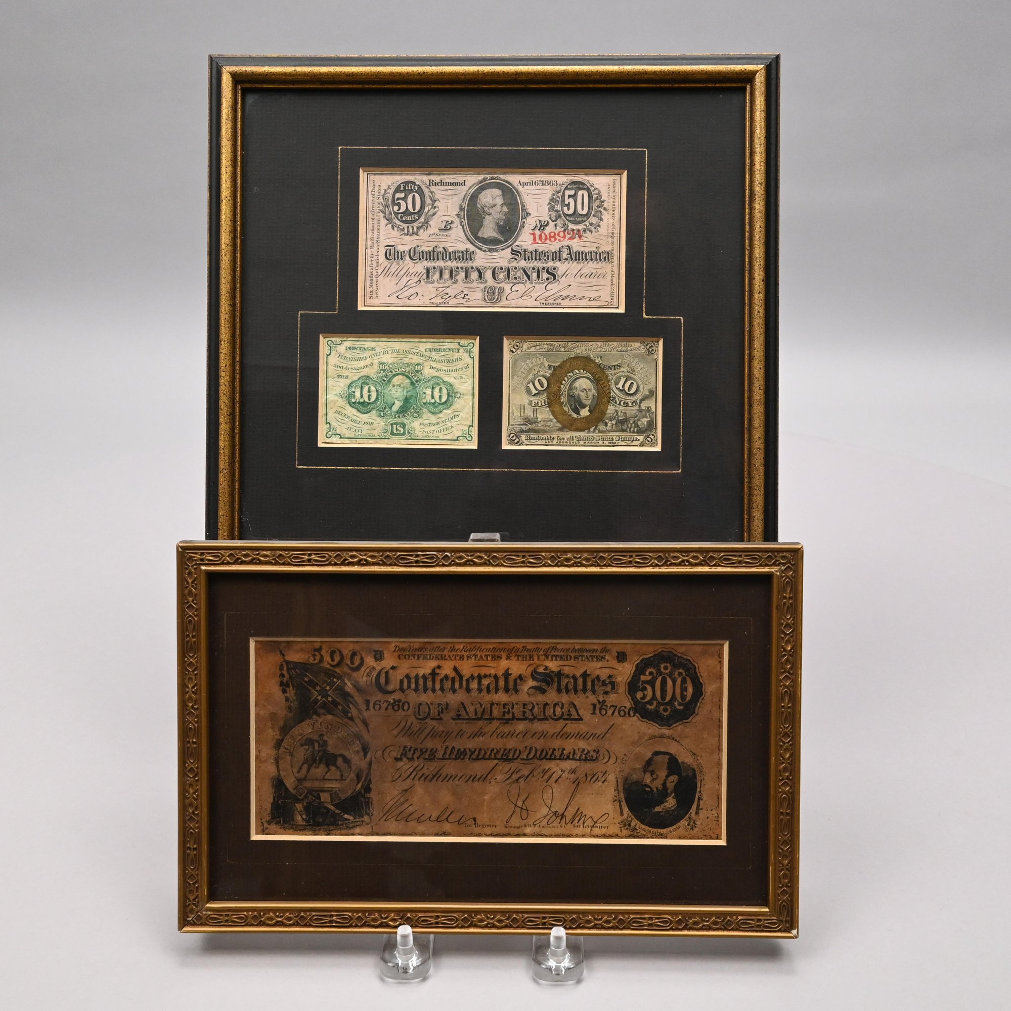 Three Framed Fractorial Currencies and a Reproduction Confederate $500.00 Note.