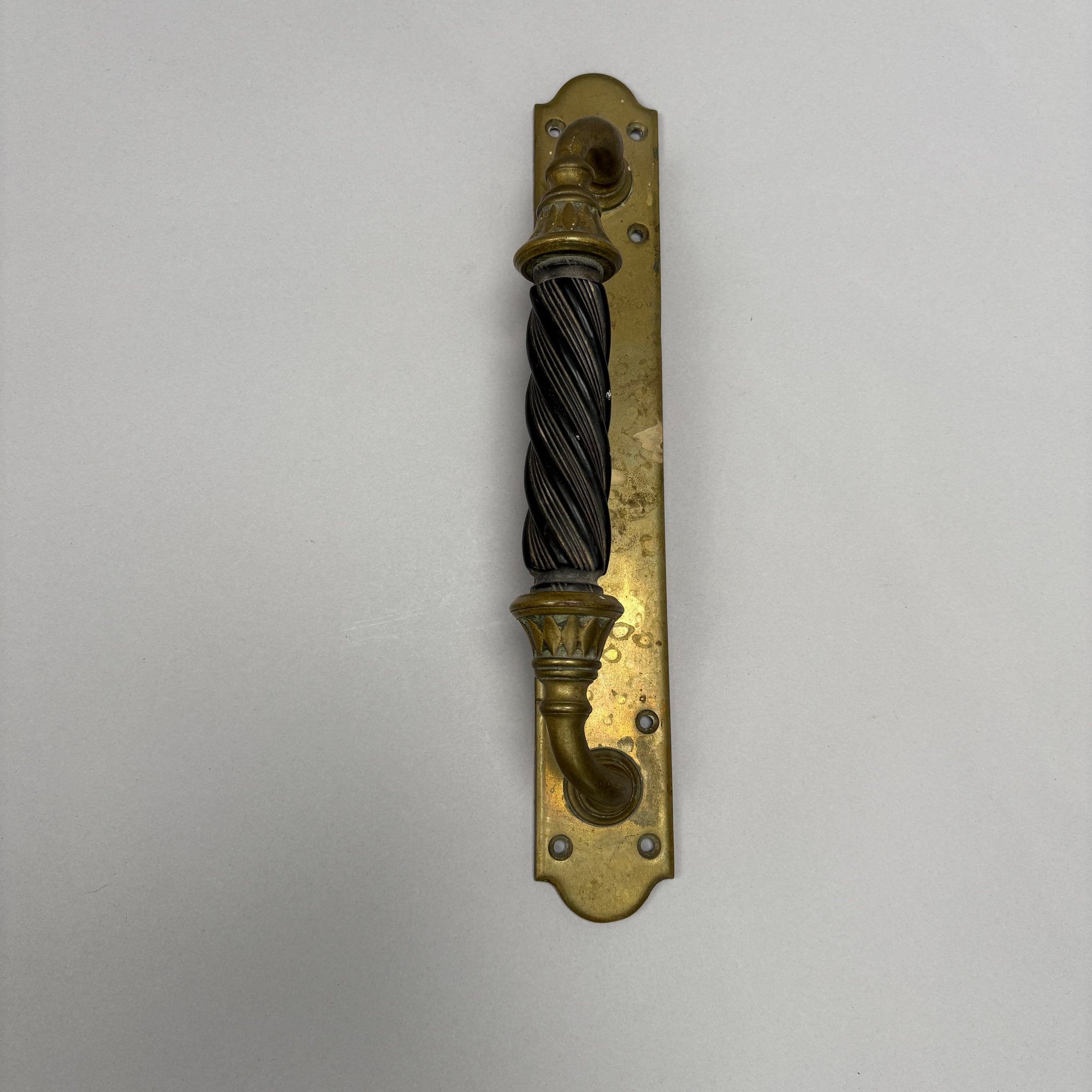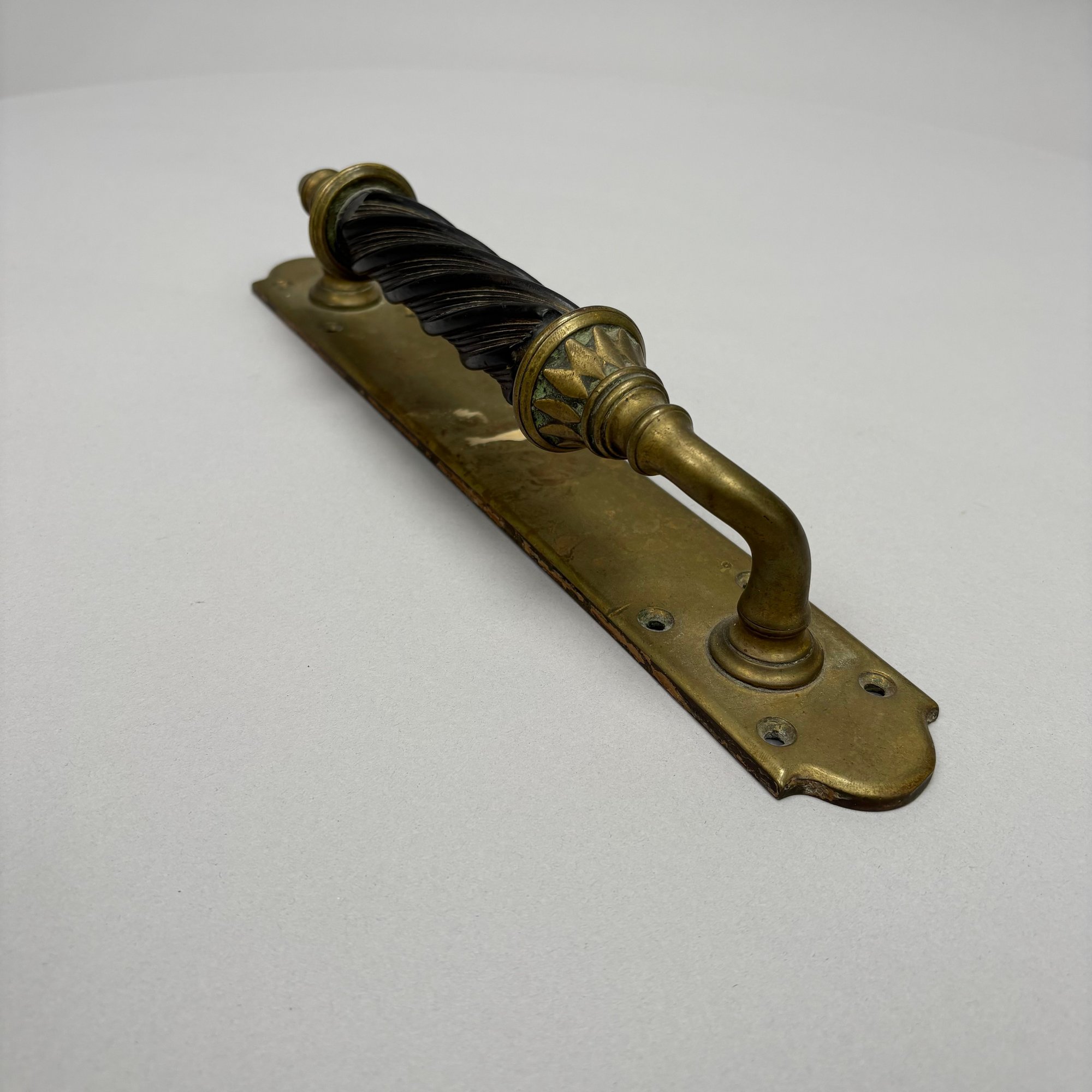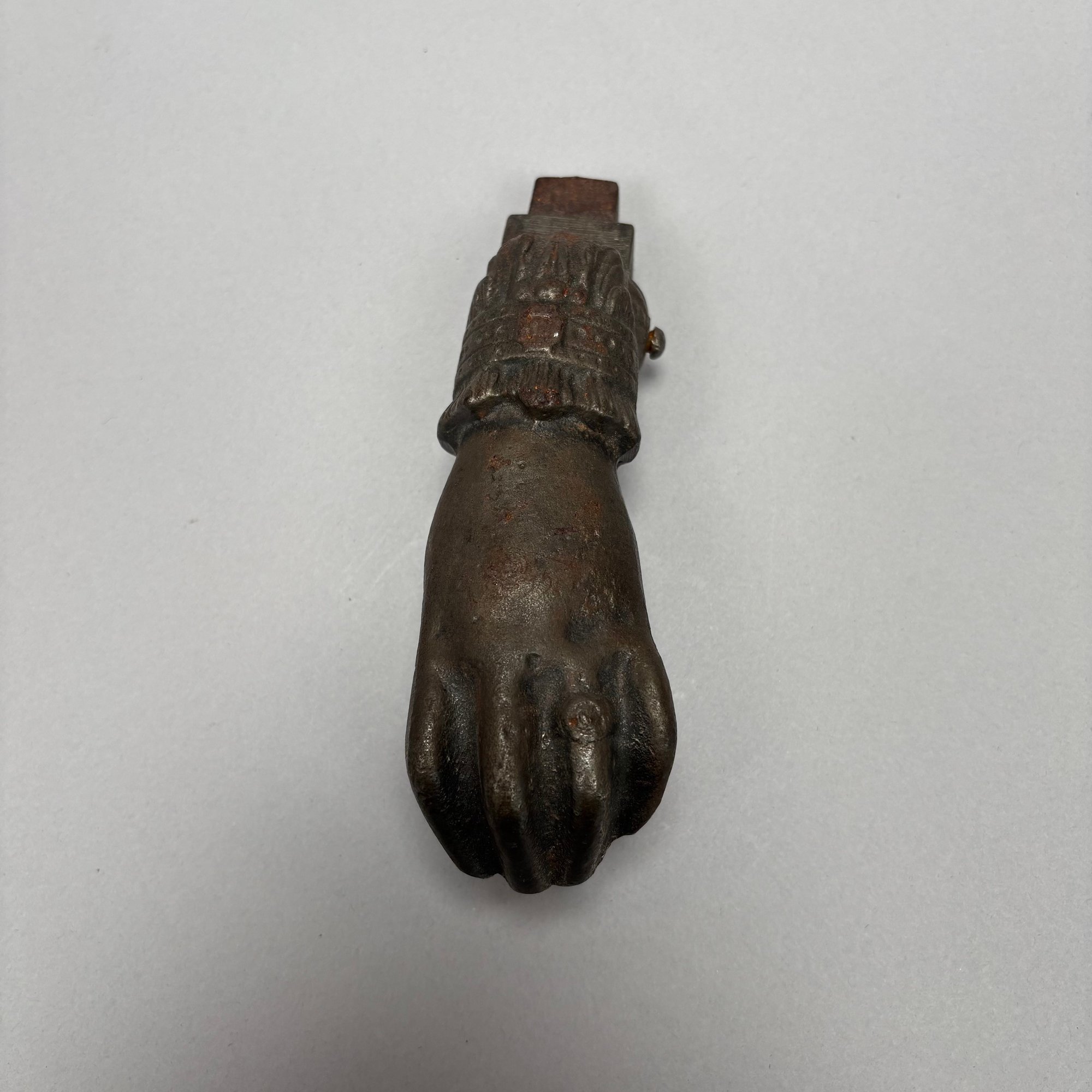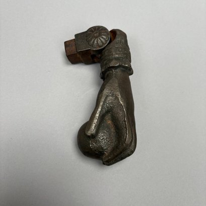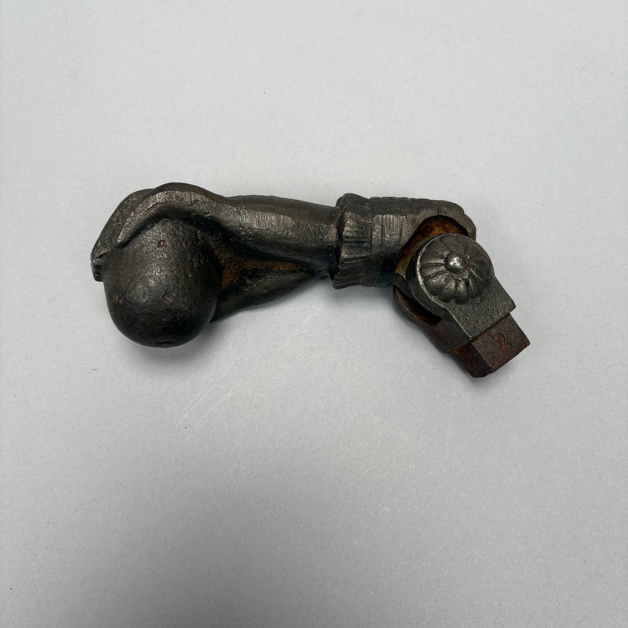 Three Household Brass and Iron Salvage Items, Late 19th-Early 20th Century. Comprising a hand-form door knocker, a door handle with plate and a spigot.