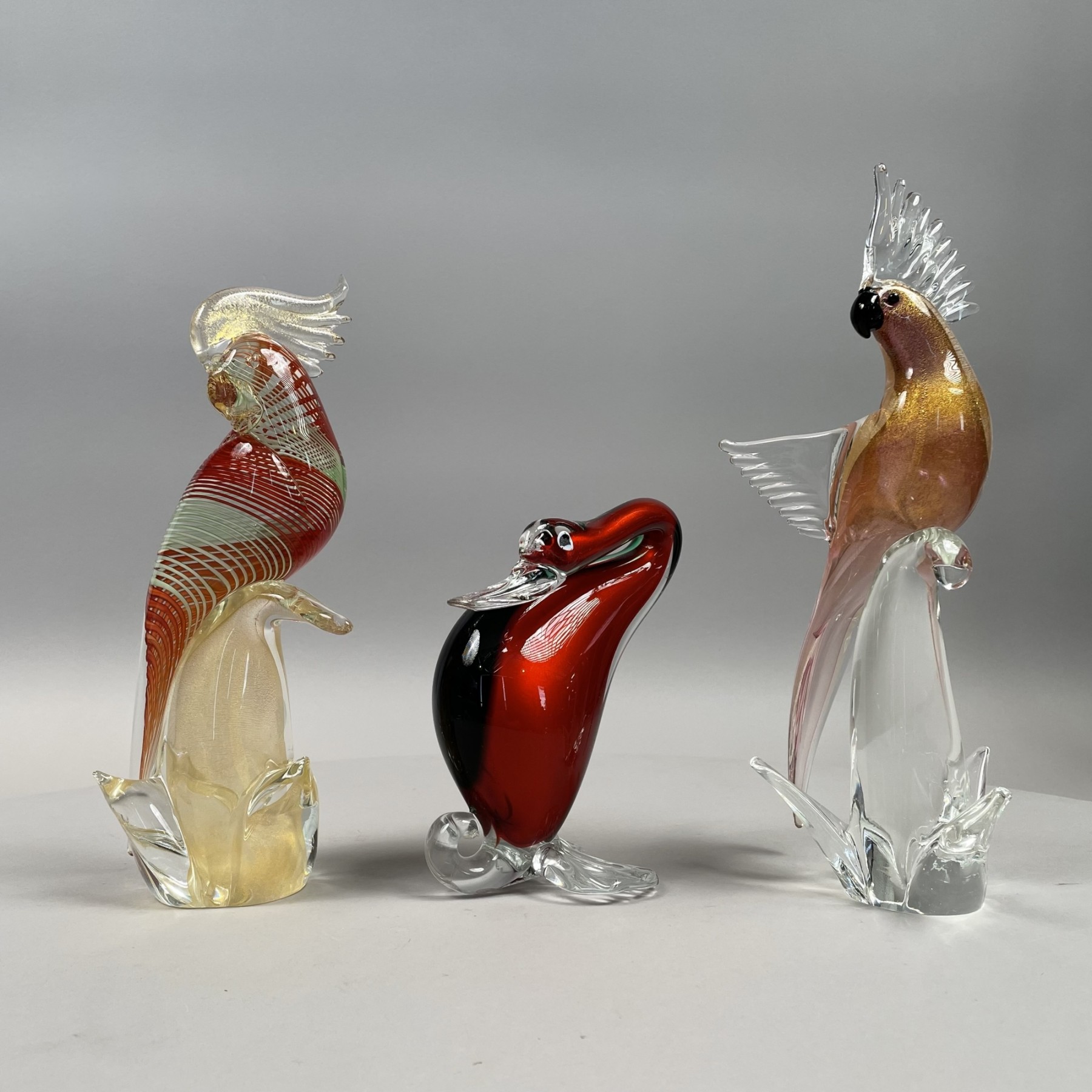 Comprising a pink and gold-flecked cockatoo, engraved "W. MITZAK VENICE 1994" under the base; a Murano red, white and gold-flecked cockatoo, affixed with a "Murano MADE IN ITALY VENEZIA" silver sticker; and a red and black bird, Jordan's Importing Co., 1950's, affixed with a silver label marked "MADE IN ITALY, VENETIAN, J.I. Co."