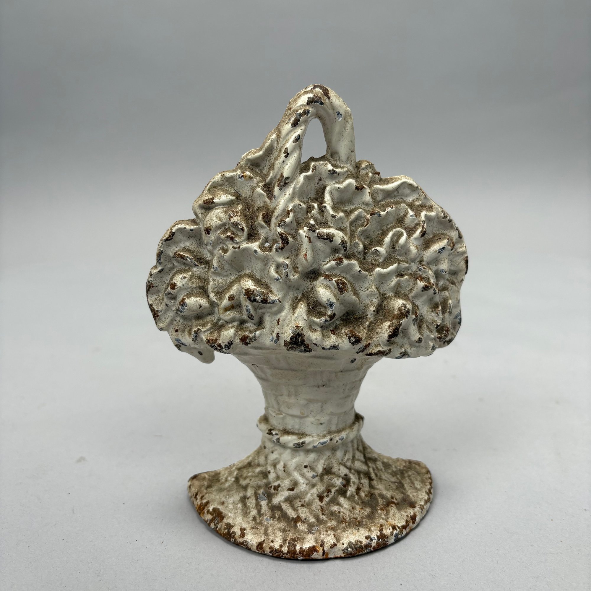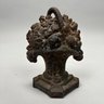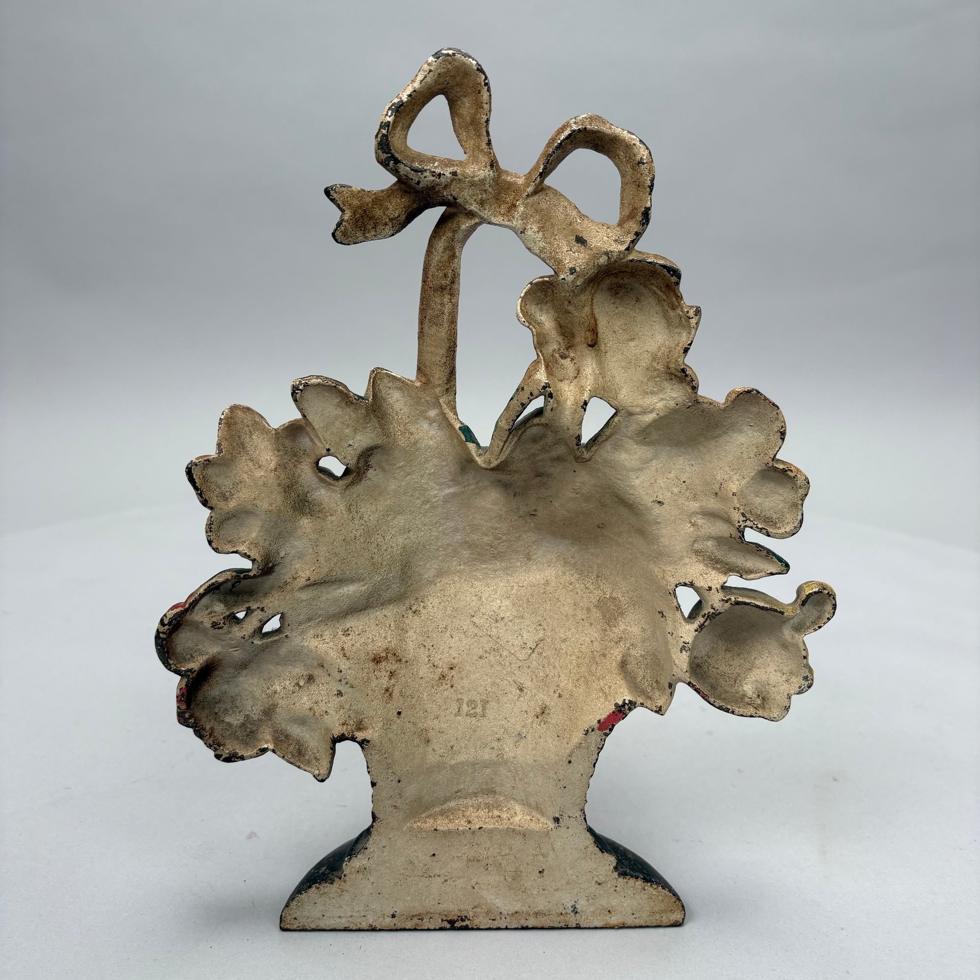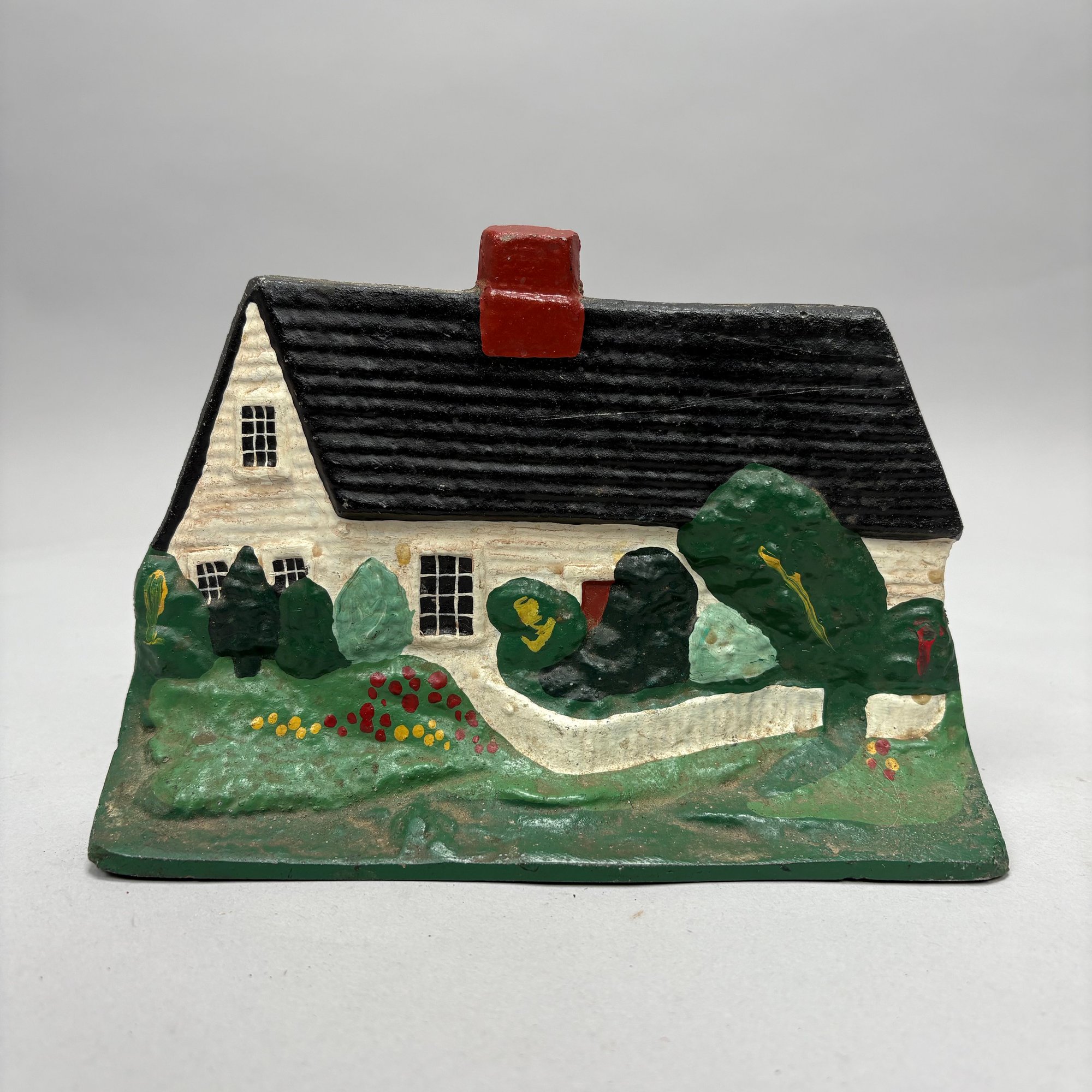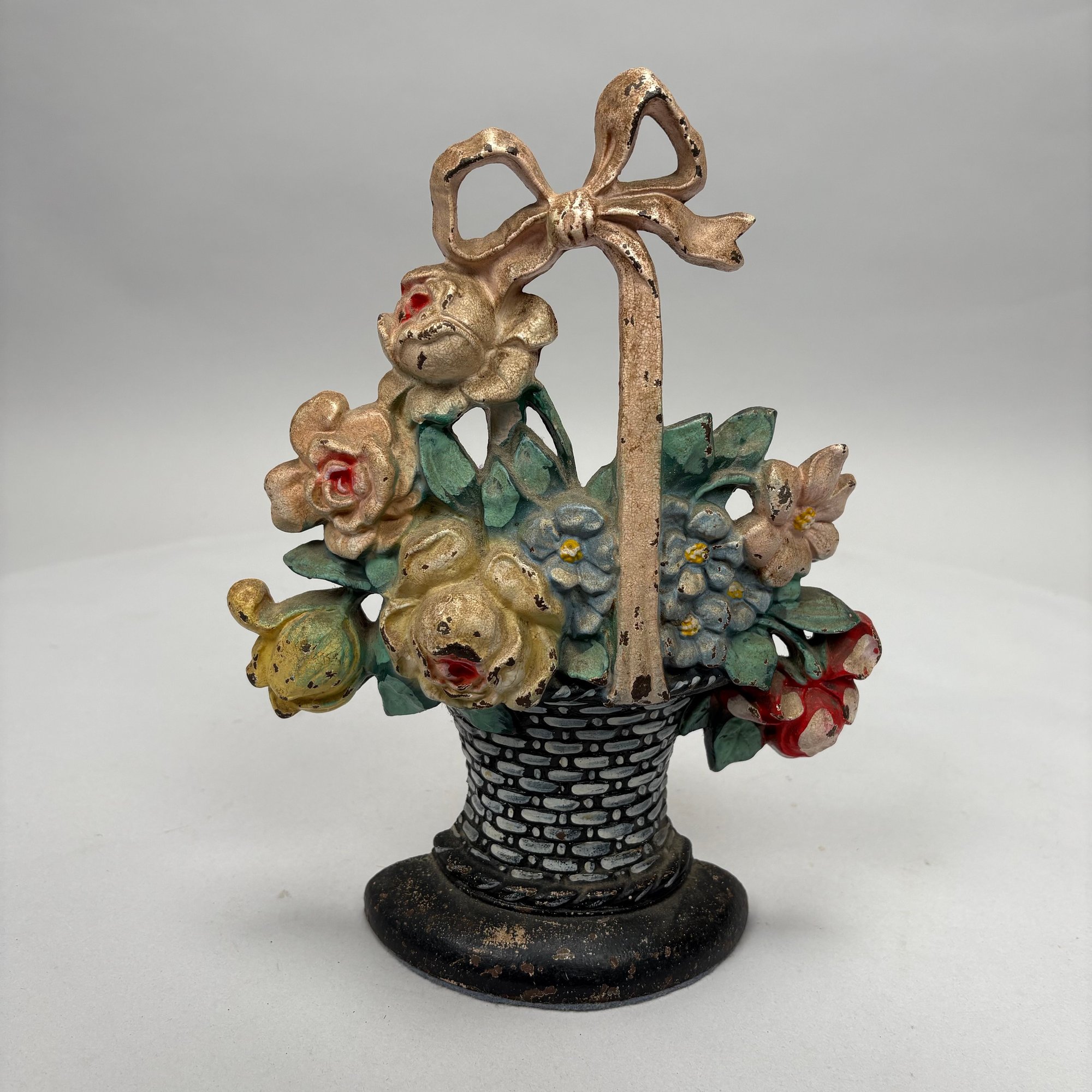 Three Painted Cast-Iron Floral Doorstops and Two Cottage Doorstops, 20th Century. Comprising a basket of roses and mixed flowers, Hubley Mfg. Co., Lancaster, Pennsylvania, Albany Foundry Co., Van Rensselaer Island, Albany, New York or National Foundry, Whitman, Massachusetts; a basket of flowers and fruit, cast numeral "5;" a basket of flowers, cast mark "FAROY/ 1001;" and two cottages.