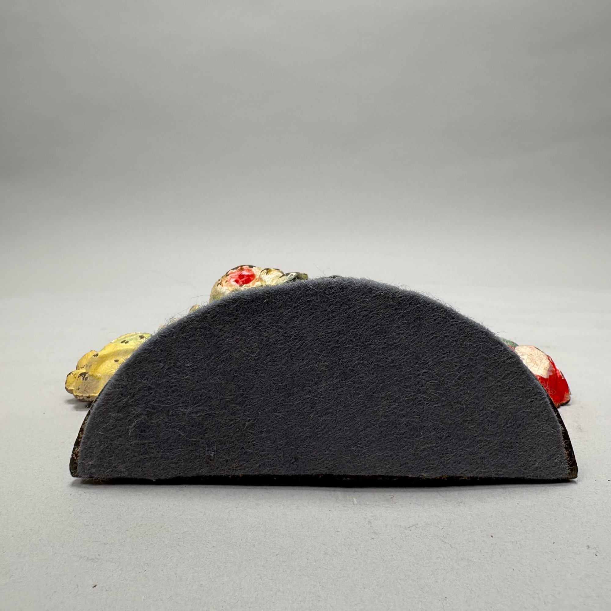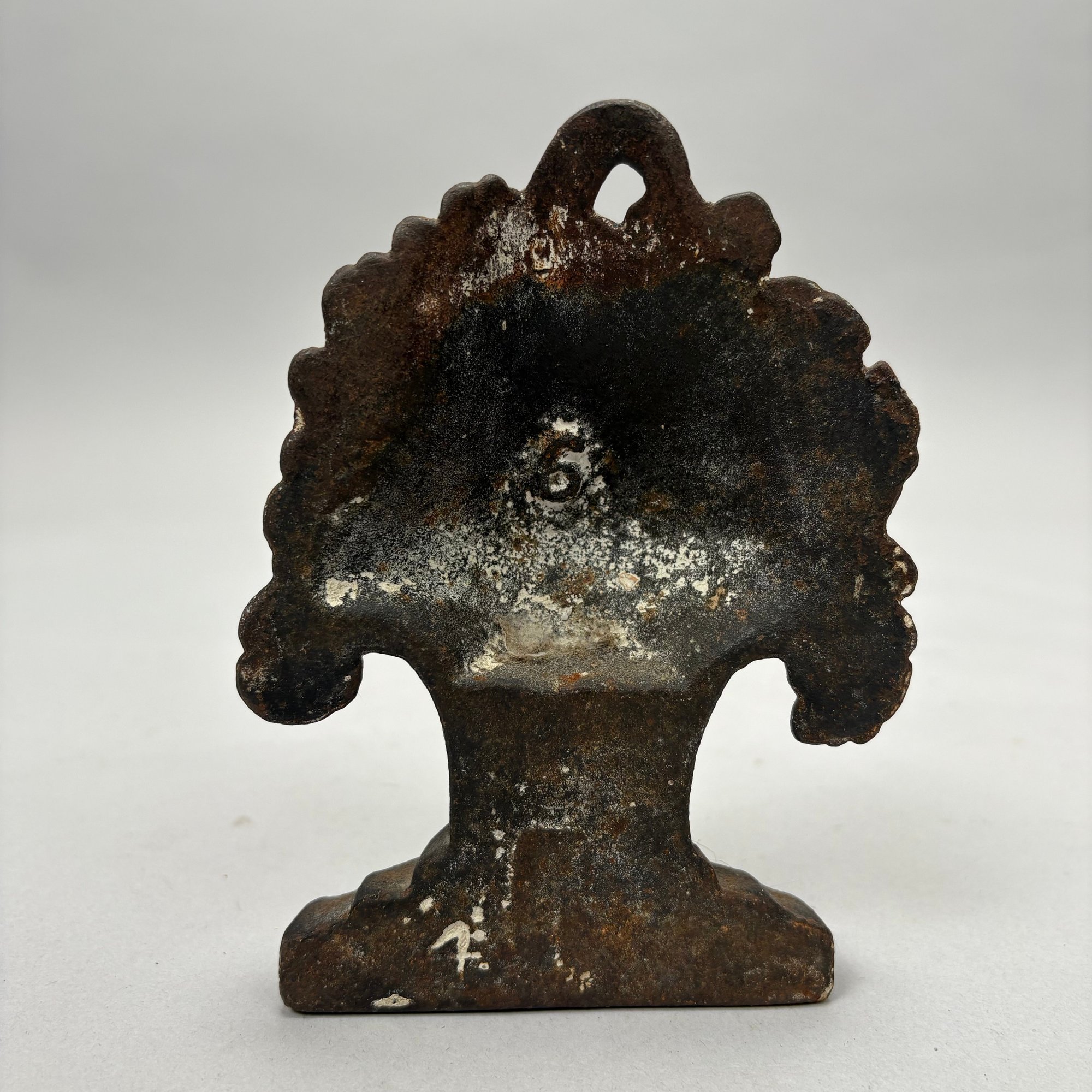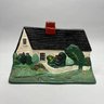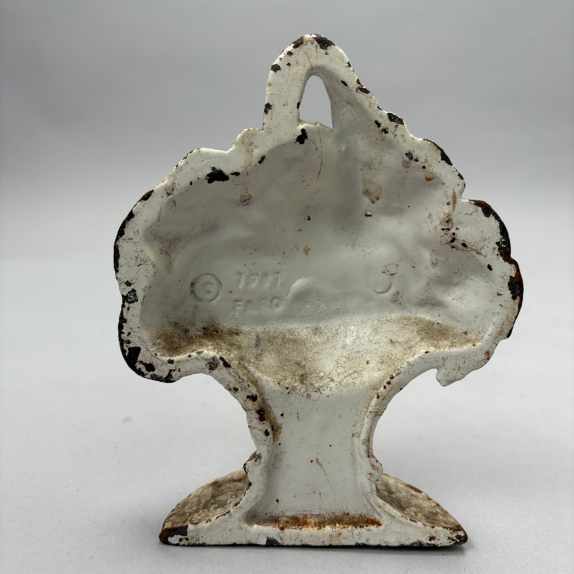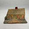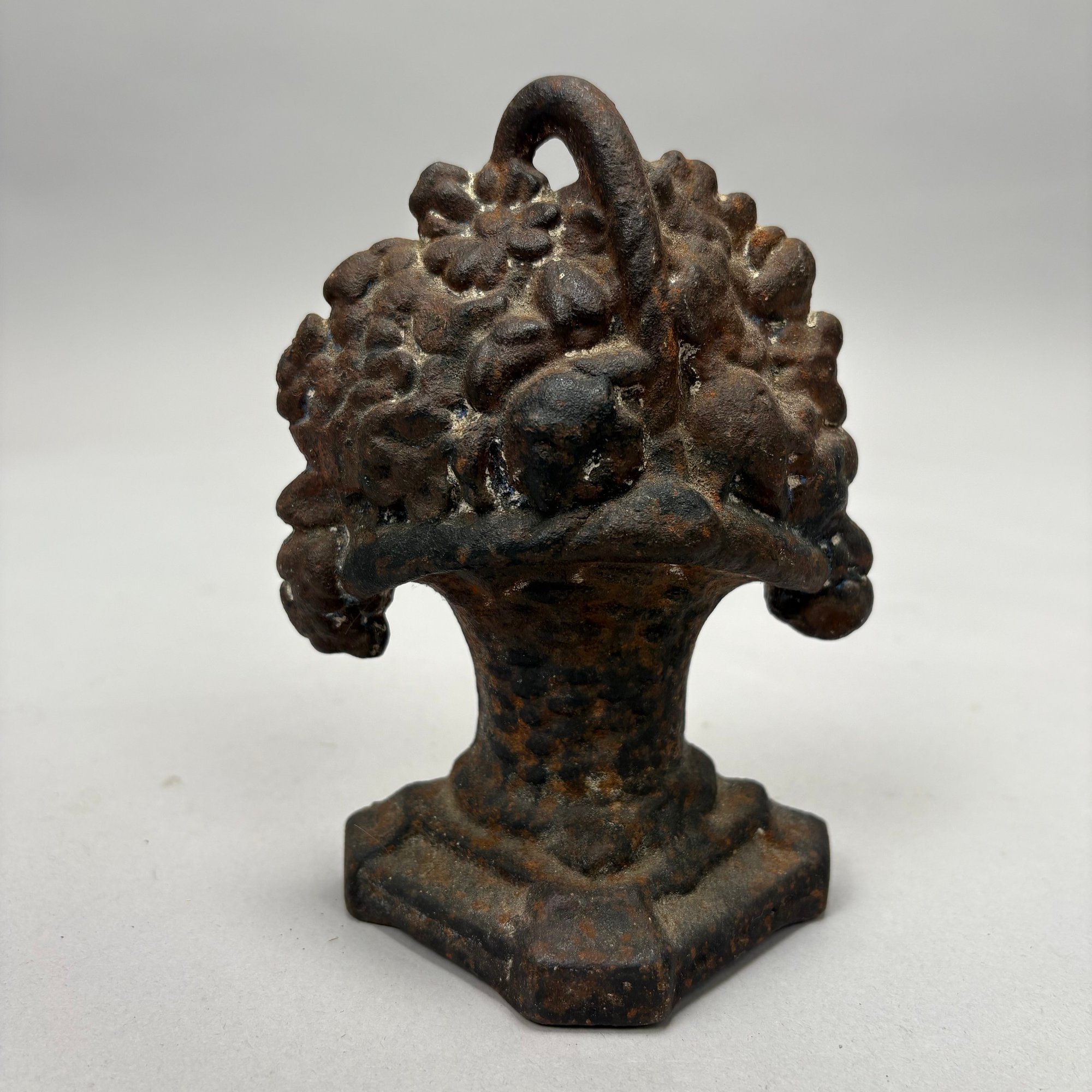 Three Painted Cast-Iron Floral Doorstops and Two Cottage Doorstops, 20th Century. Comprising a basket of roses and mixed flowers, Hubley Mfg. Co., Lancaster, Pennsylvania, Albany Foundry Co., Van Rensselaer Island, Albany, New York or National Foundry, Whitman, Massachusetts; a basket of flowers and fruit, cast numeral "5;" a basket of flowers, cast mark "FAROY/ 1001;" and two cottages.