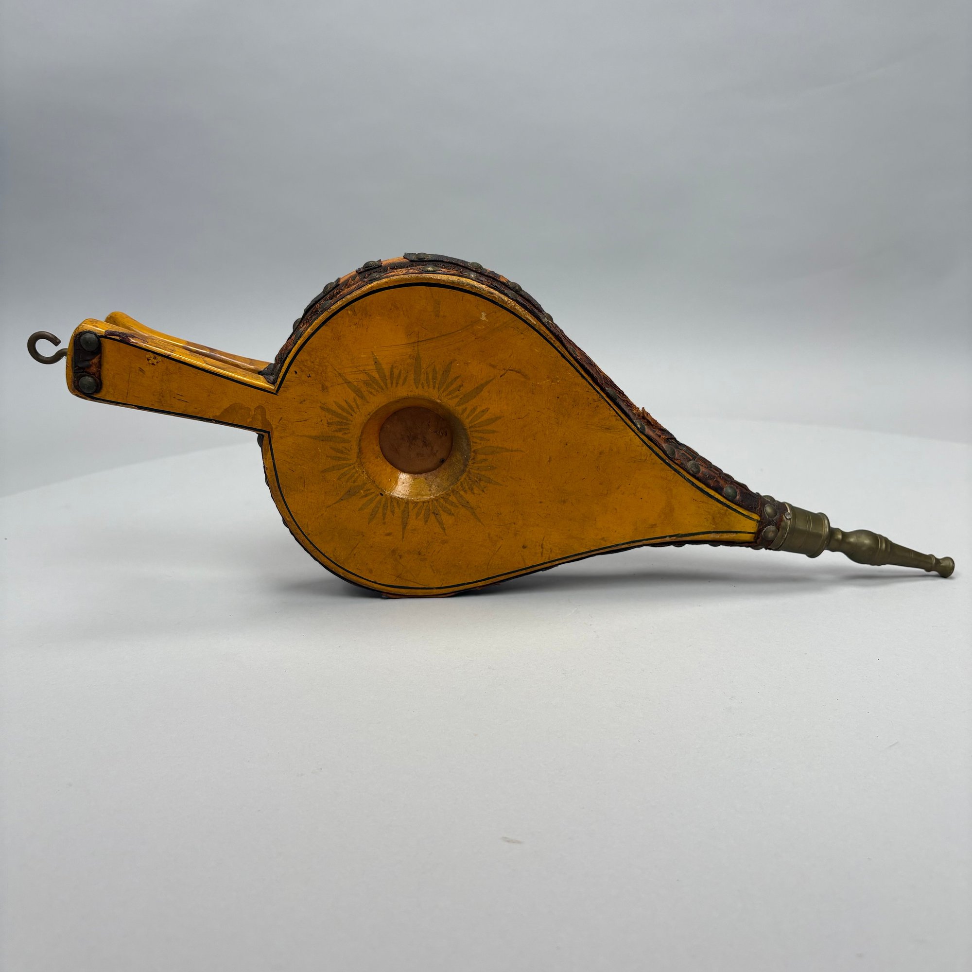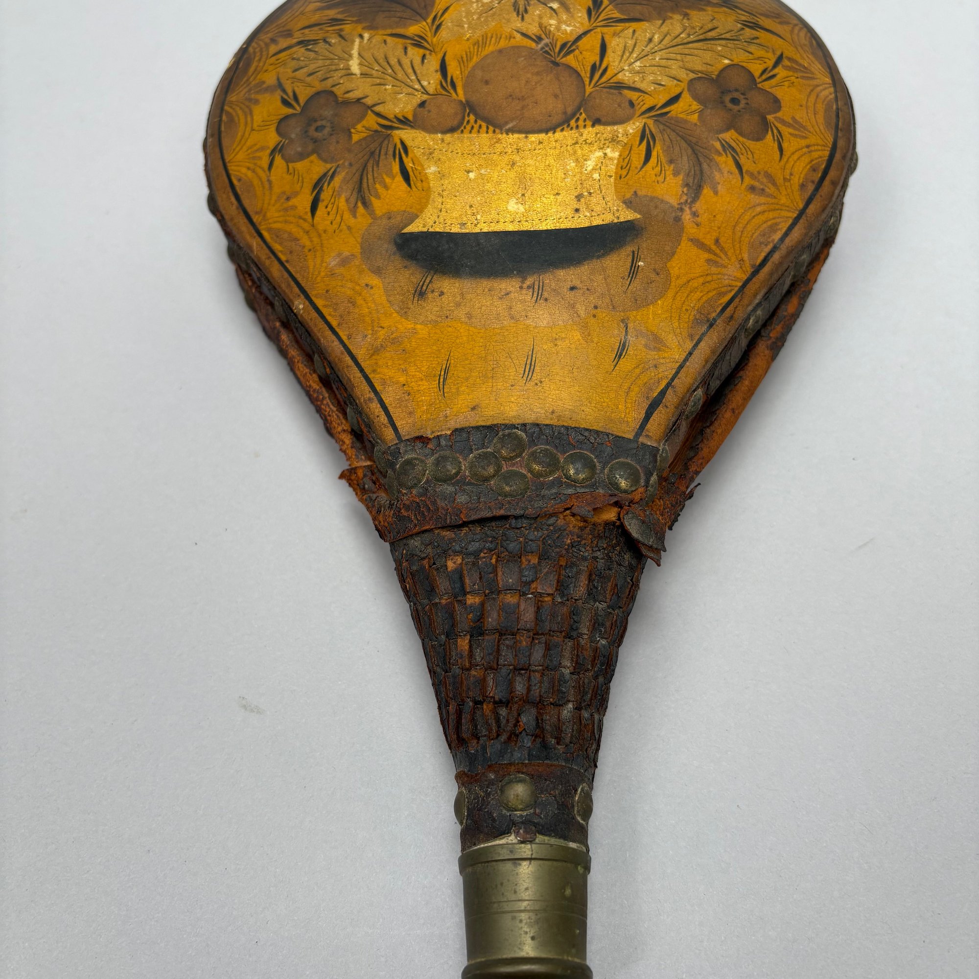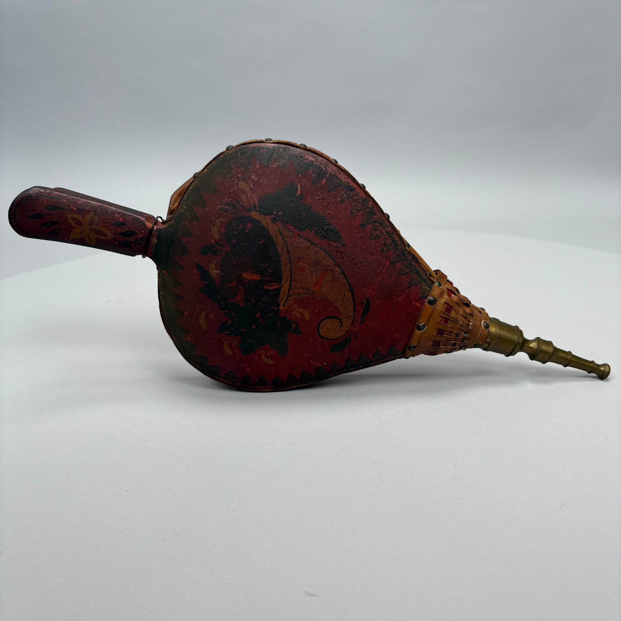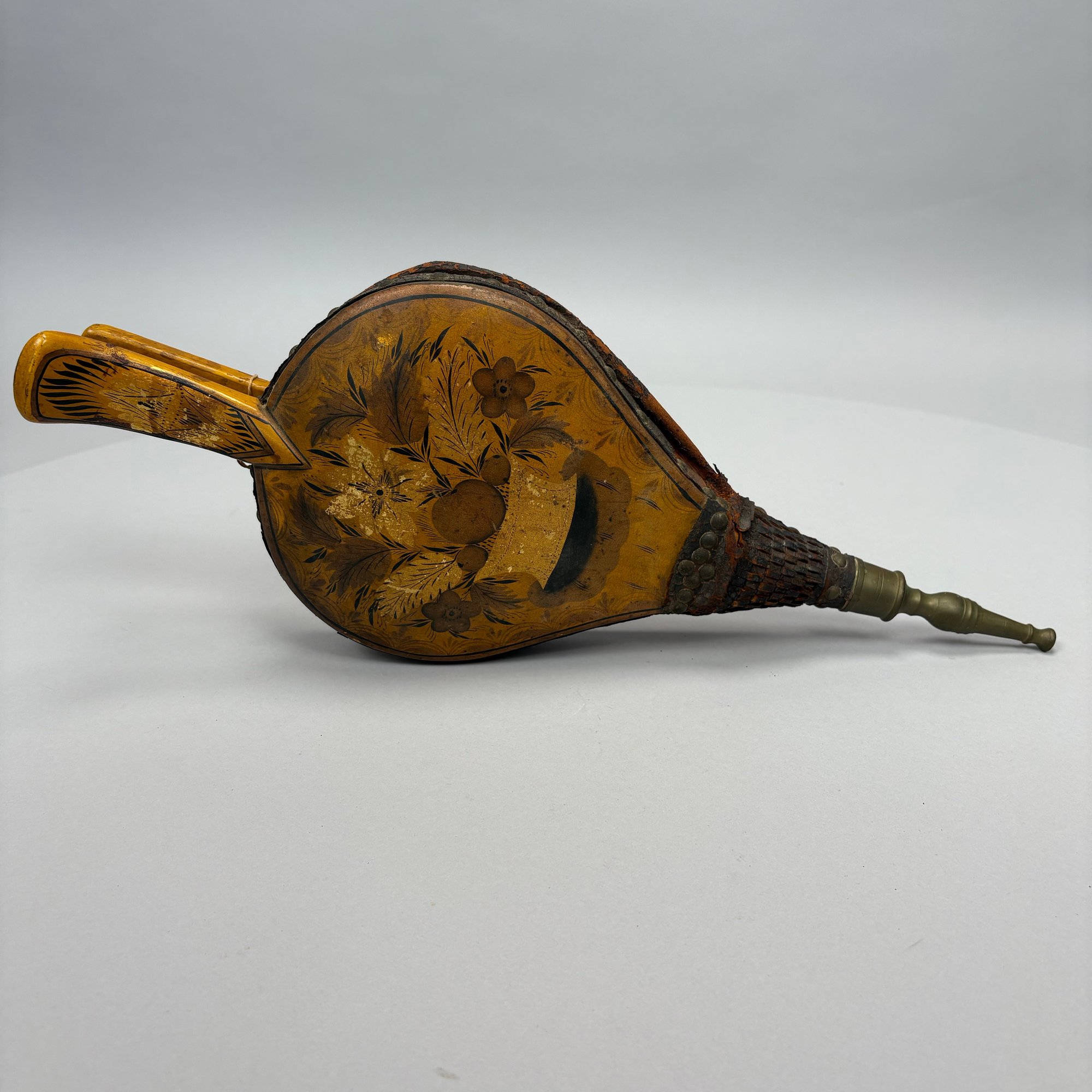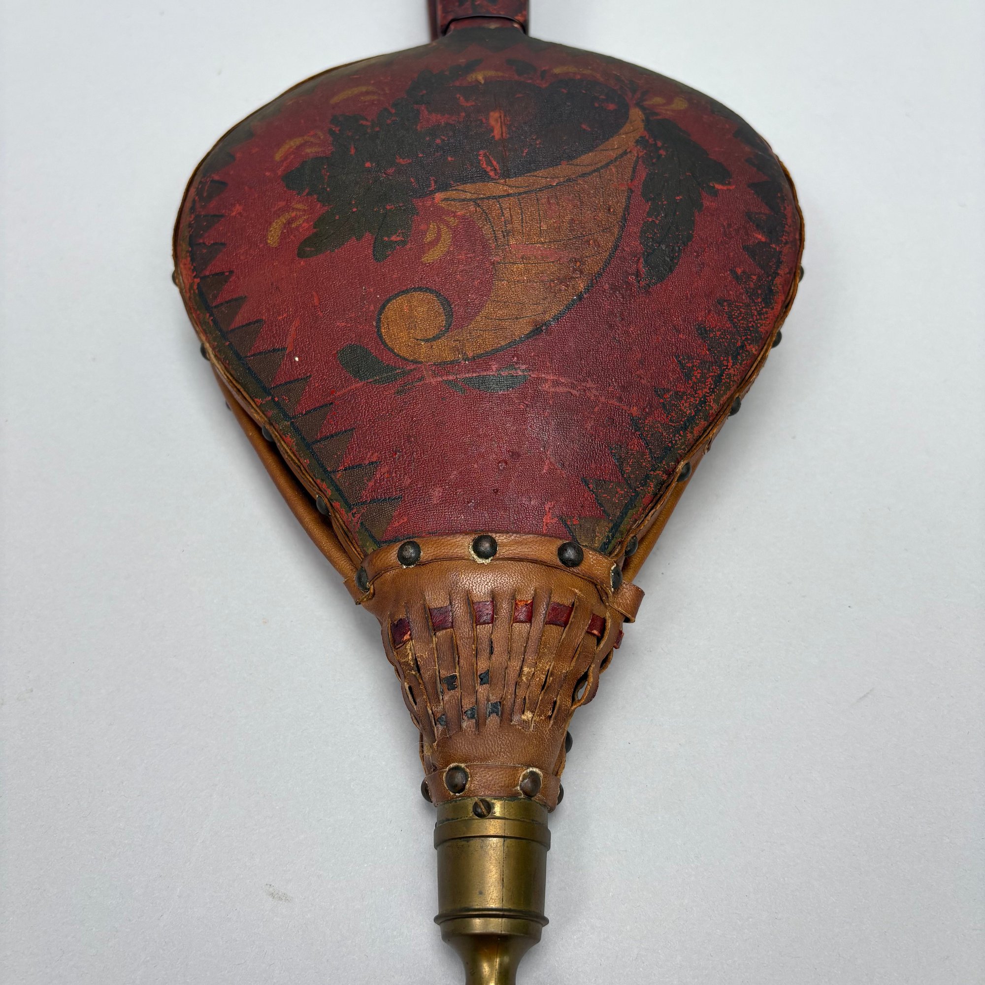 Three Pairs of Wood and Leather Painted and Stencilled Bellows, 19th Century. The first in ochre paint, stencilled in brown, black and gold with a basket of fruit and flowers; the second in dark red paint, stencilled with a cornucopia of leaves; the third in red paint, all with brass nozzles.