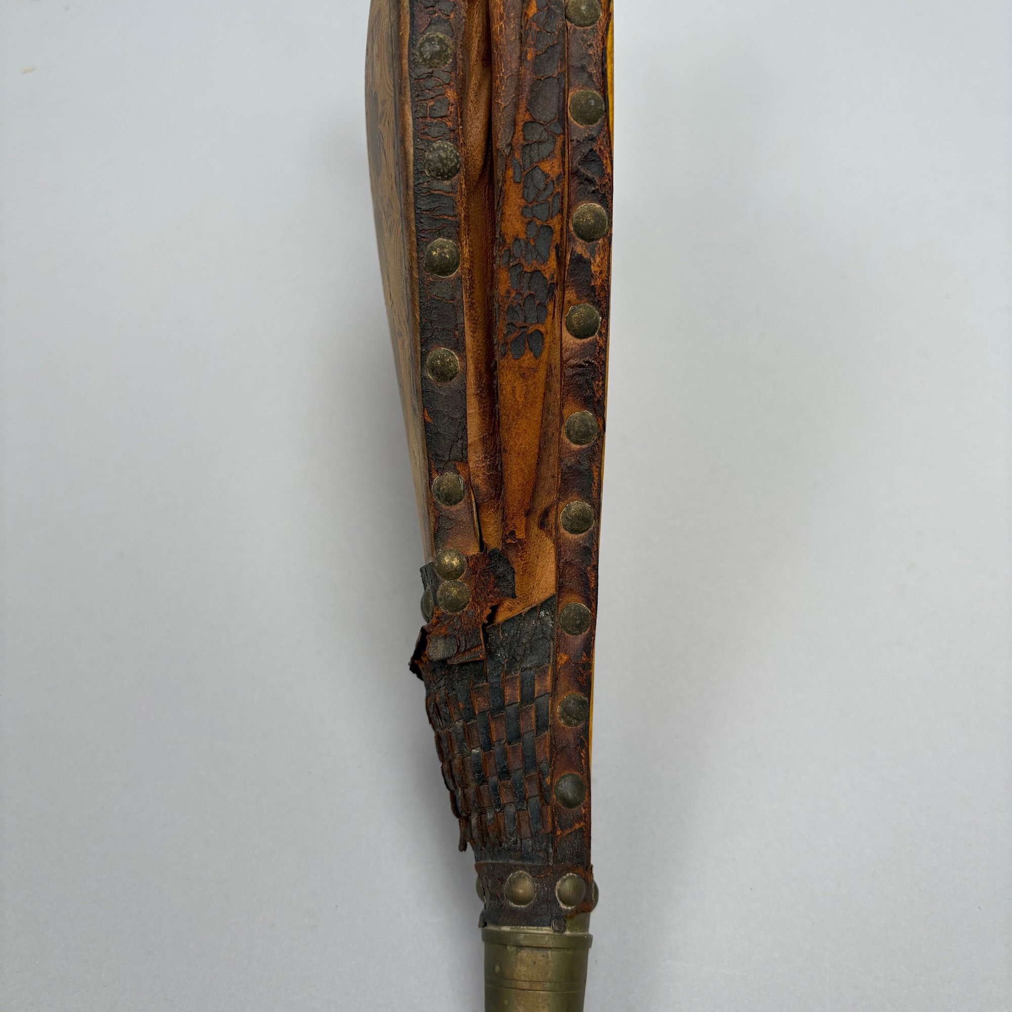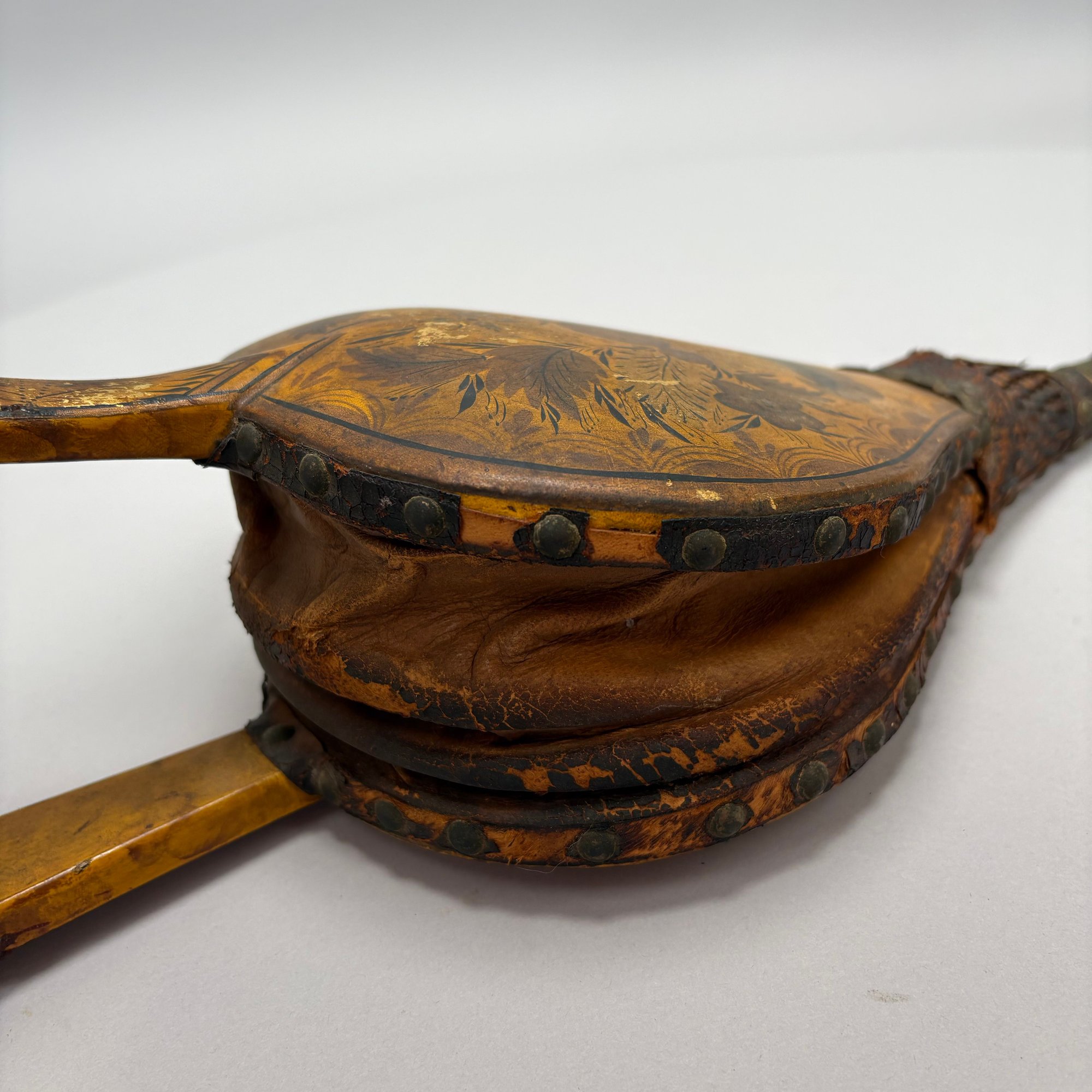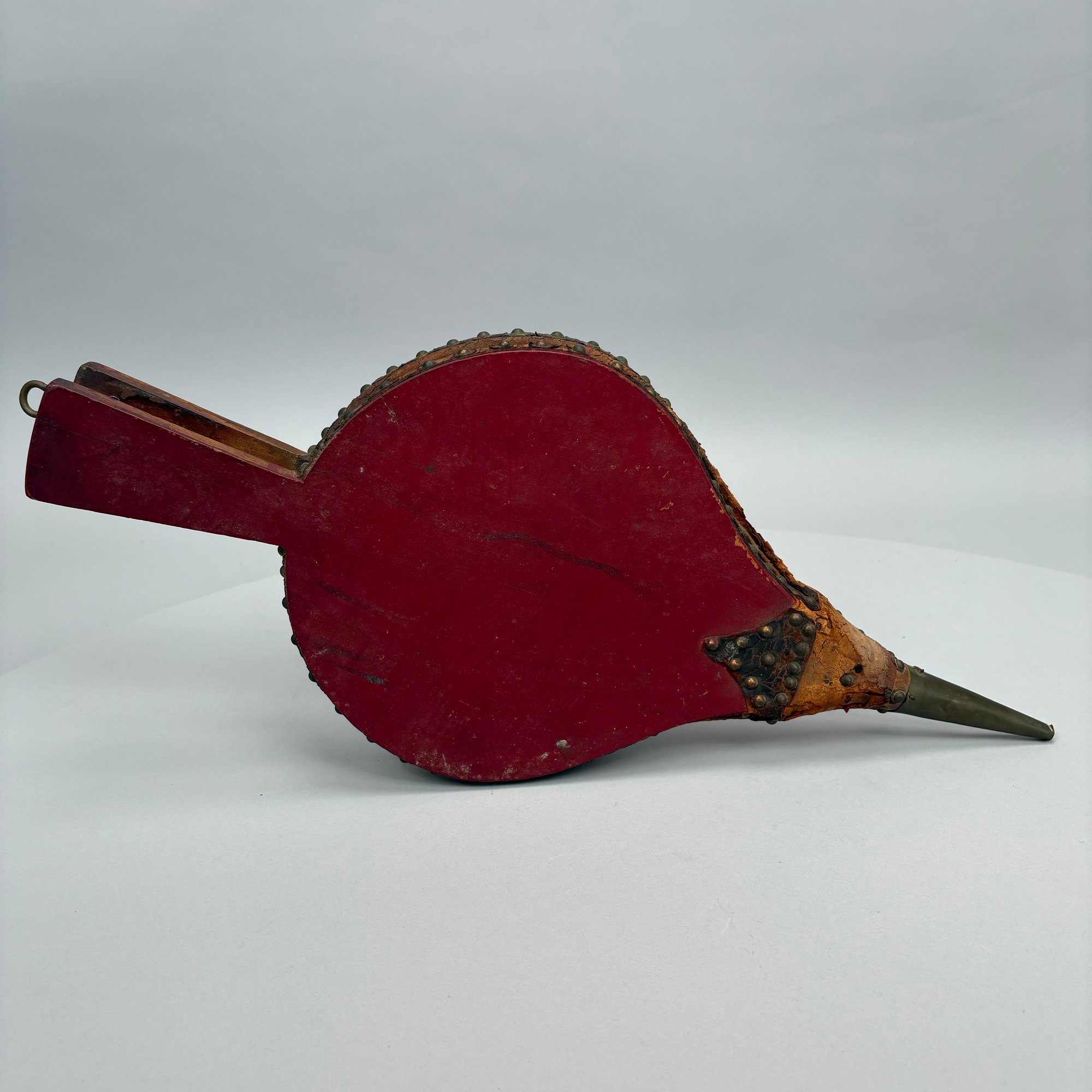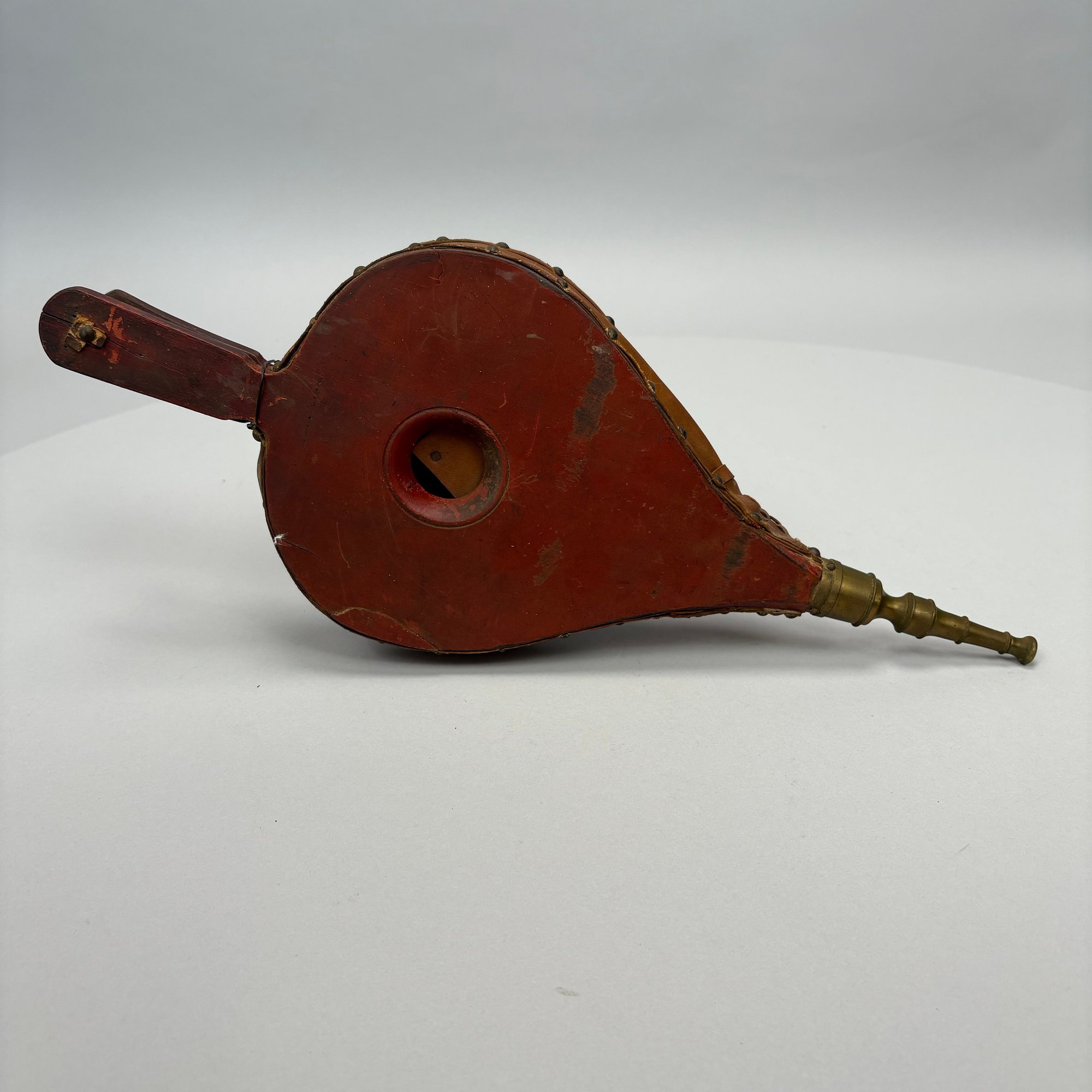 Three Pairs of Wood and Leather Painted and Stencilled Bellows, 19th Century. The first in ochre paint, stencilled in brown, black and gold with a basket of fruit and flowers; the second in dark red paint, stencilled with a cornucopia of leaves; the third in red paint, all with brass nozzles.