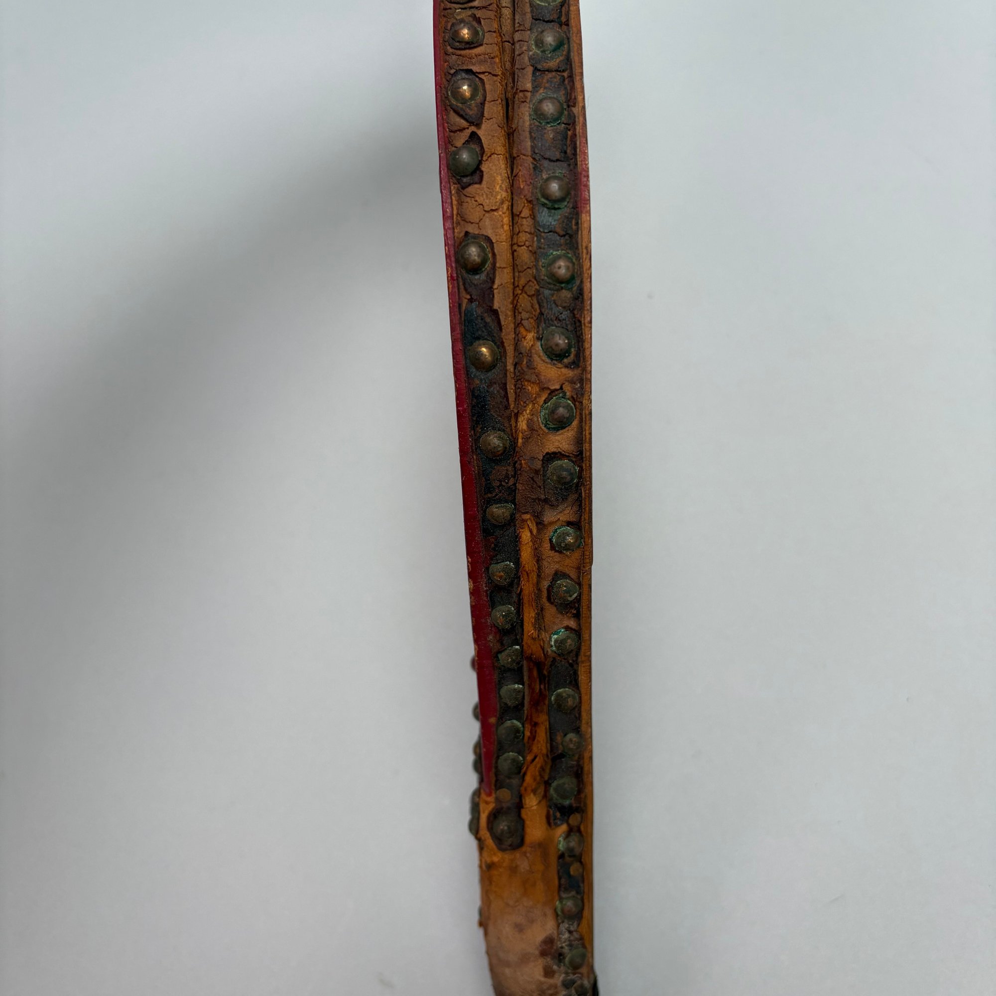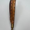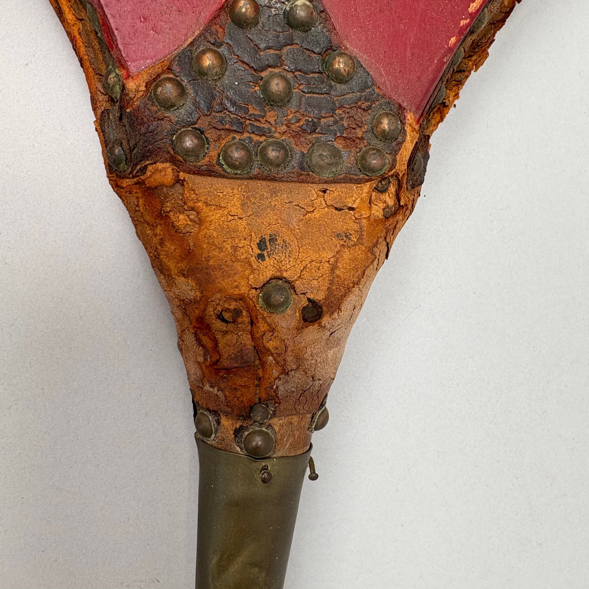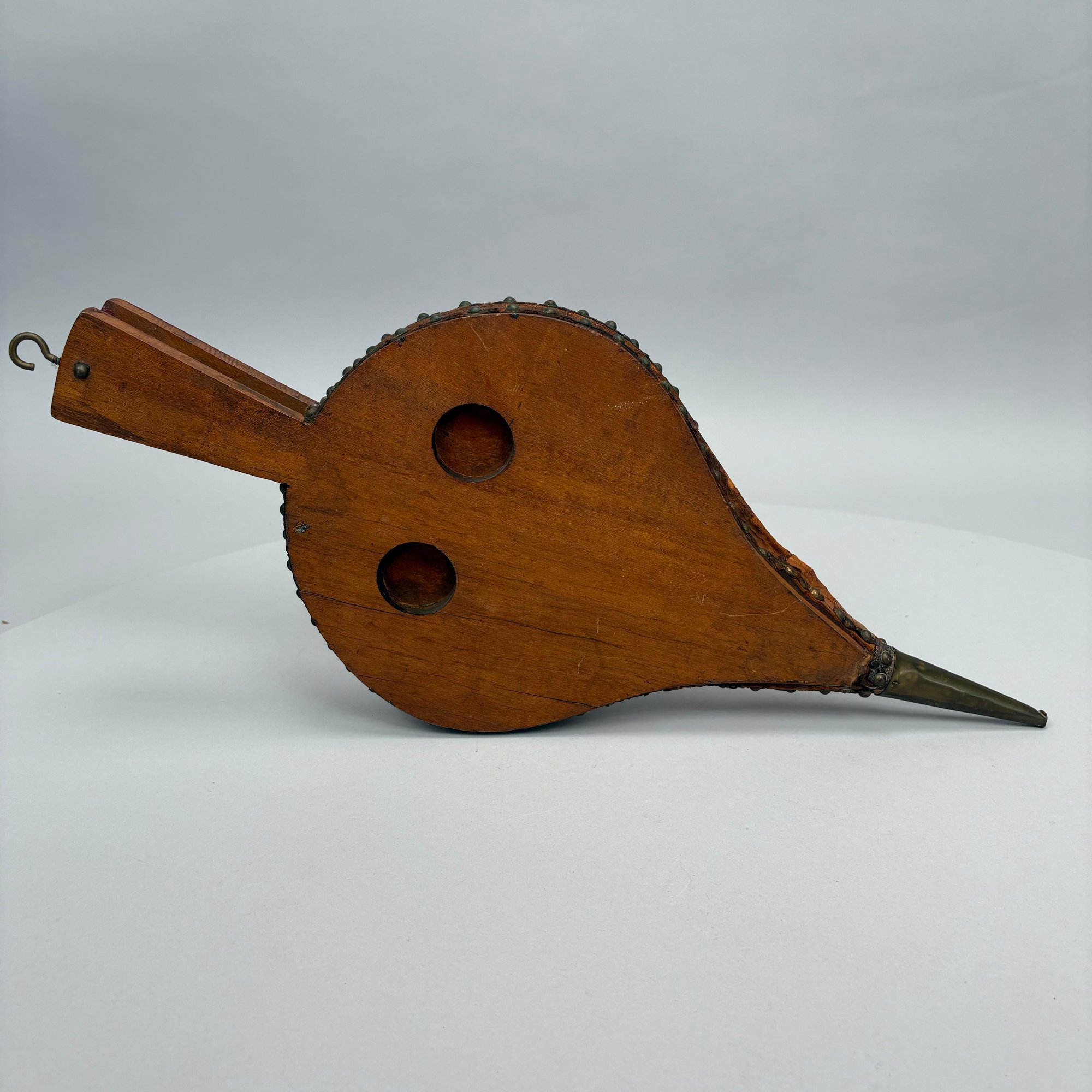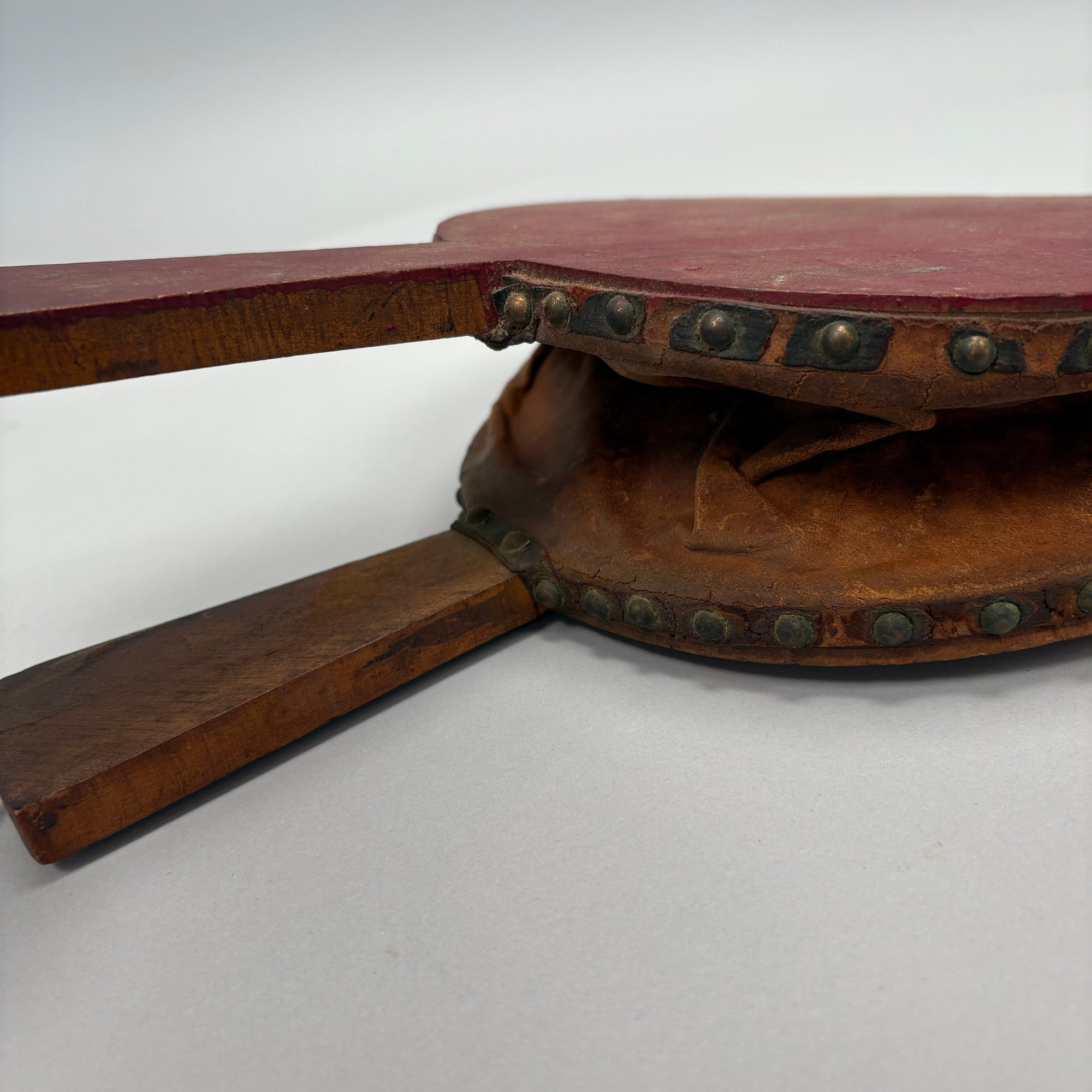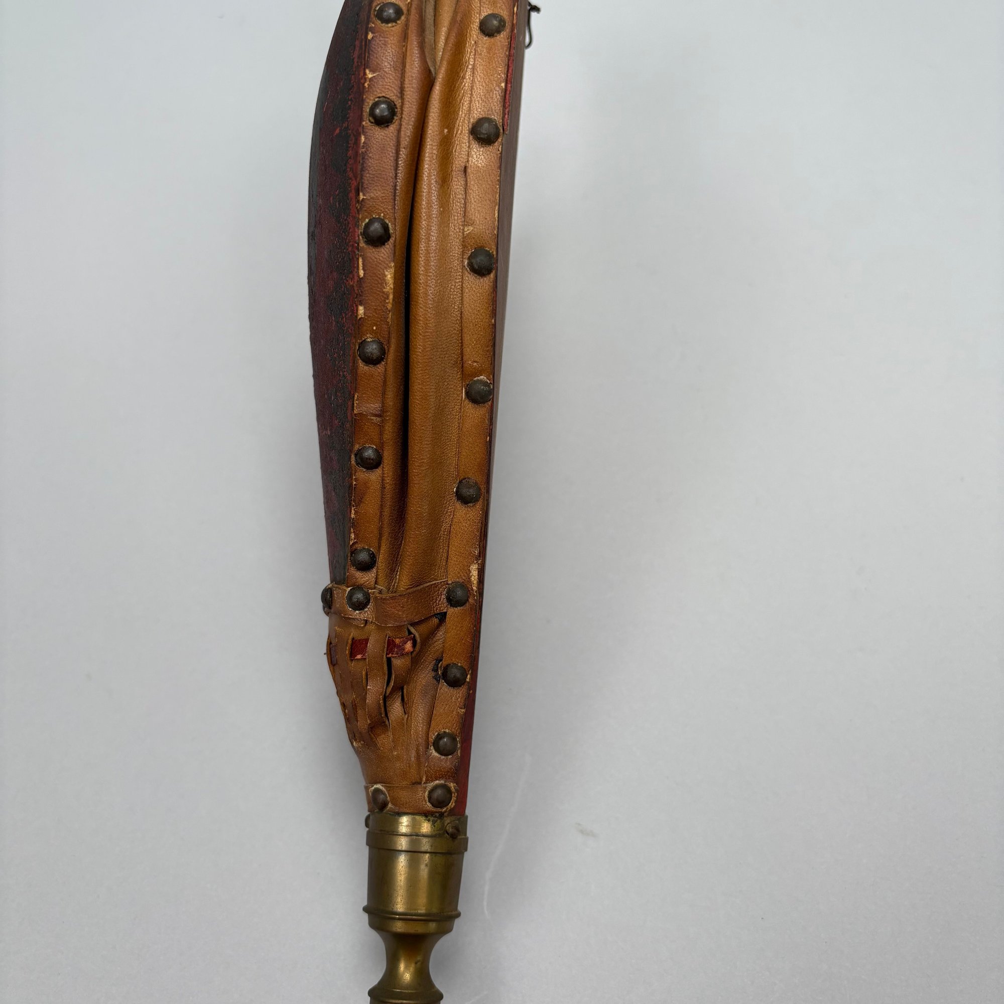 Three Pairs of Wood and Leather Painted and Stencilled Bellows, 19th Century. The first in ochre paint, stencilled in brown, black and gold with a basket of fruit and flowers; the second in dark red paint, stencilled with a cornucopia of leaves; the third in red paint, all with brass nozzles.