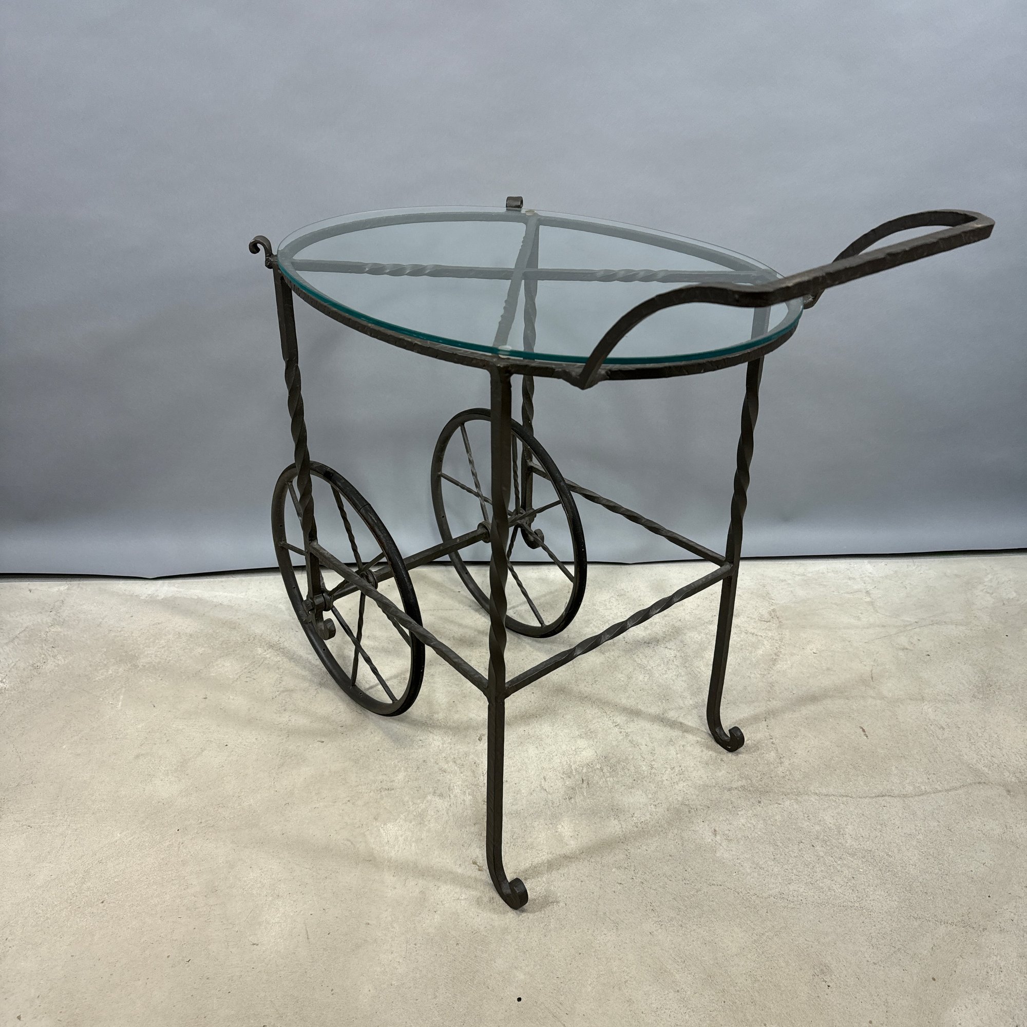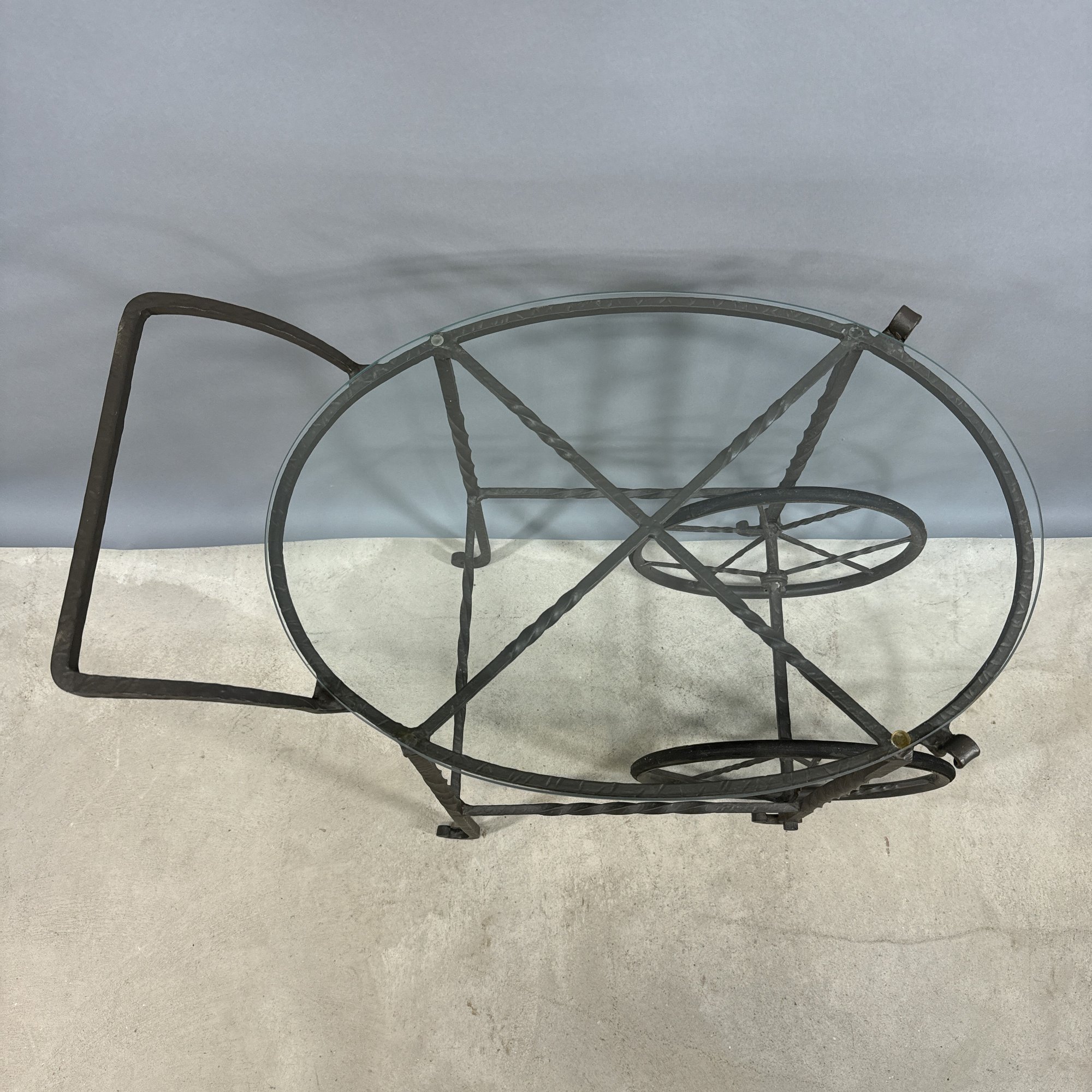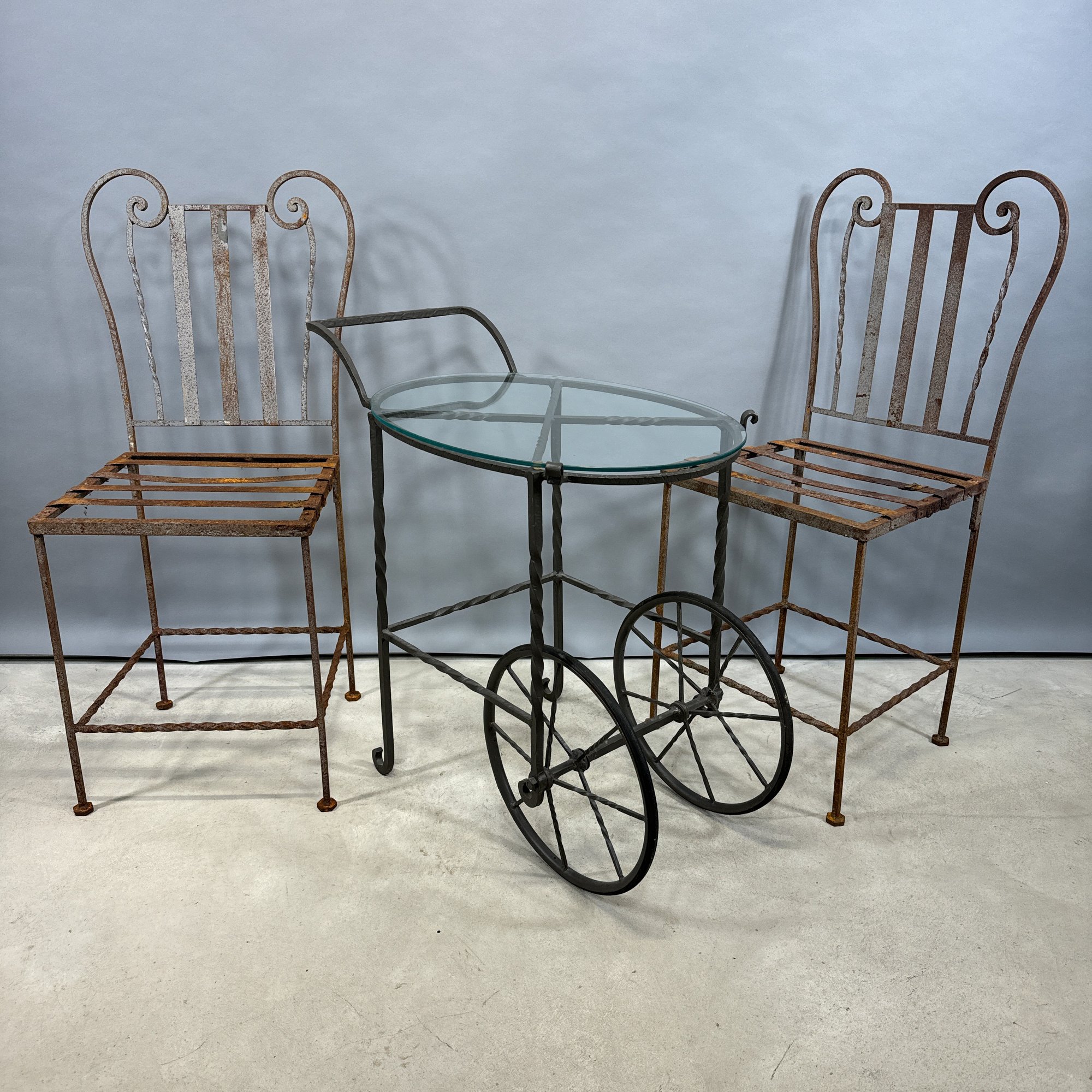 Polished Steel and Iron Three-Piece Bistro Set. Comprising a pair of chairs and a teacart with glass top.