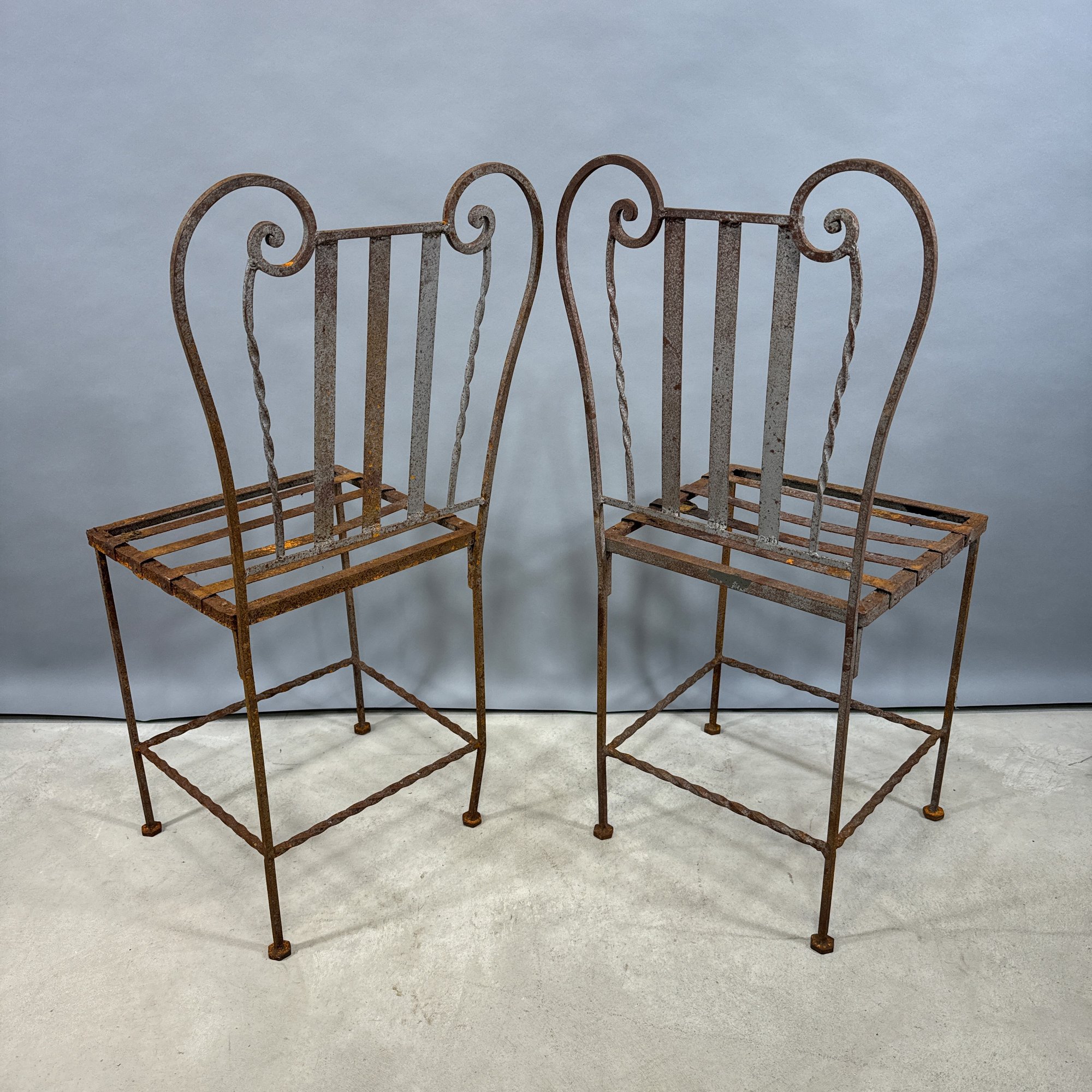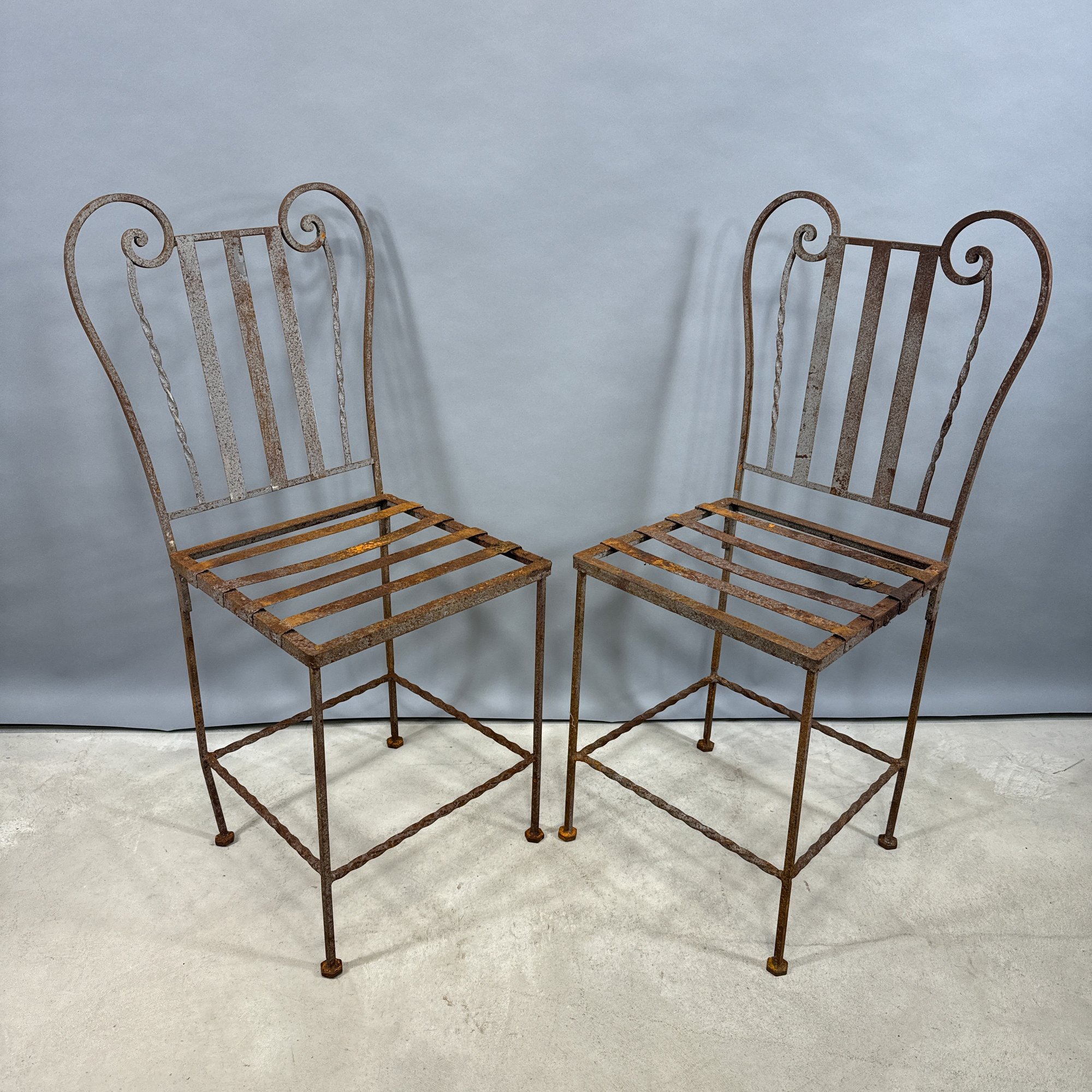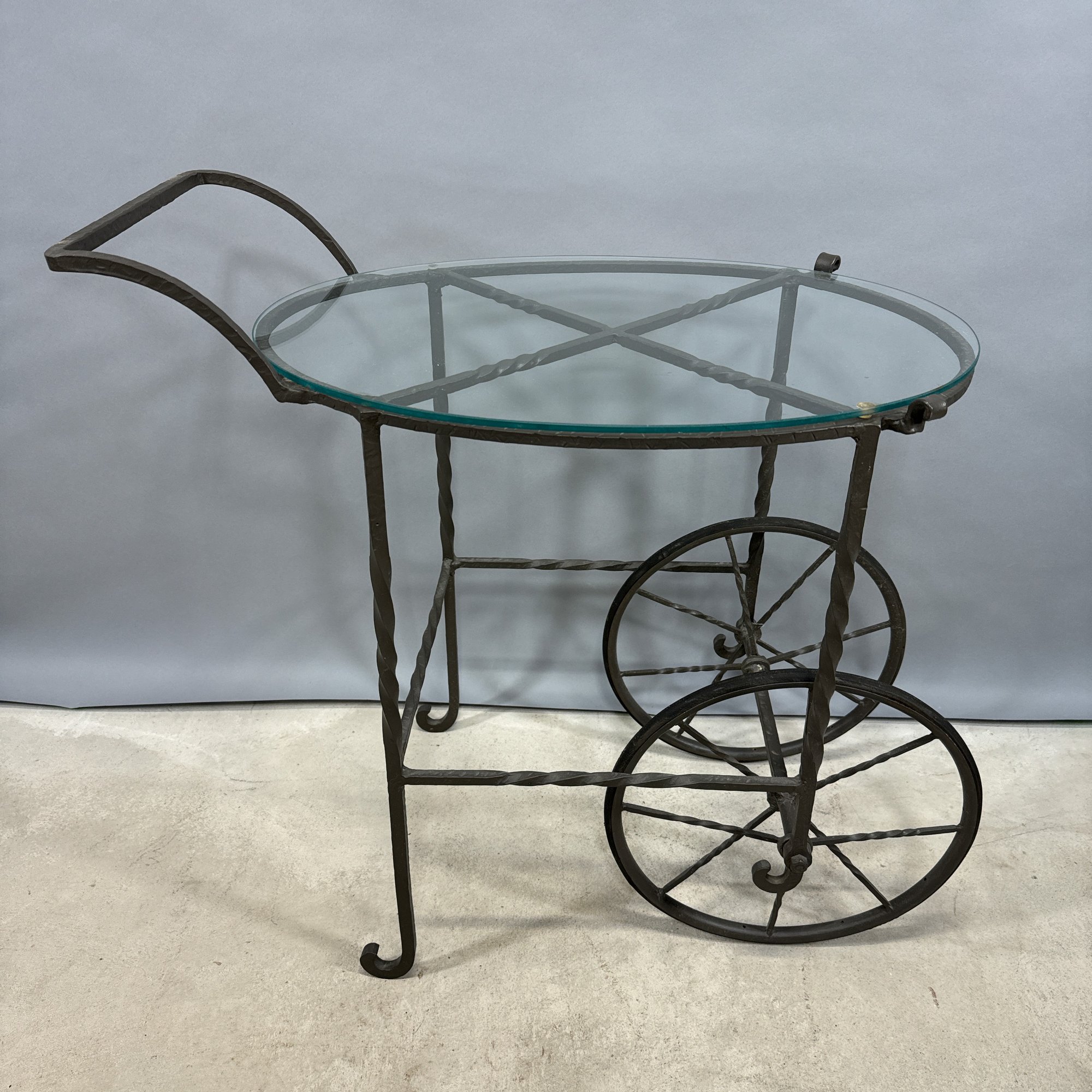 Polished Steel and Iron Three-Piece Bistro Set. Comprising a pair of chairs and a teacart with glass top.