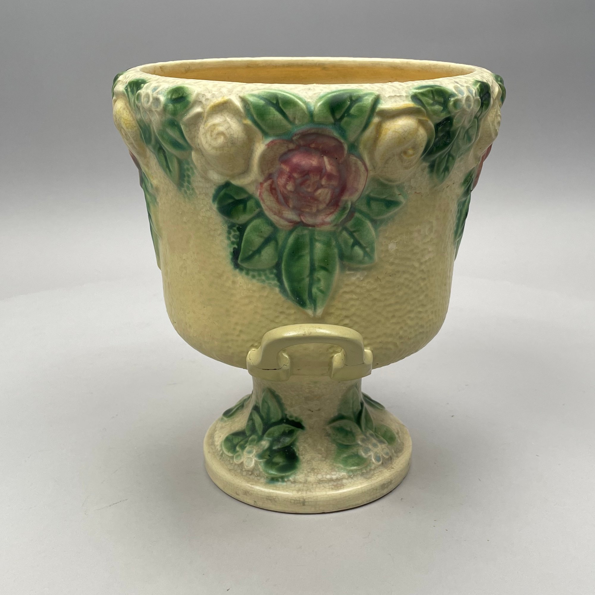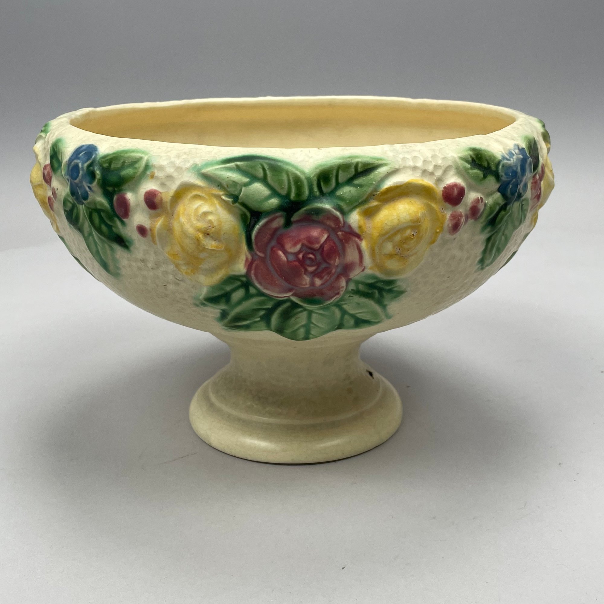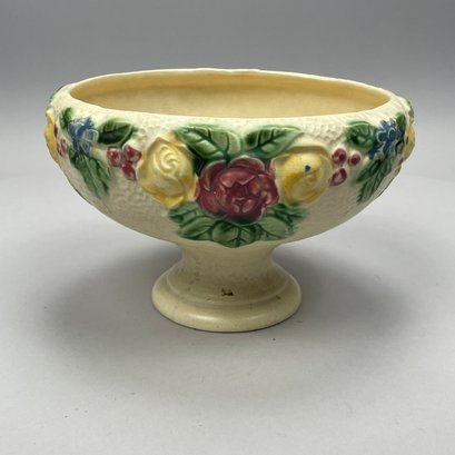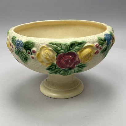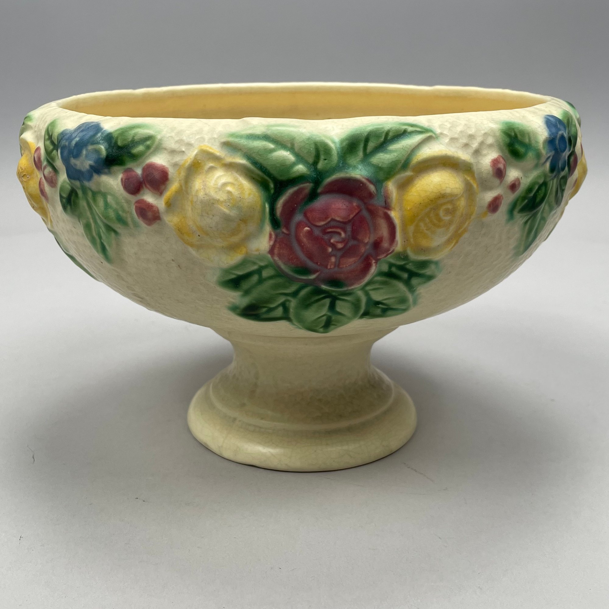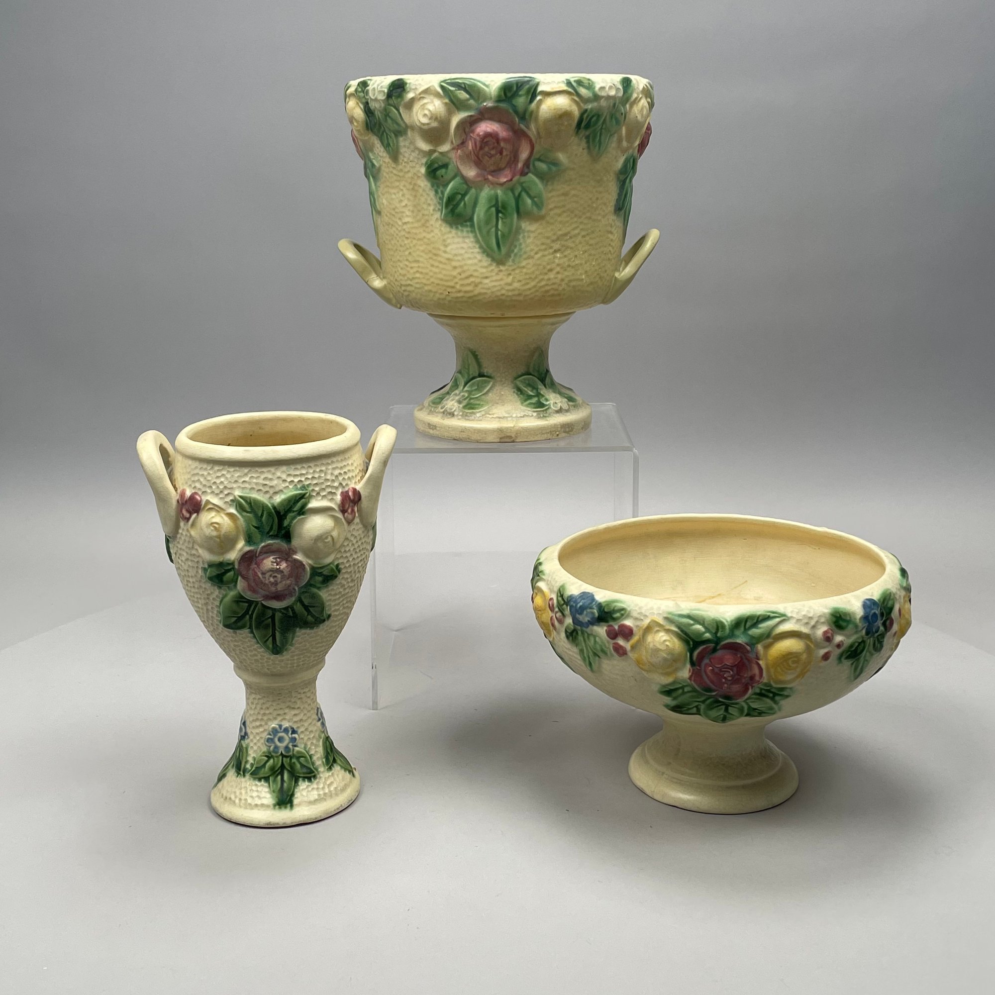 Three Roseville Pottery 'Rozane' Wares, Zanesville, Ohio, Introduced in 1917. Comprising a rare champagne bucket, a comport and a vase, the comport printed with indecipherable numerals in blue ink.