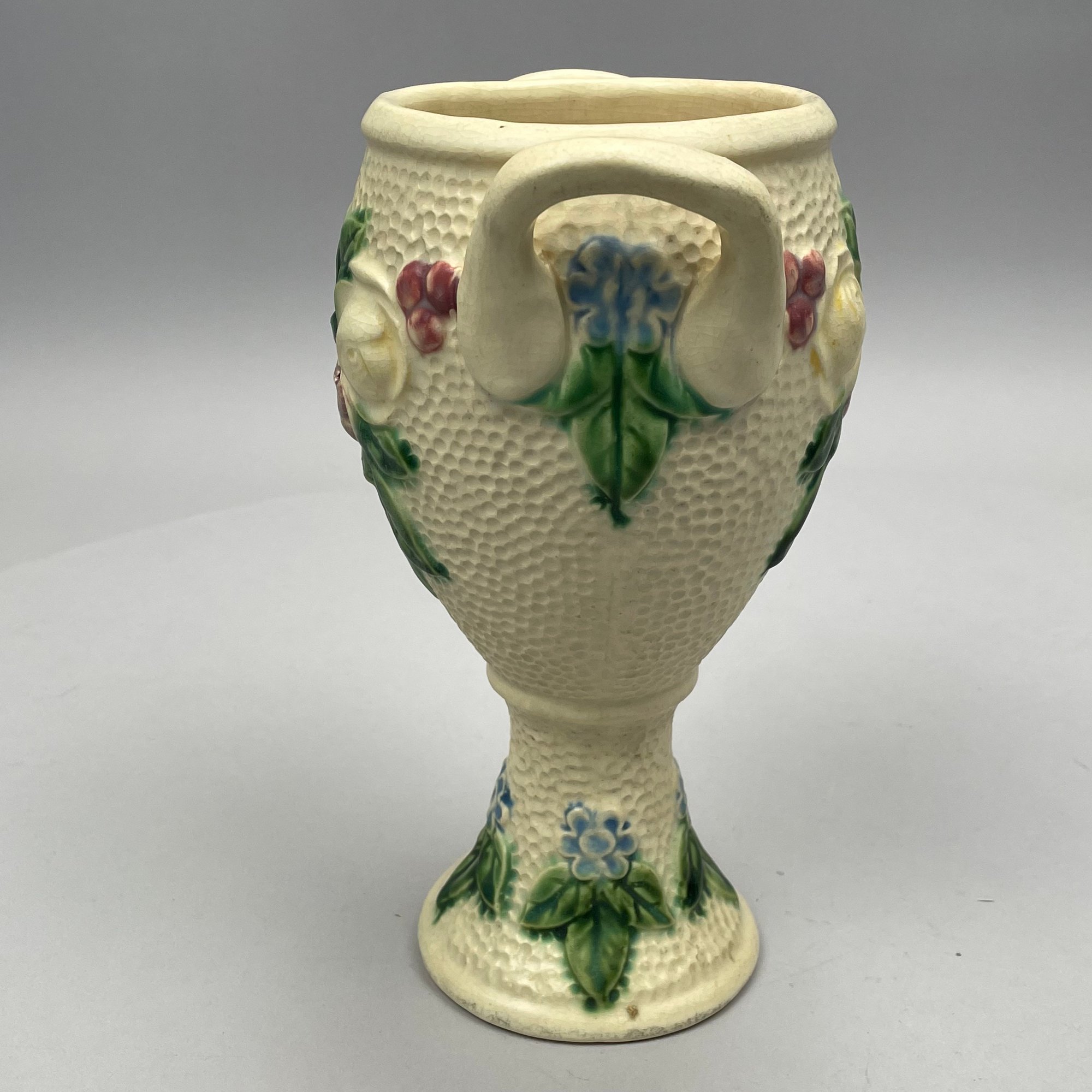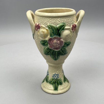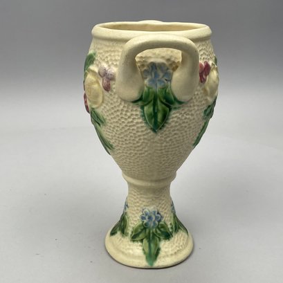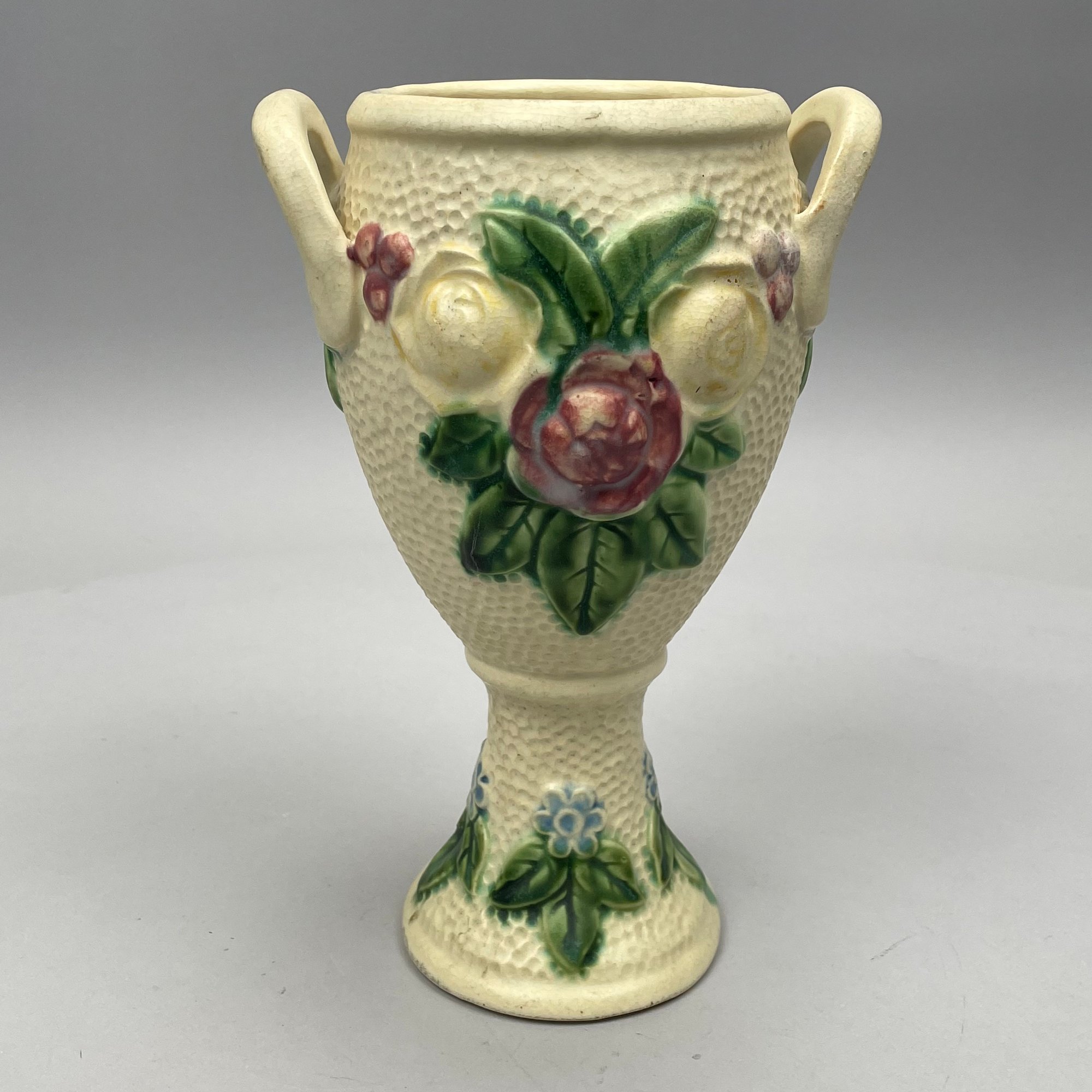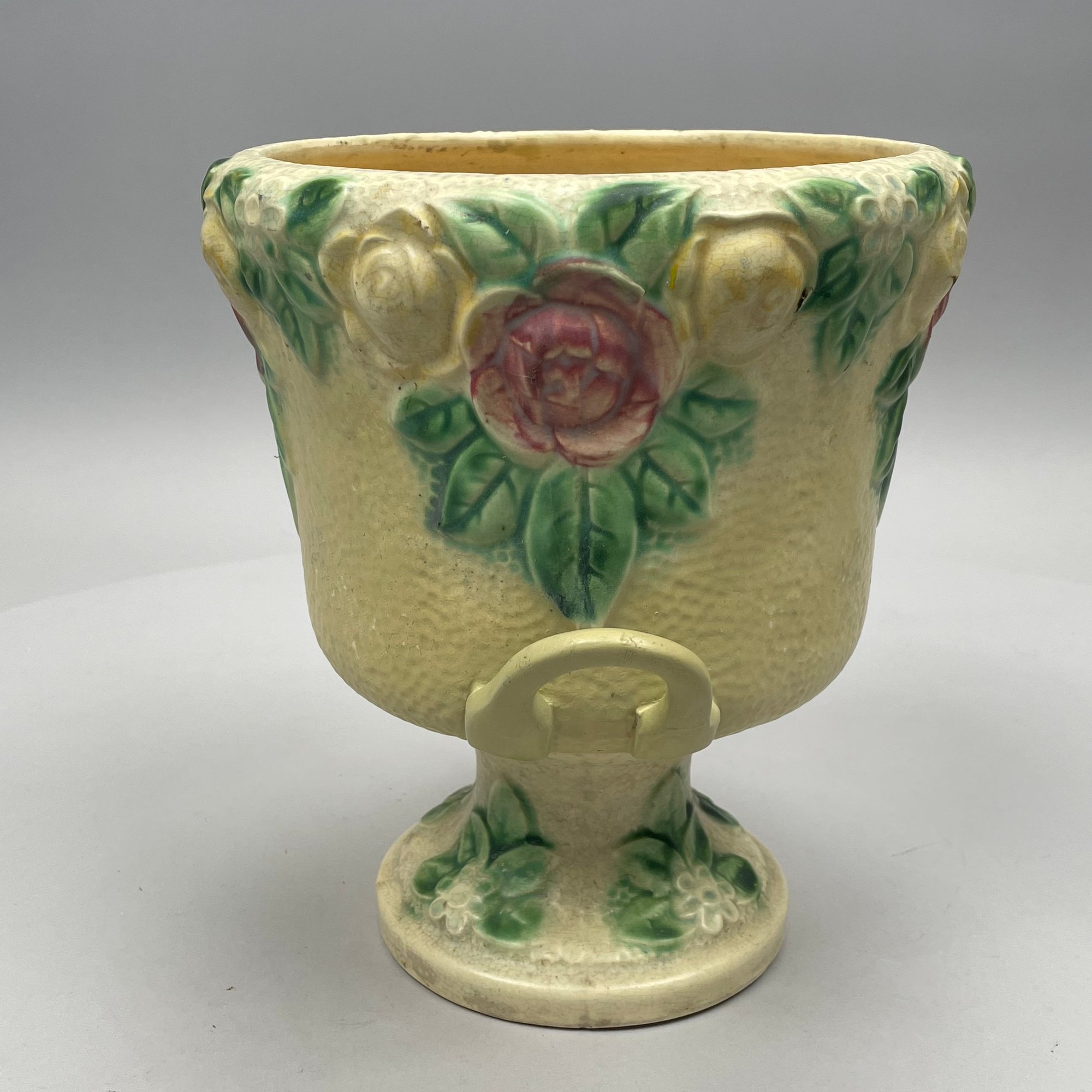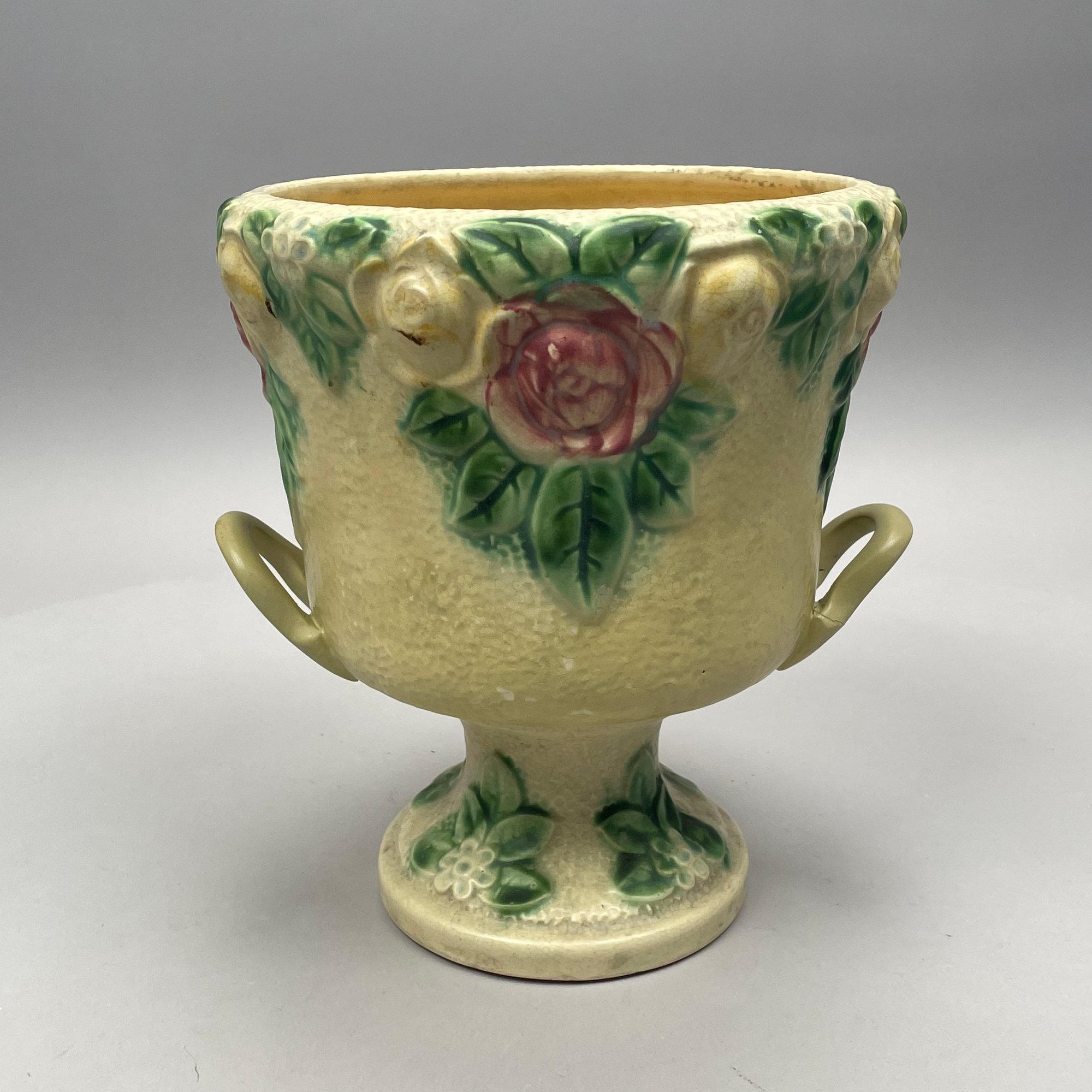 Three Roseville Pottery 'Rozane' Wares, Zanesville, Ohio, Introduced in 1917. Comprising a rare champagne bucket, a comport and a vase, the comport printed with indecipherable numerals in blue ink.