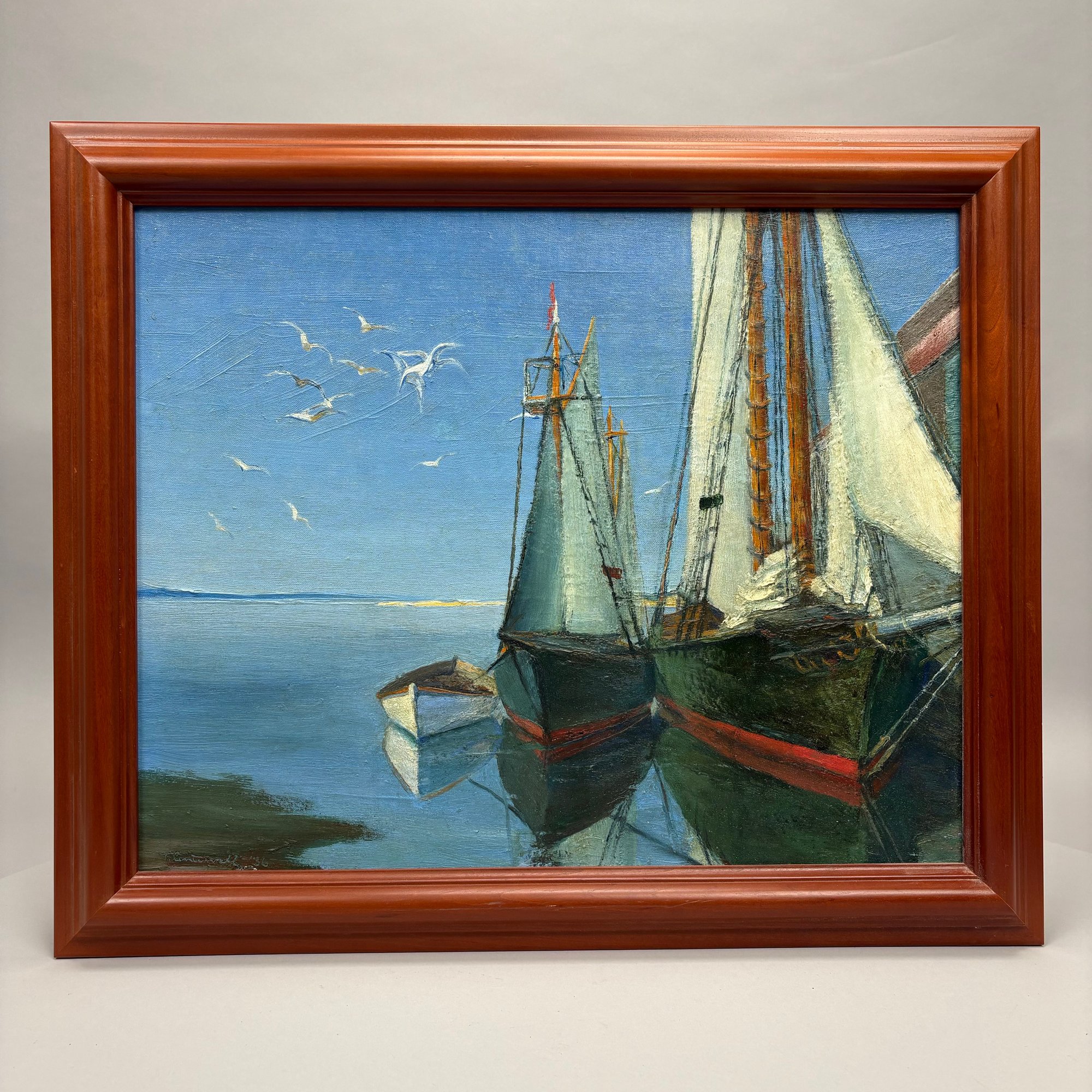 Torsten Centervall (American, 1905 - 1985). Moored Boats, 1936. Oil on artists board, signed and dated "T. Centervall '36" lower left, (15.5 x 19.25 inches, sight).