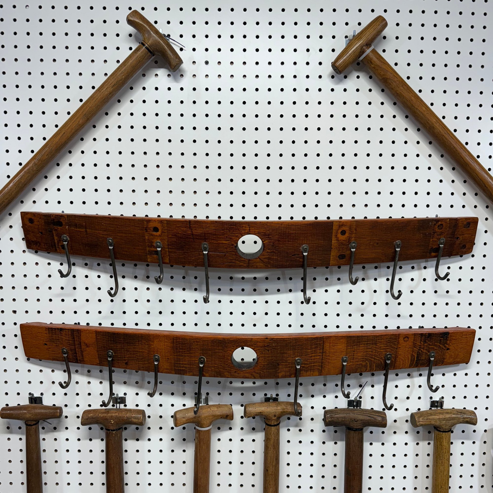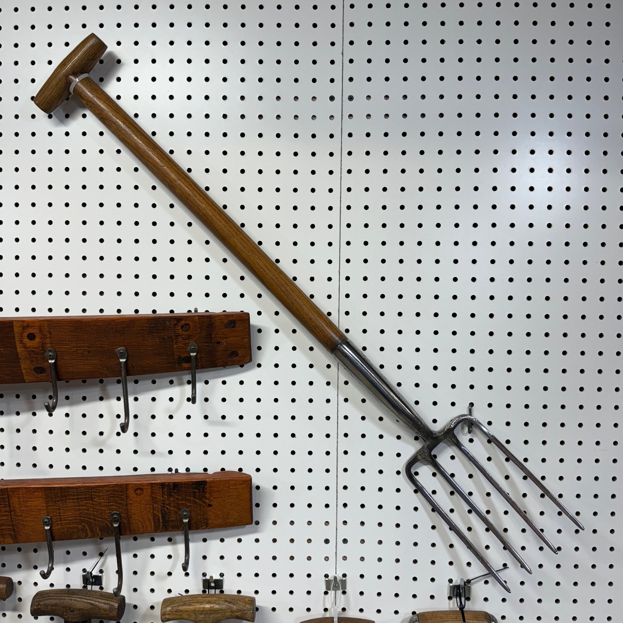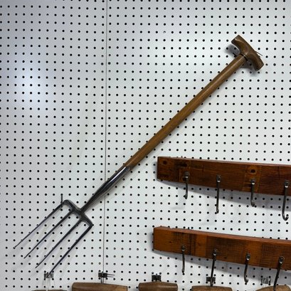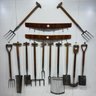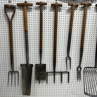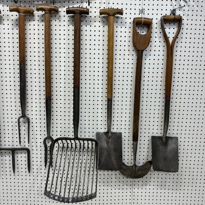 Twelve Iron and Wood Farm and Gardening Tools, with Two Oak Hanging Racks, Twentieth Century. Comprising a large manure shovel, soil aerator and a spade, a long hay cutter, three small soil aerators, three small shovels, and two root pullers.