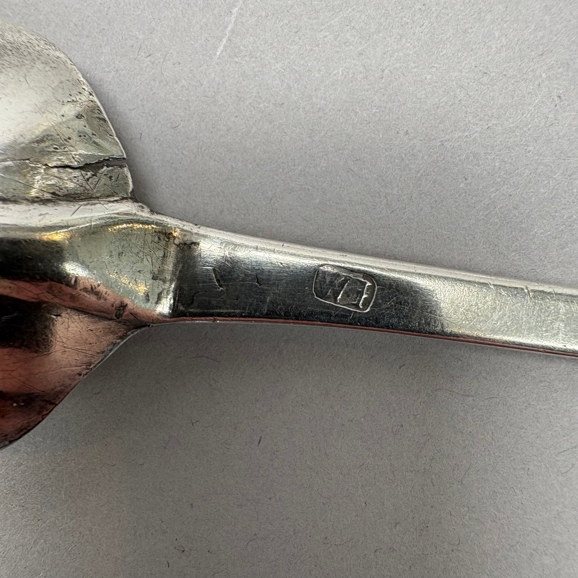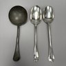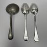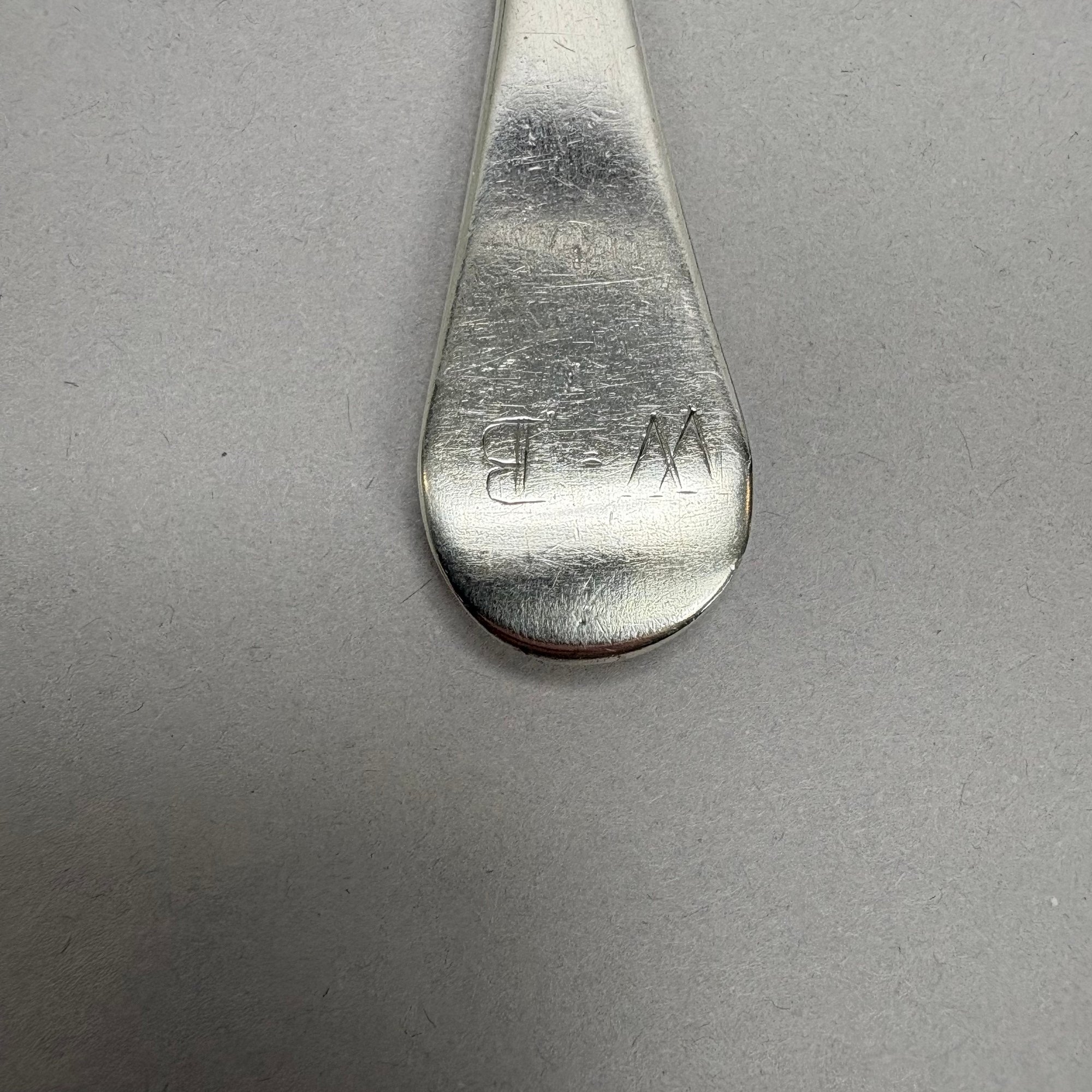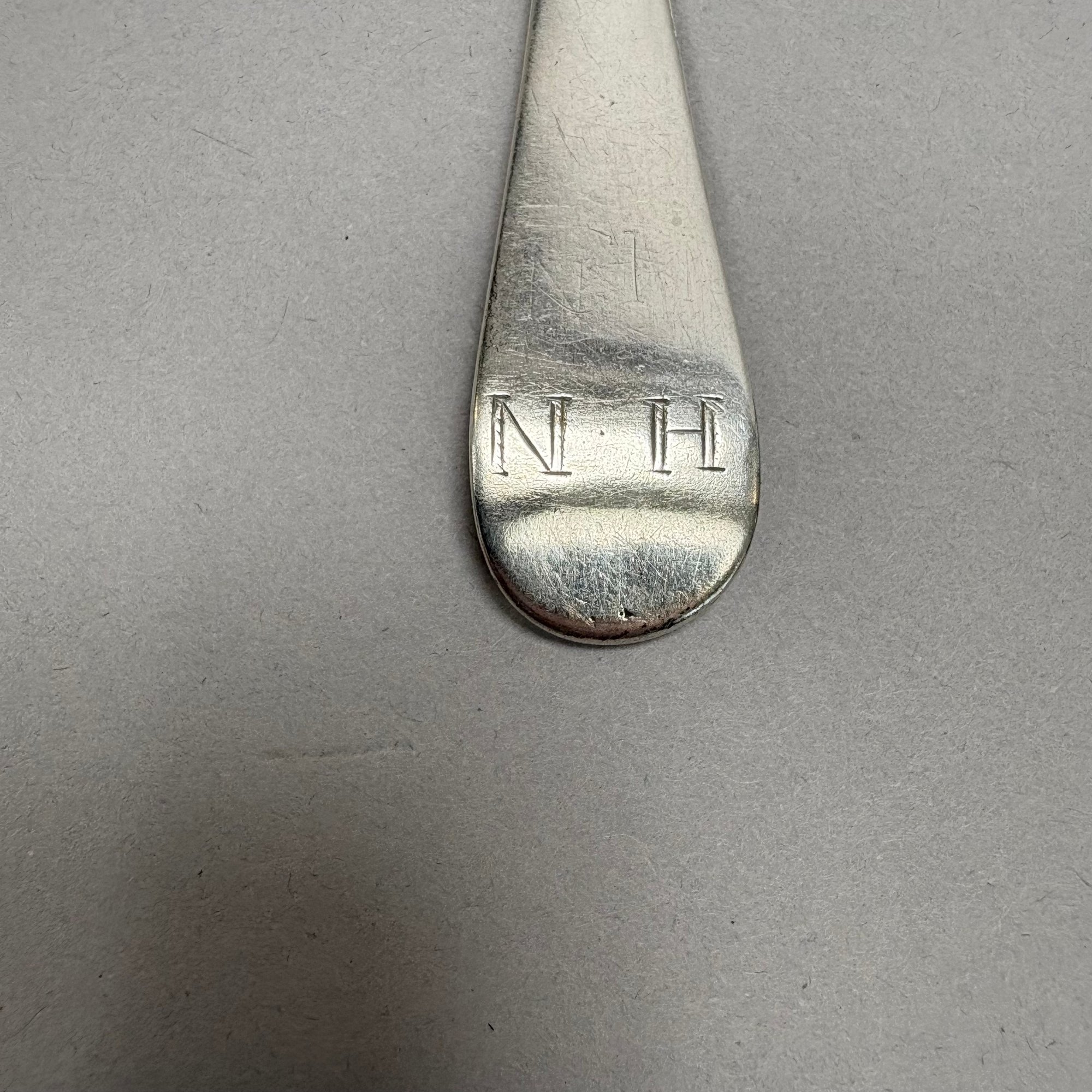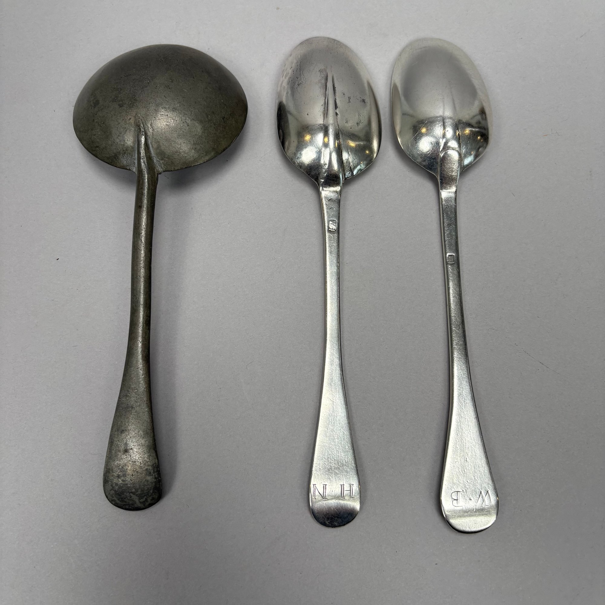 Two American Coin Silver Rattail Table or Dessert Spoons with Spatulate Handles, 18th Century; and a Pewter Spoon. The first William Jones, Marblehead, Massachusetts, (1694-1730), engraved with the initials "HN" in block letters, marked "WI" into a rectangle; the second Thomas Shilds, Philadelphia, Pennsylvania (act. 1765), engraved initials "W=B" in block letters, marked "TS" into a rectangle; and a Dutch style pewter spoon with circular deep bowl.