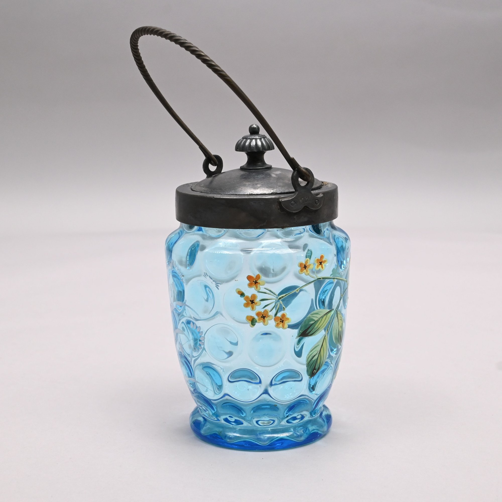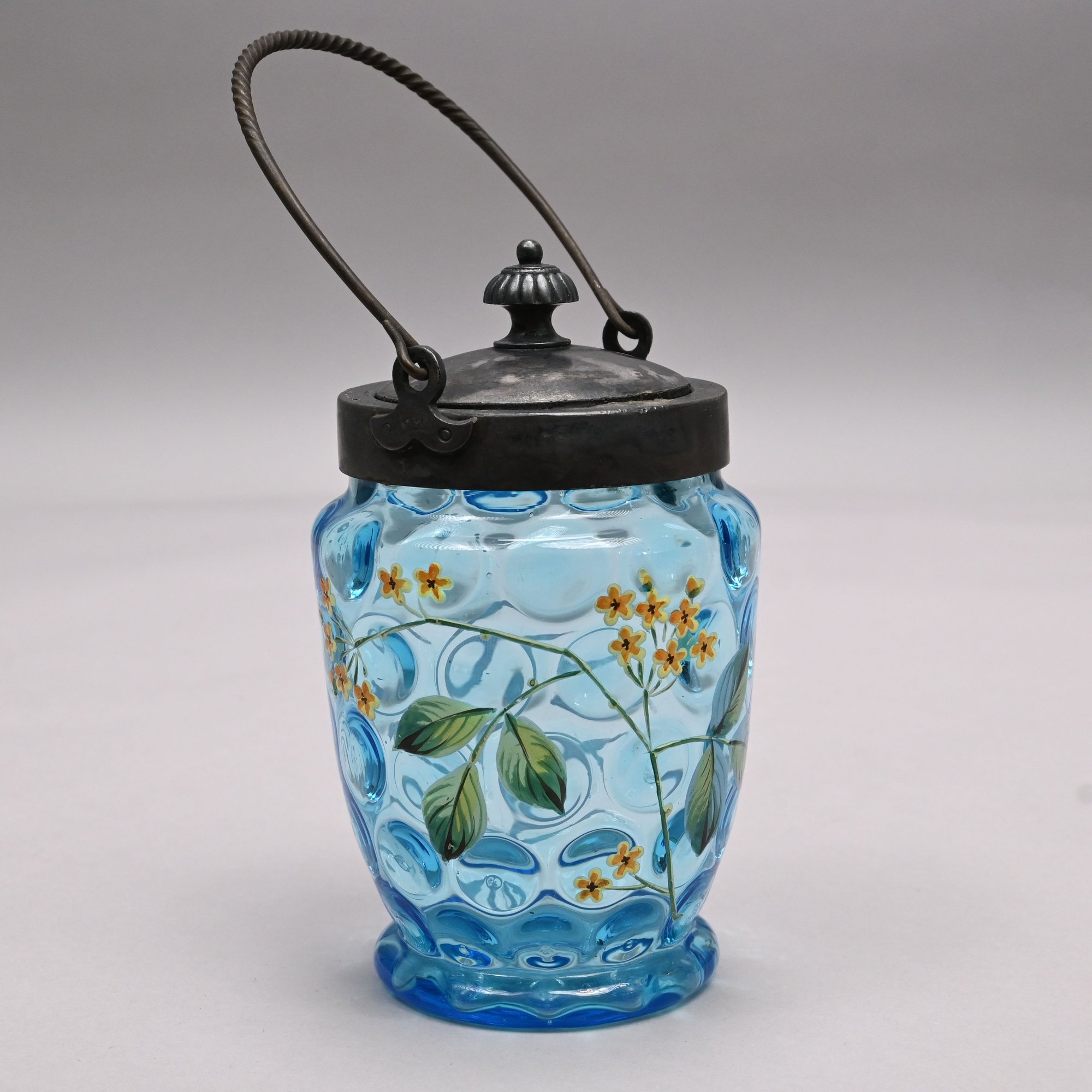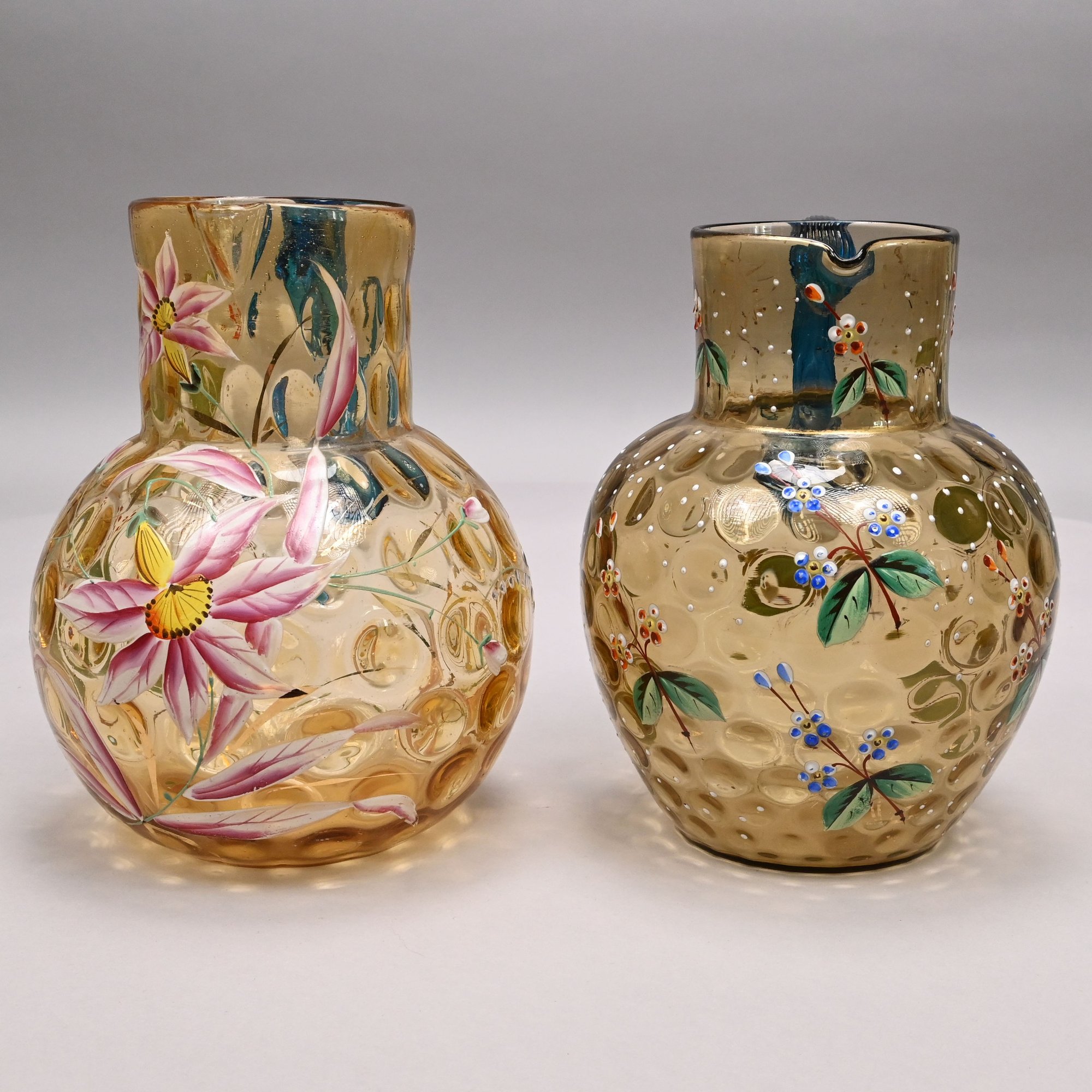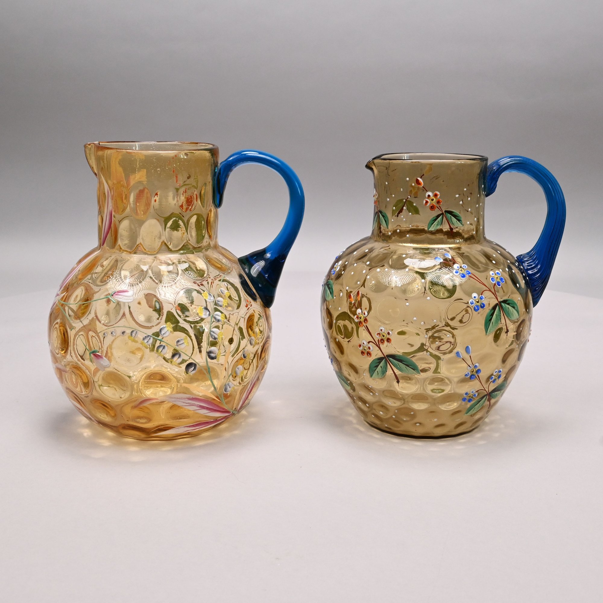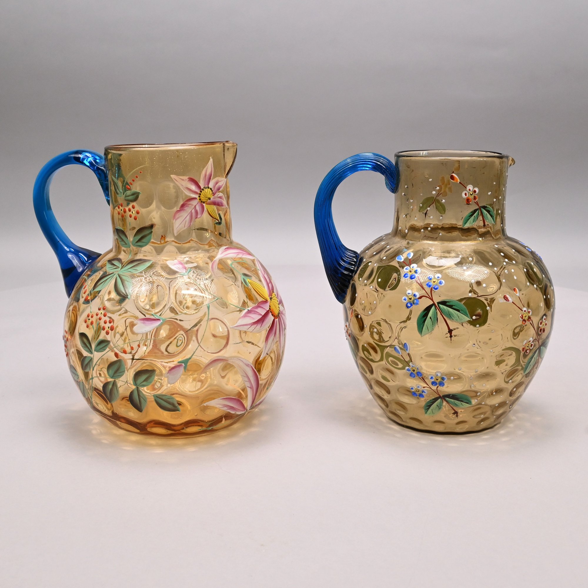 Two American Enamelled Glass Pitchers and a Jar, Late 19th Century. All reverse thumbprint, the two pitchers in amber glass, the first enamelled with a large pink and yellow floral spray flanked by red, blue and yellow wildflowers, applied blue handle; the second with scattered flower sprays and sprigs, applied reeded blue handle; the jar in blue glass enamelled with a floral sprig on the front and a white spray on the back.