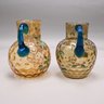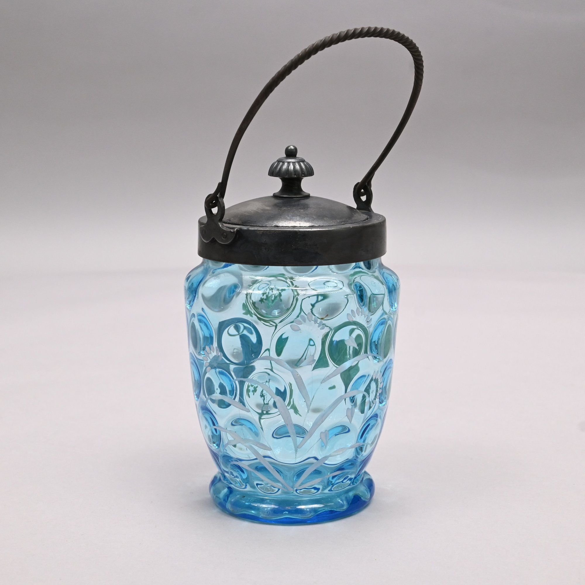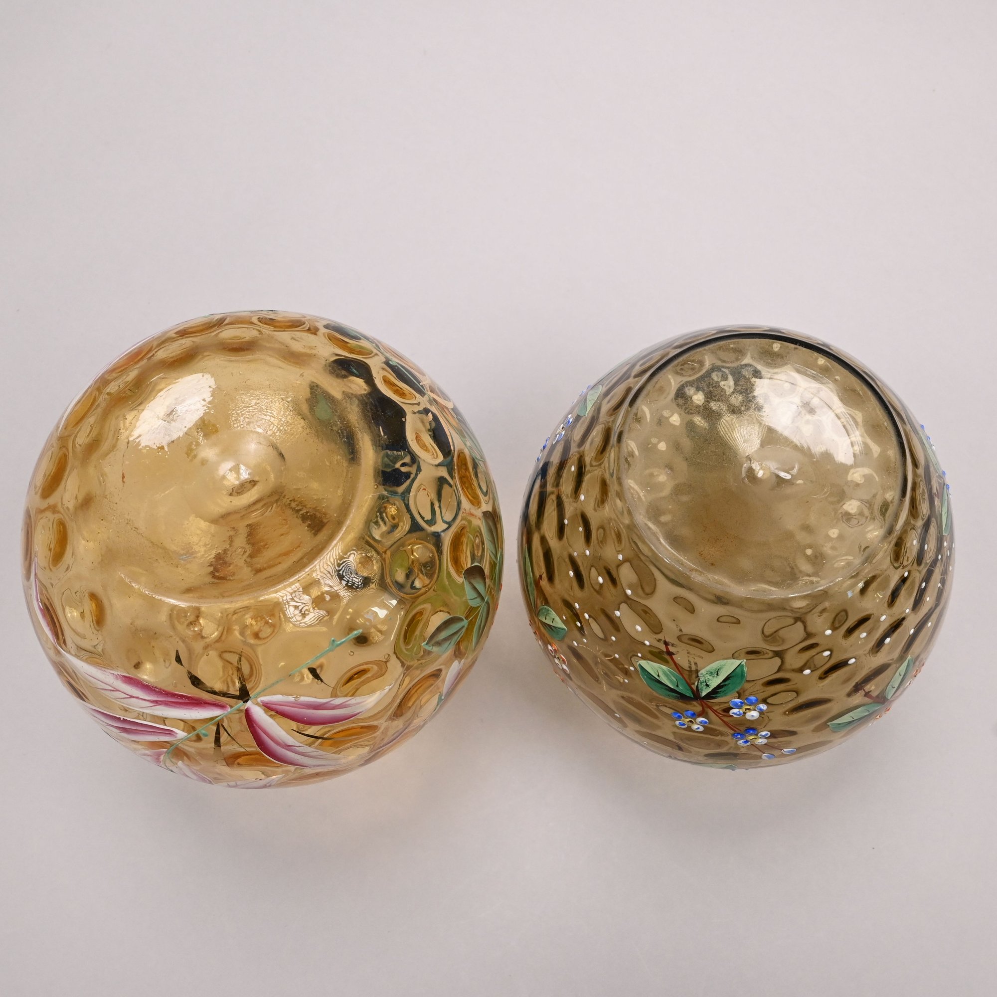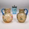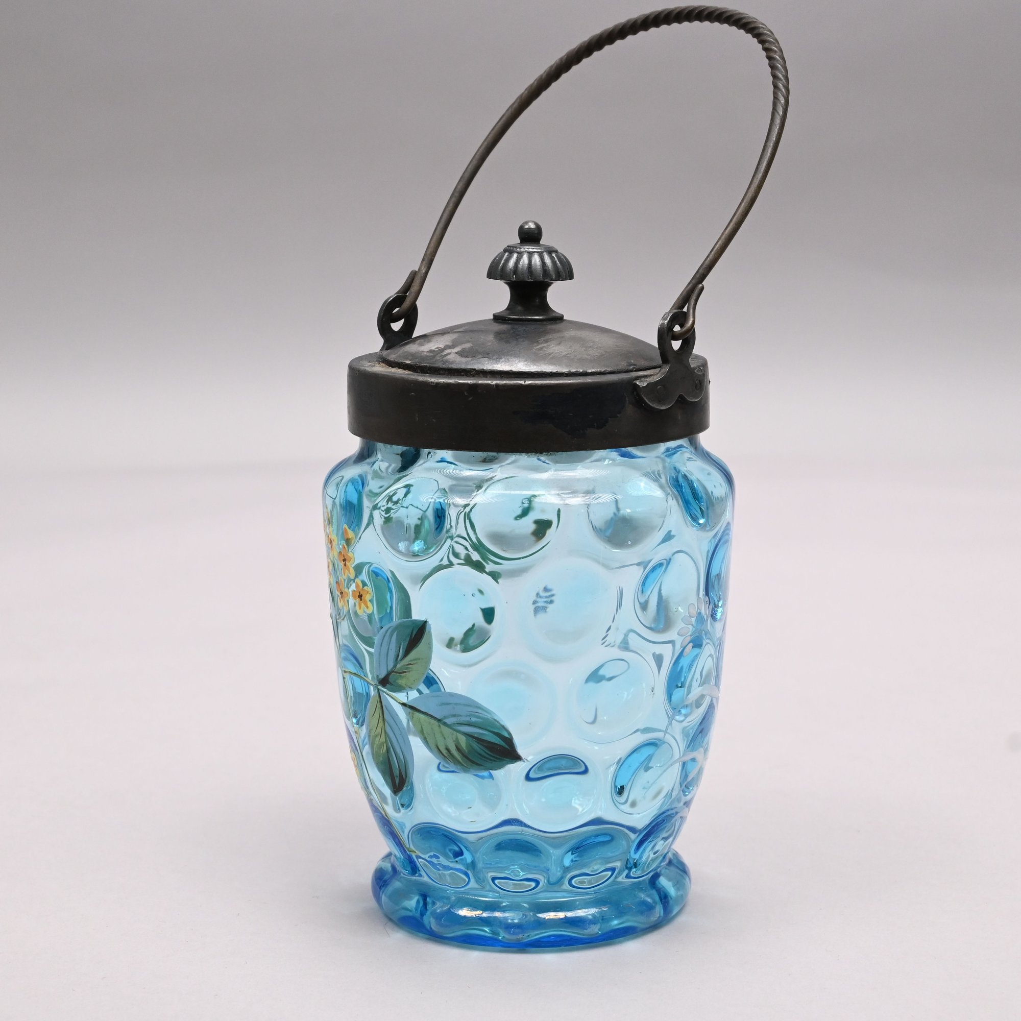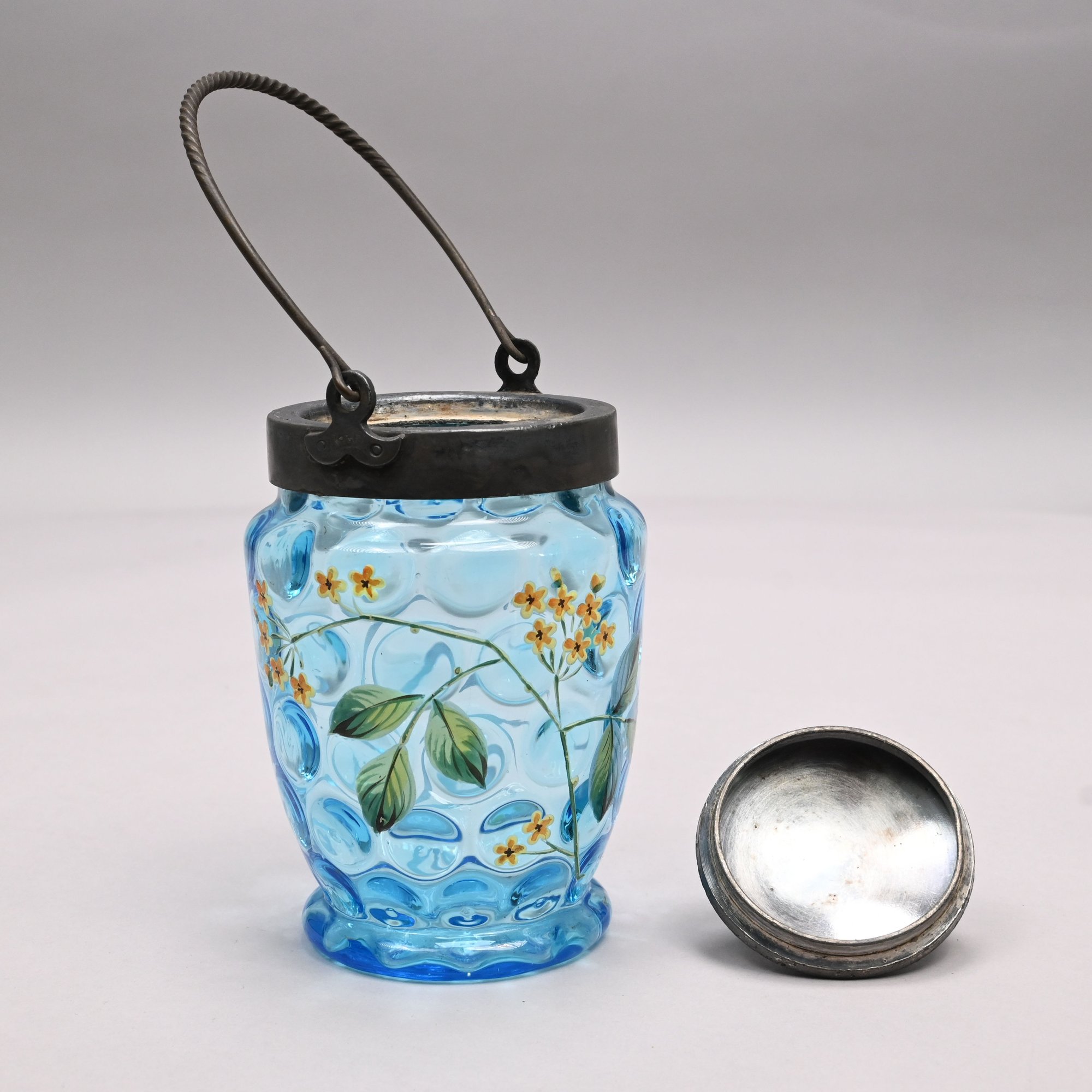 Two American Enamelled Glass Pitchers and a Jar, Late 19th Century. All reverse thumbprint, the two pitchers in amber glass, the first enamelled with a large pink and yellow floral spray flanked by red, blue and yellow wildflowers, applied blue handle; the second with scattered flower sprays and sprigs, applied reeded blue handle; the jar in blue glass enamelled with a floral sprig on the front and a white spray on the back.