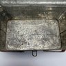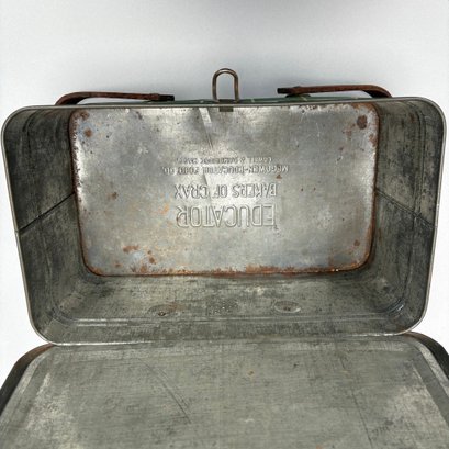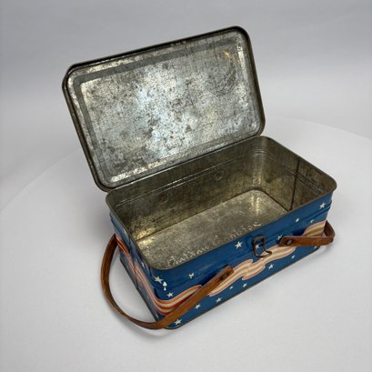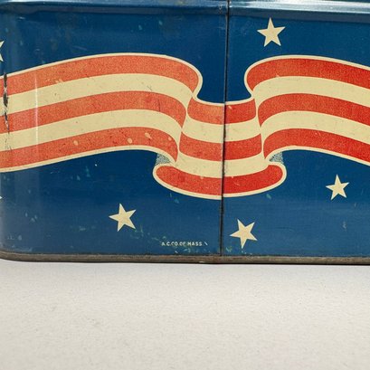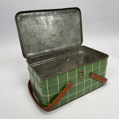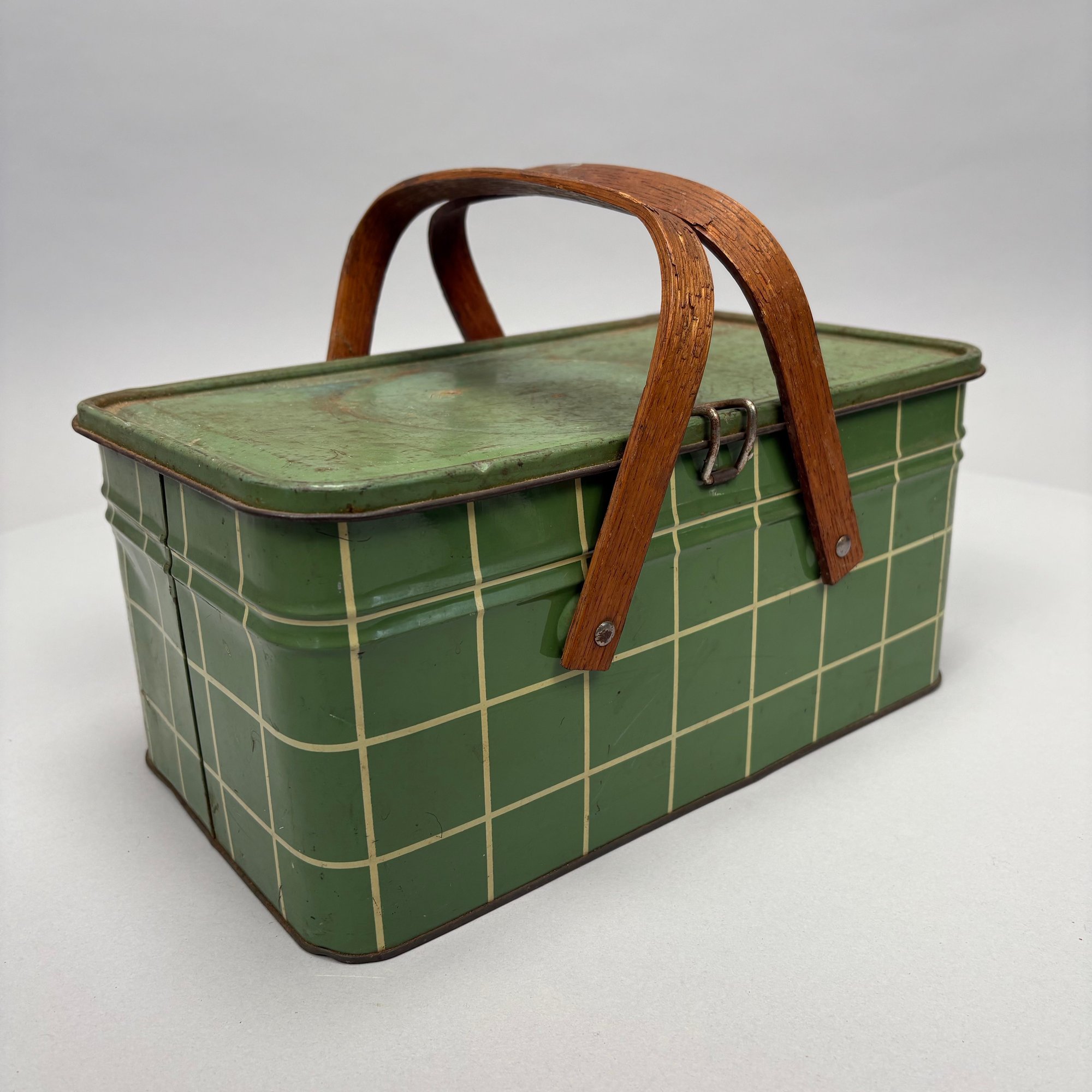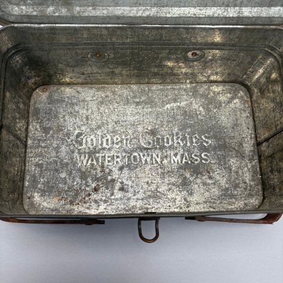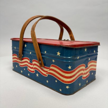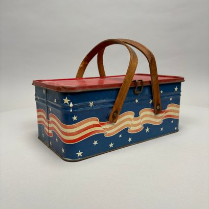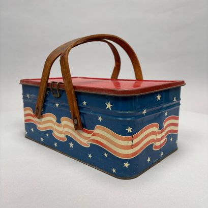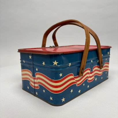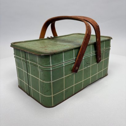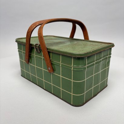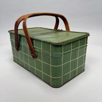 Two American Lithographed Tin Advertising Picnic Baskets with Wooden Swing Handles. Comprising a green plaid "EDUCATOR BAKERS OF CRAX/ MEGOWEN-EDUCATOR FOOD CO./ LOWELL & CAMBRIDGE MASS." basket; and a patriotic "Golden Cookies/ WATERTOWN, MASS." basket.
