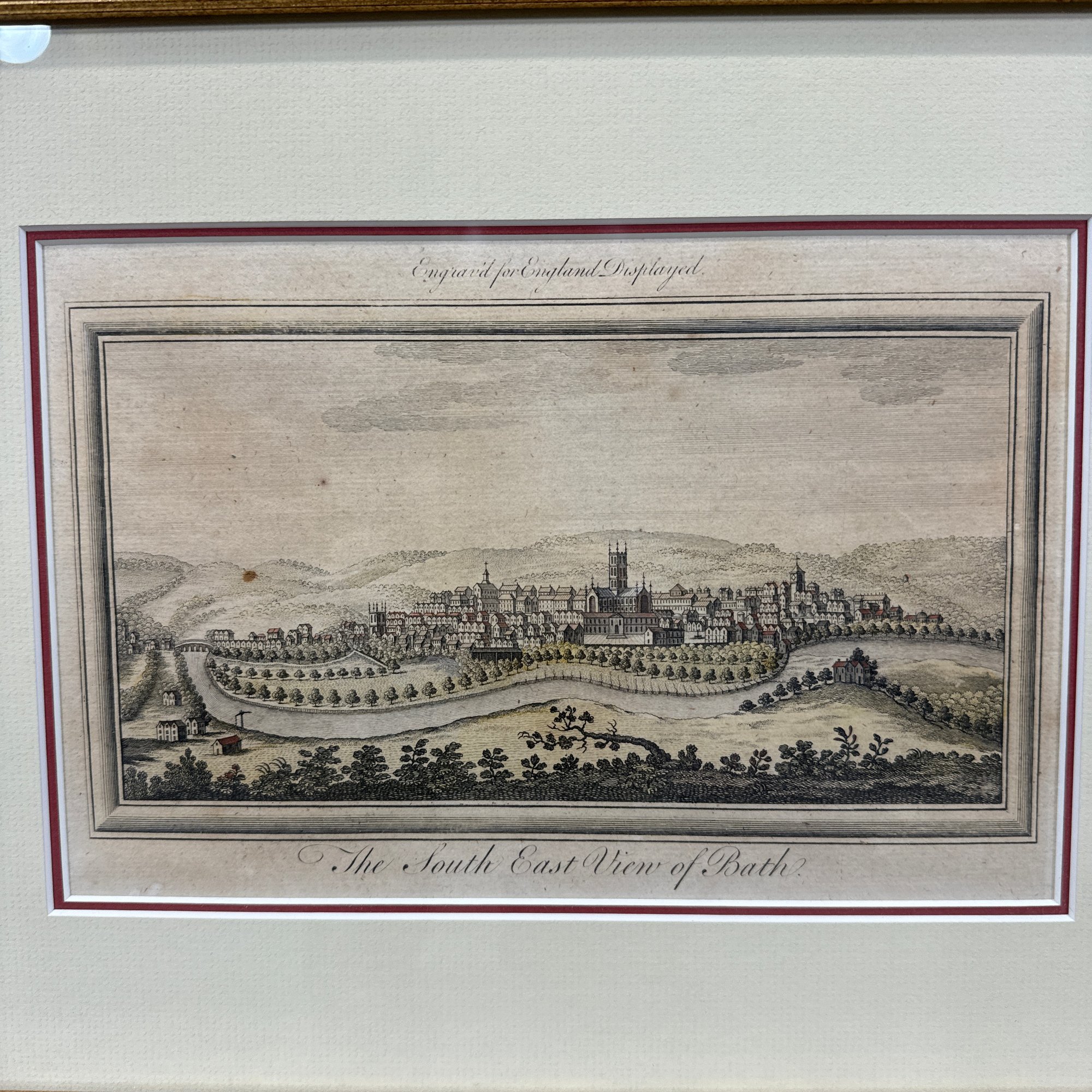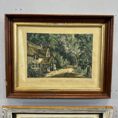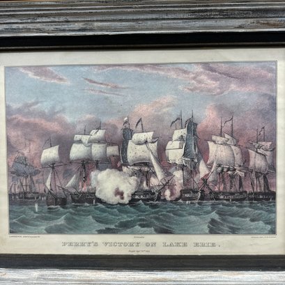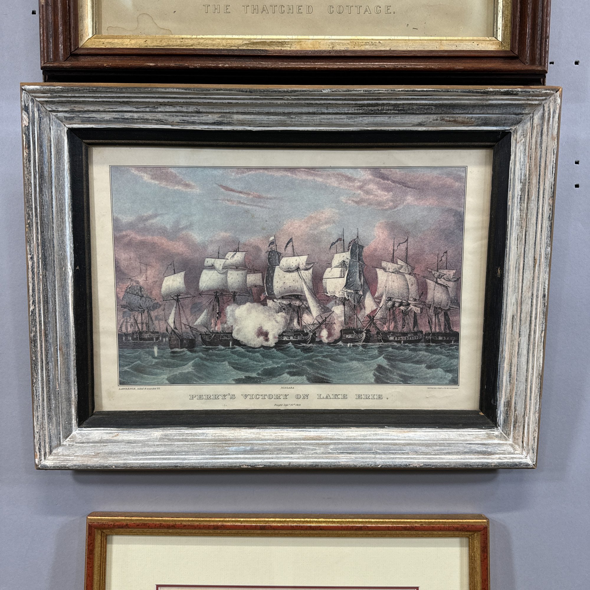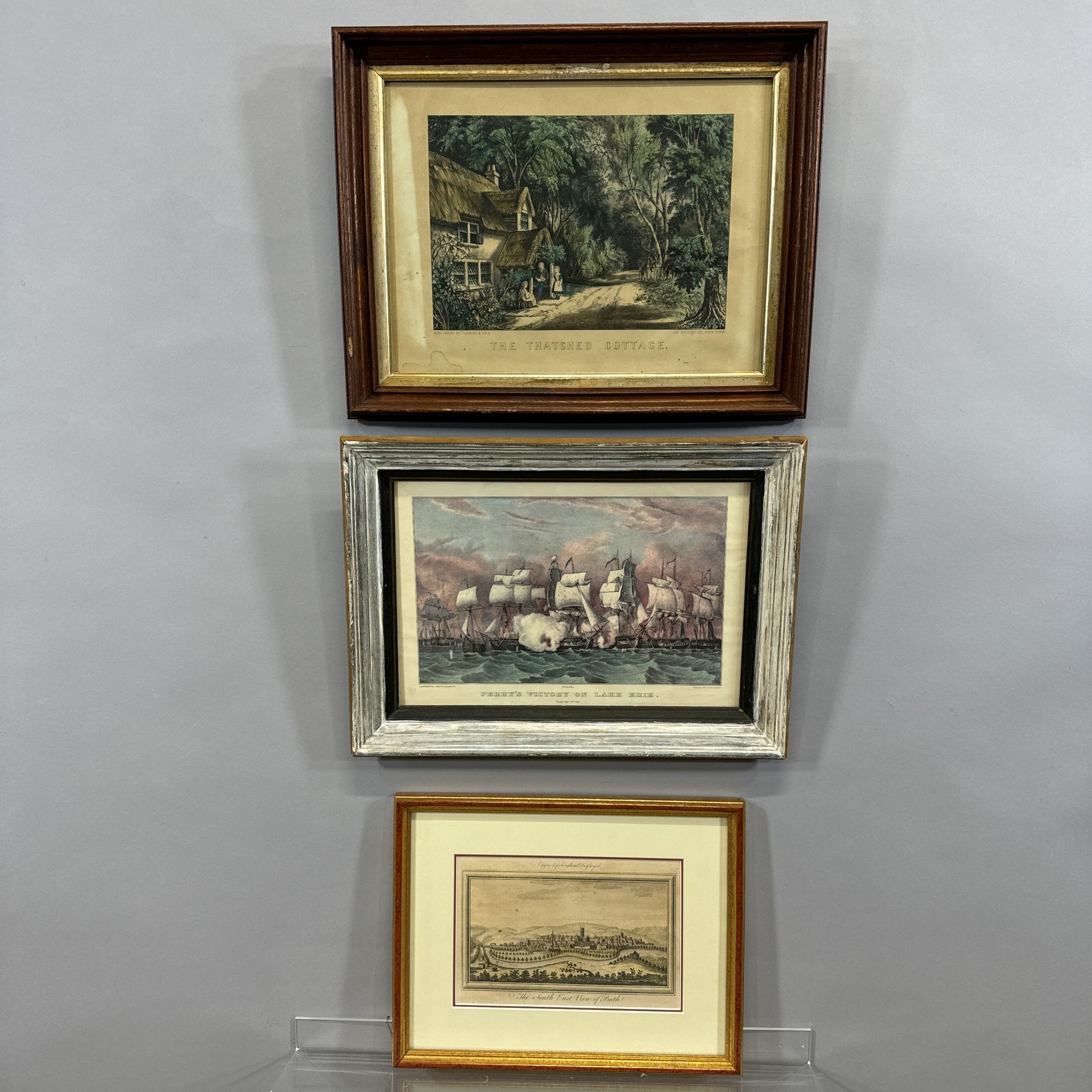 Two American Lithographs and an English Engraving. Comprising "Perry's Victory on Lake Erie," reprinted from the lithograph by N. Currier; "The Thatched Cottage," lithograph published by Currier & Ives, housed in a walnut shadowbox frame; and after J. Ryland, "The South East View of Bath," engraved for London Displayed.