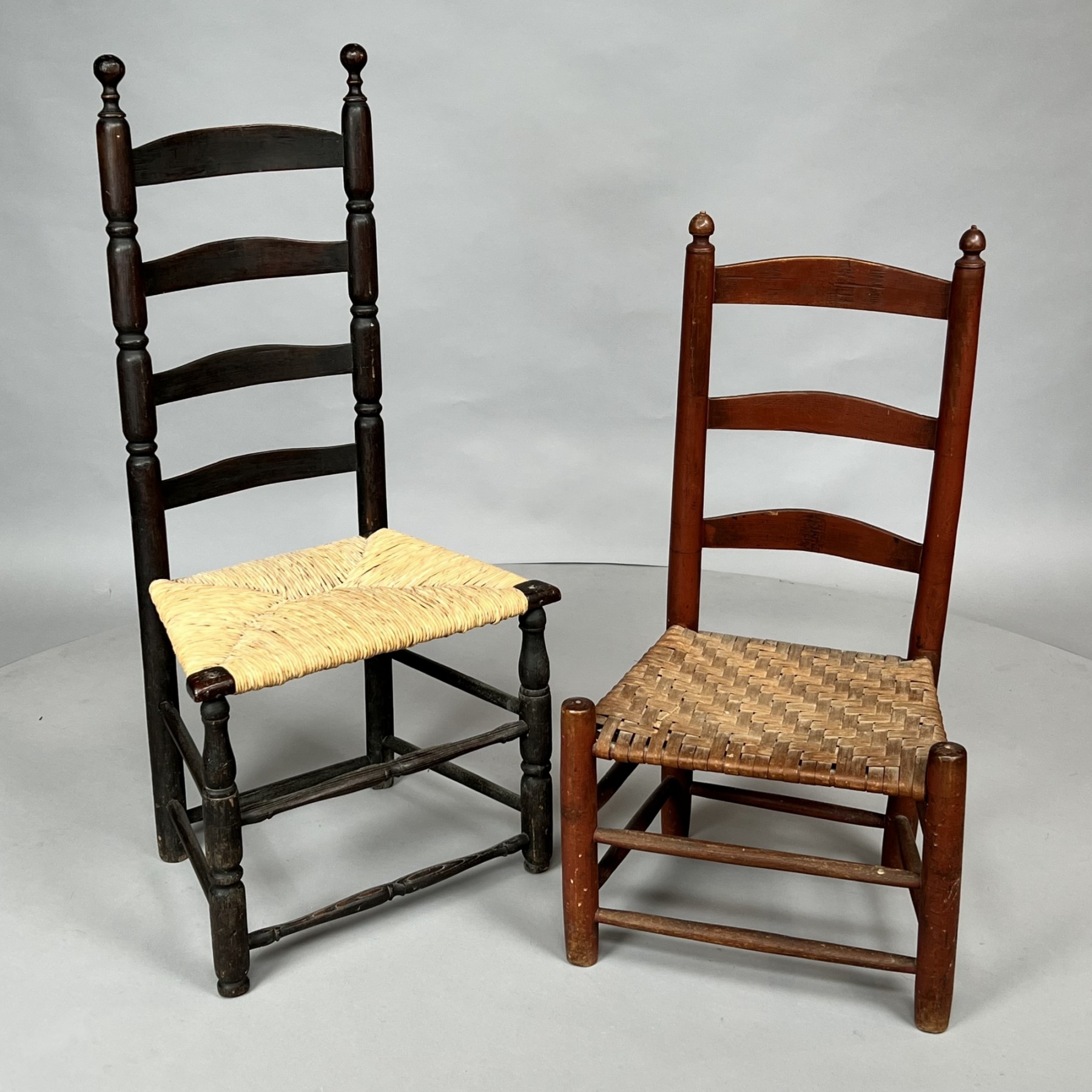 The first in black paint and with woven rush seat, the second in red paint with woven splint seat.