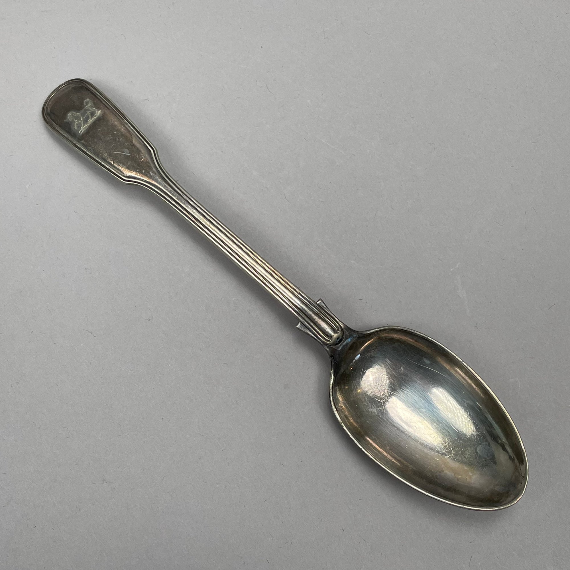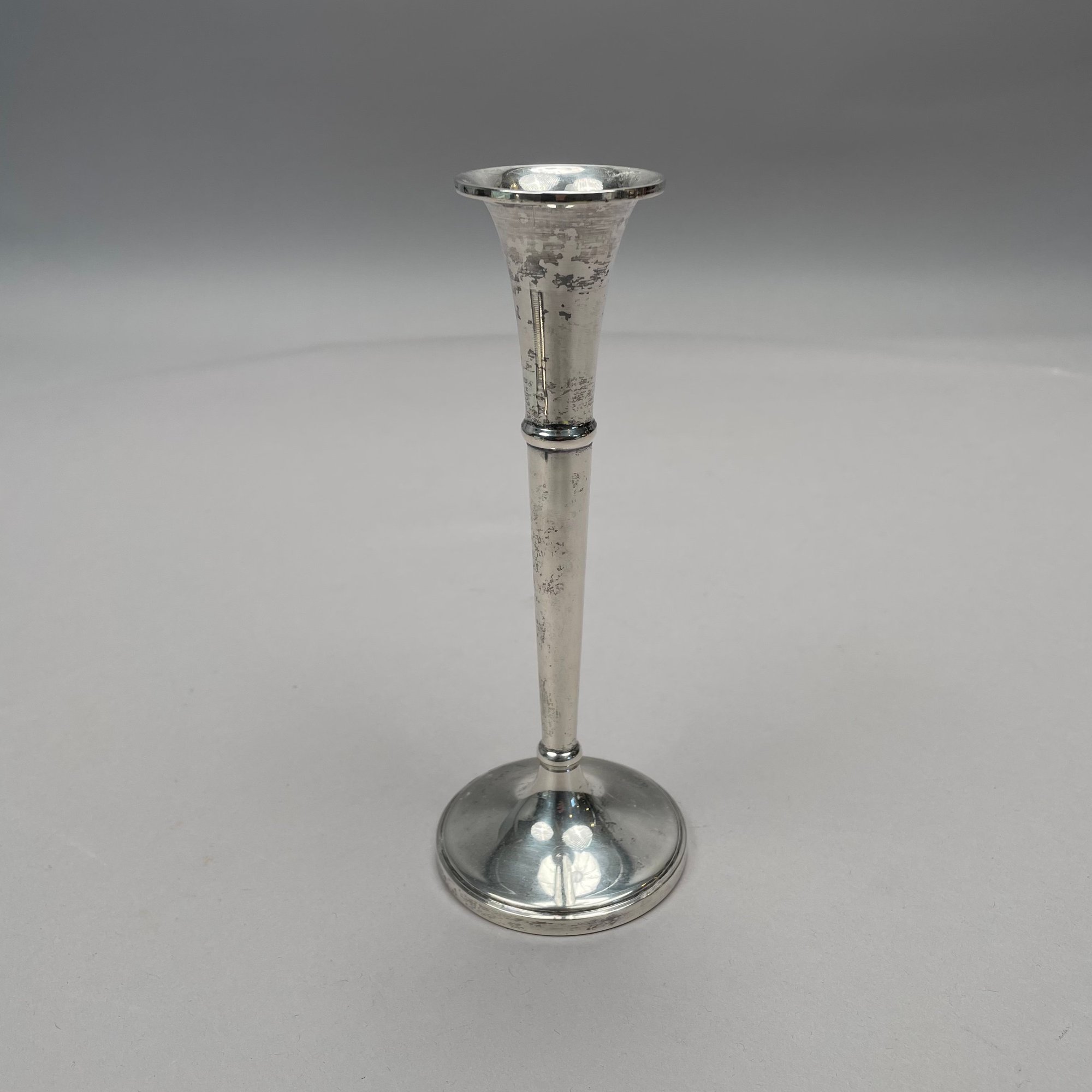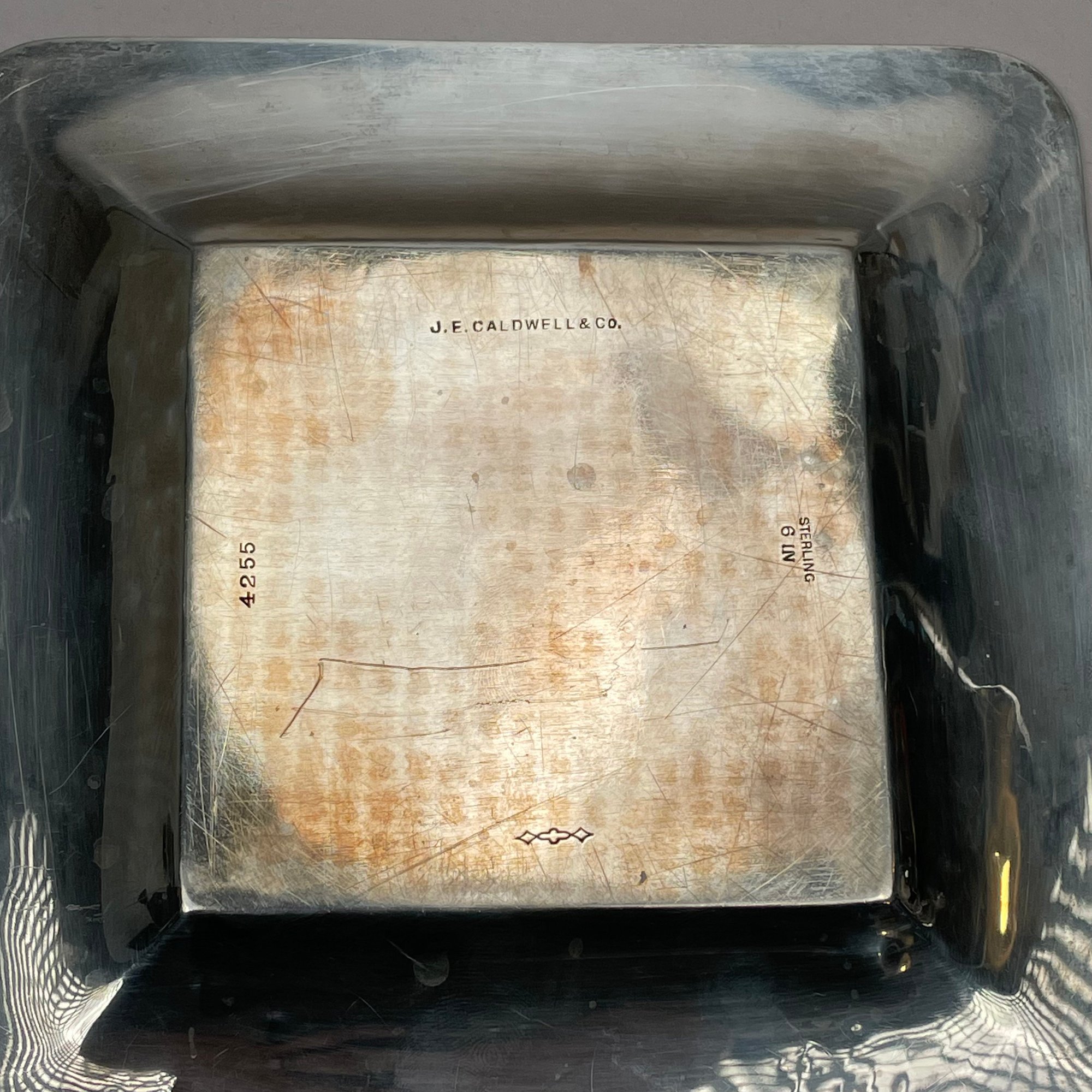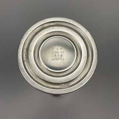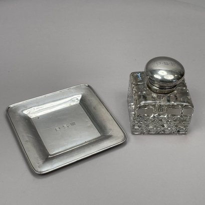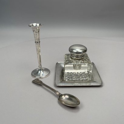 Two American Sterling Silver Table Articles and an Elkington & Co. Silverplate Tablespoon, Twentieth Century. Comprising an inkwell and square liner, J.E. Caldwell & Co., each engraved with the initials "P.S.W.," pattern "4255;" a weighted bud vase, Baldwin & Miller, Inc., Newark, New Jersey; and an English silverplate tablespoon. (4)