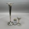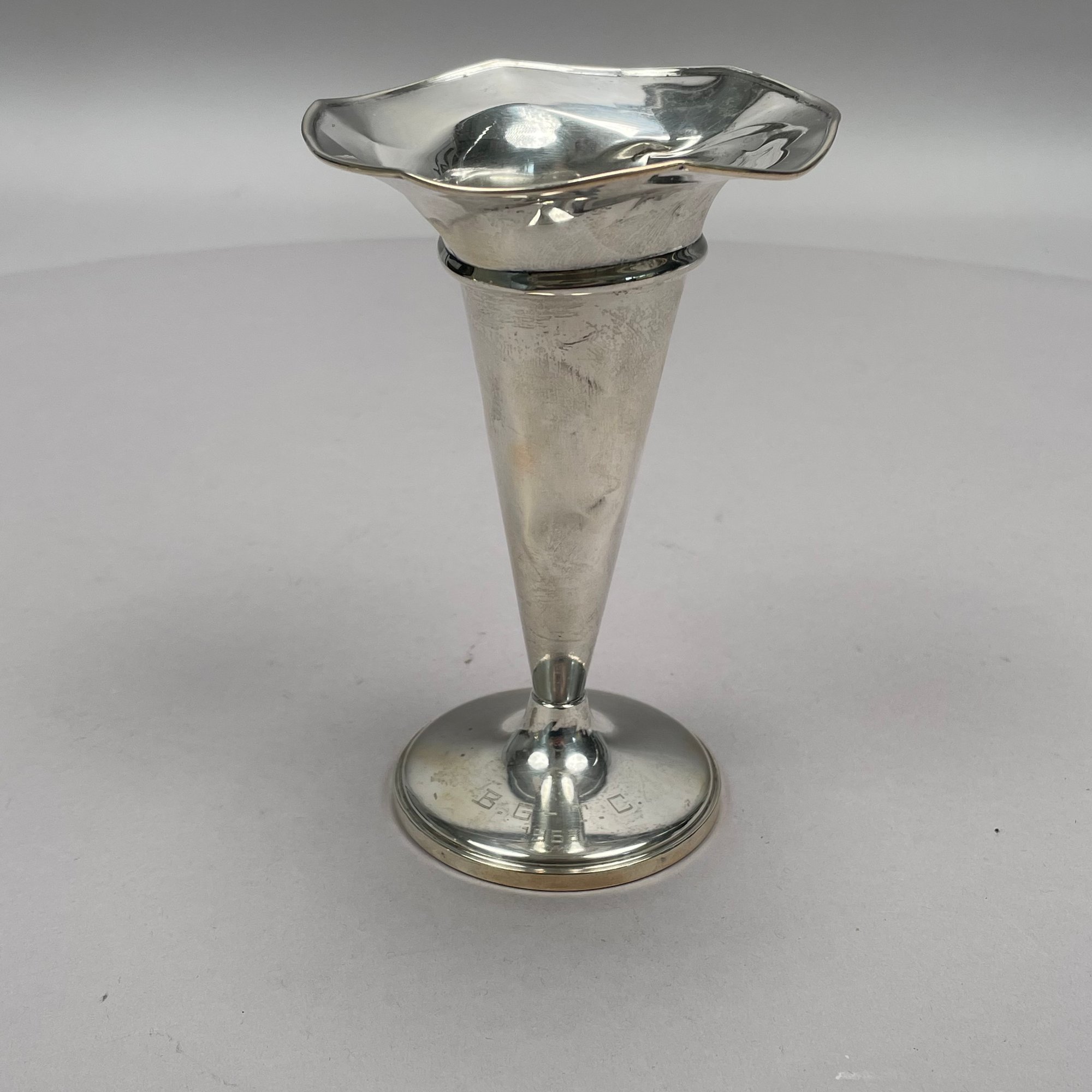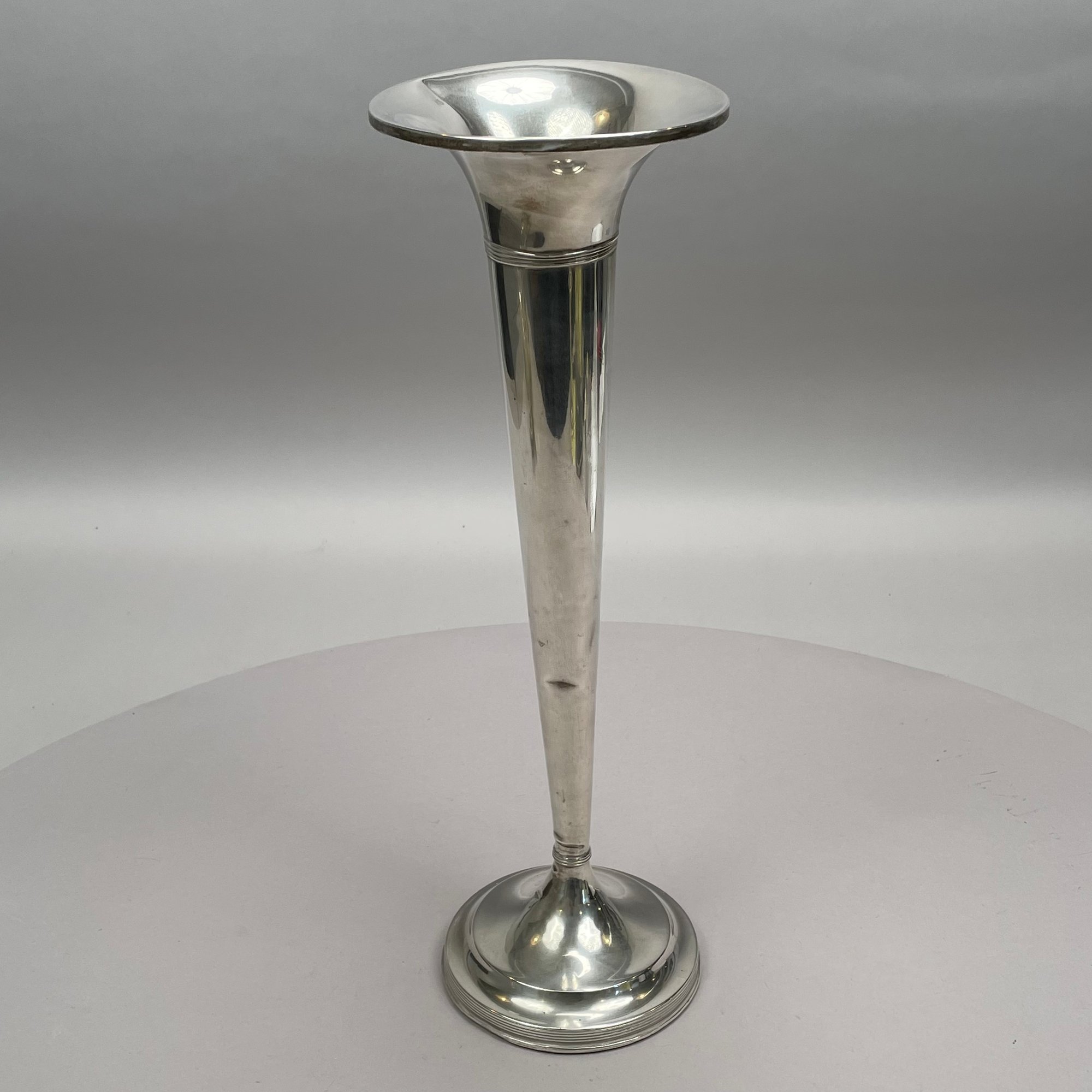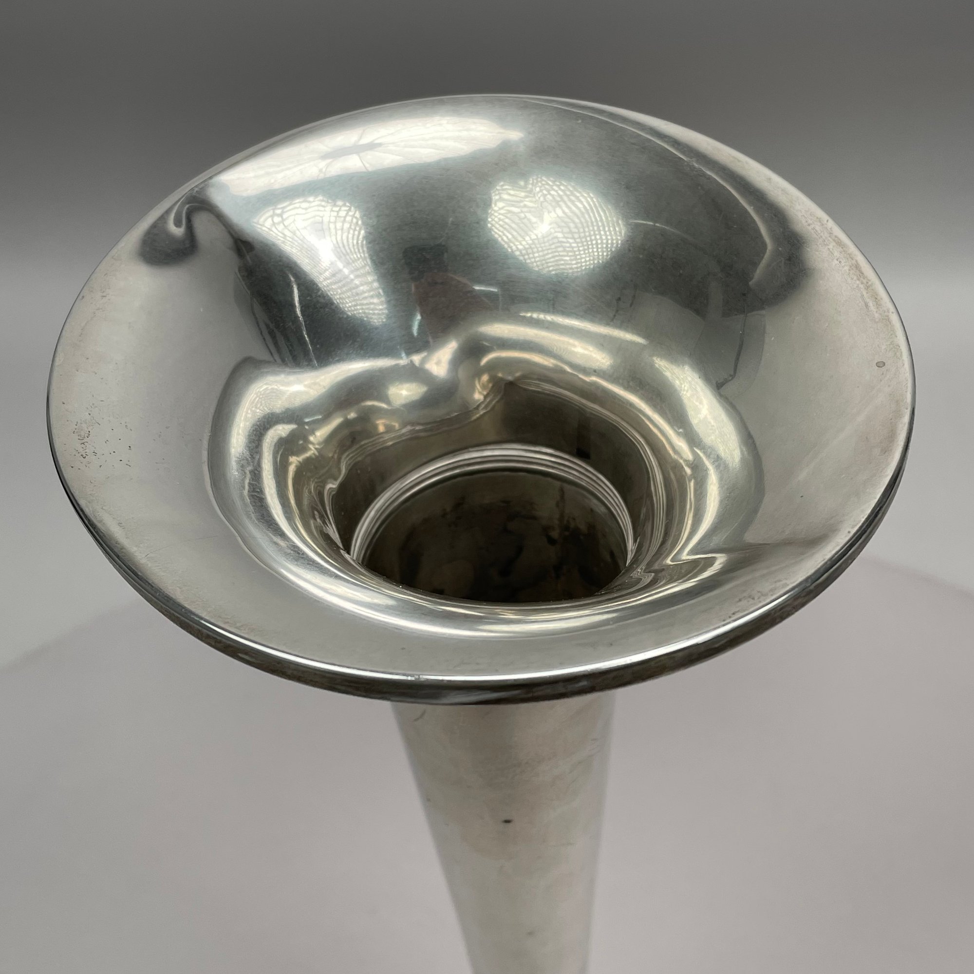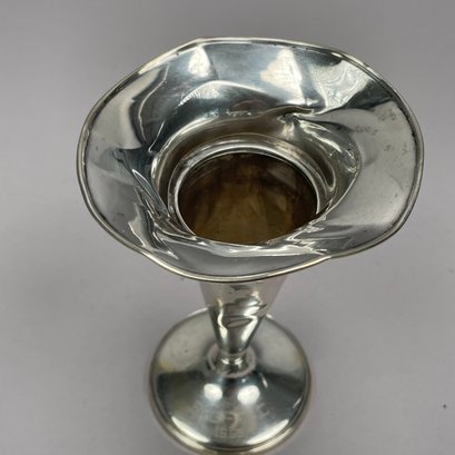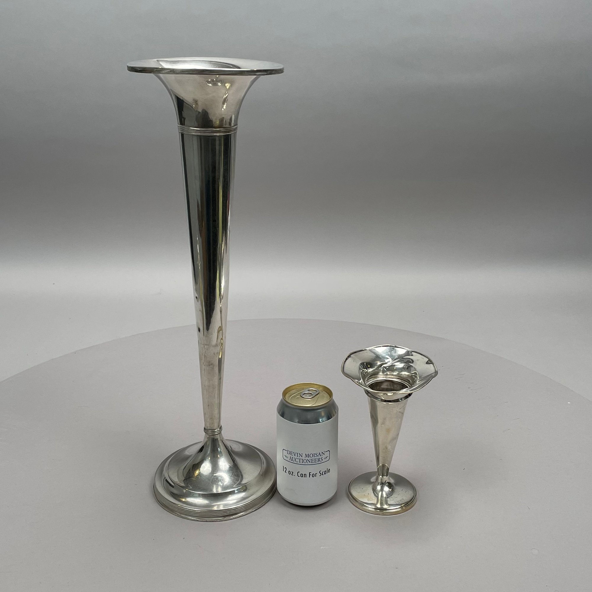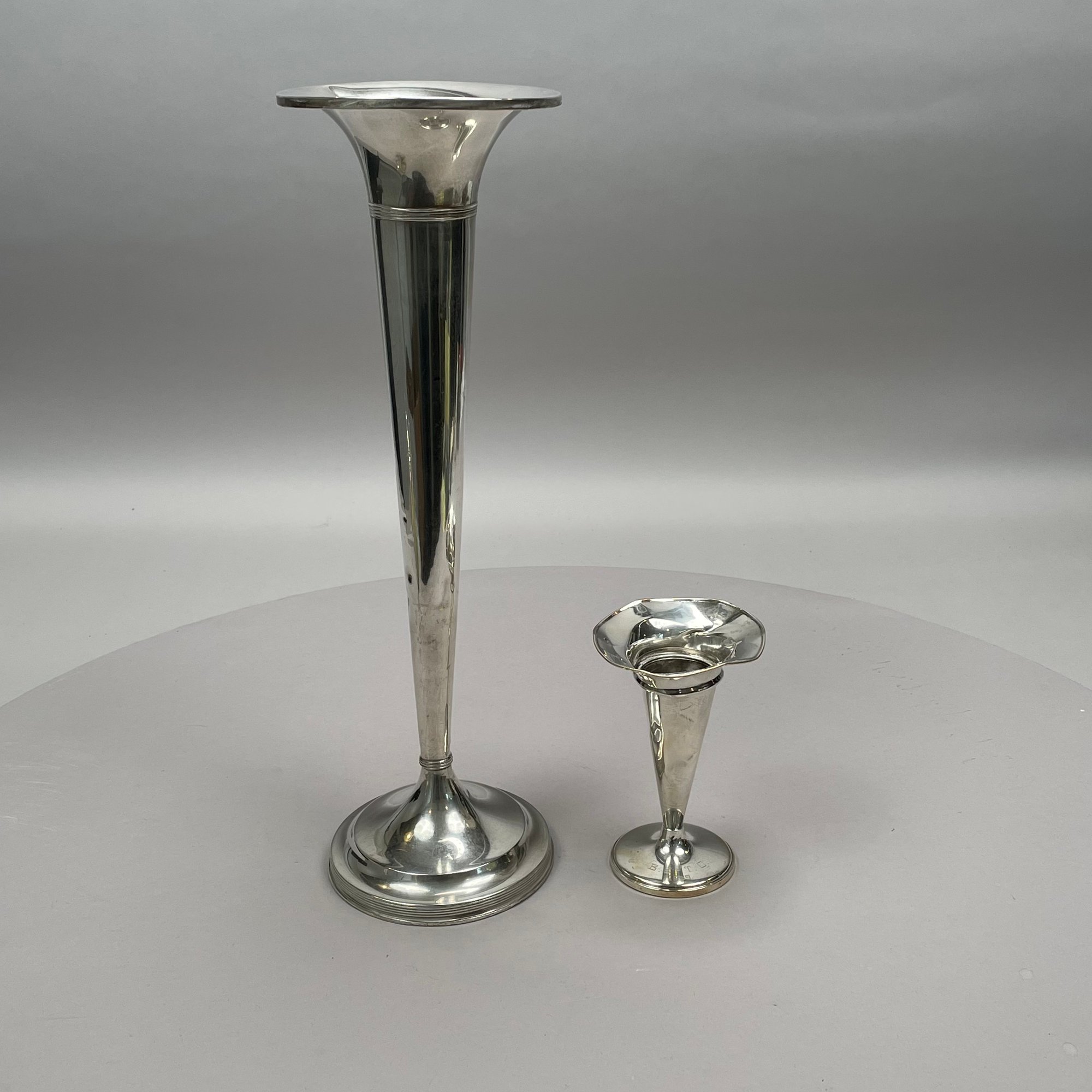 Two American Sterling Silver Trumpet Vases, Twentieth Century. The smallest Fisher Silversmiths, Inc., Jersey City, New Jersey, engraved around the base ""B.G. - T.C./ 1969; the tallest Matthews Co., Newark, New Jersey, both marked.