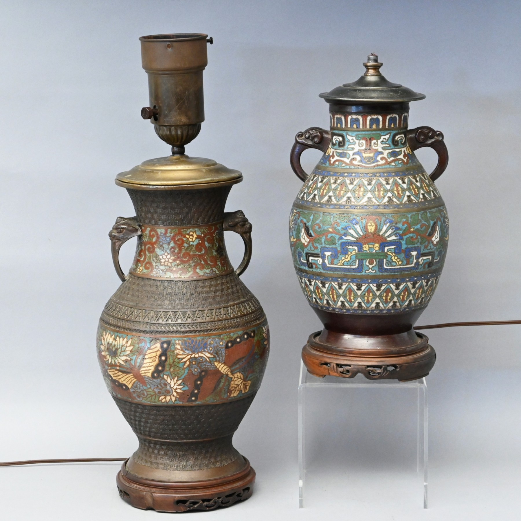 Each decorated with polychrome enamels, affixed with figural handles.