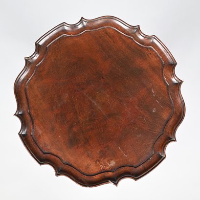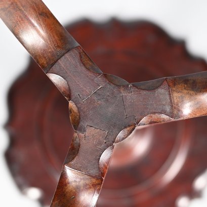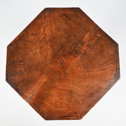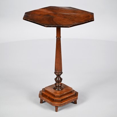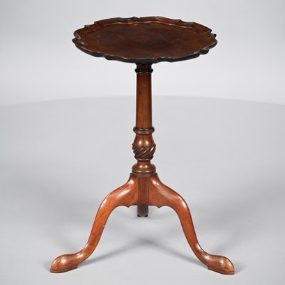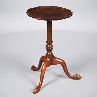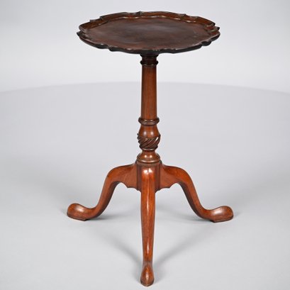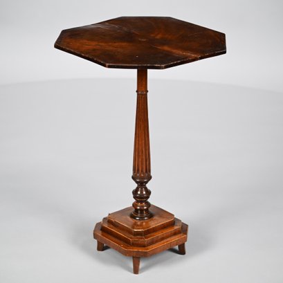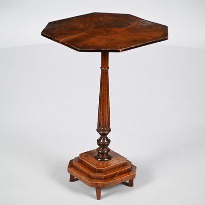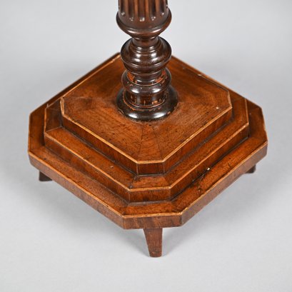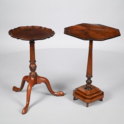 Queen Anne Style Walnut Candlestand and a William IV Burl Walnut Candlestand. The first piecrust top above a partly-spiral urn standard, raised on cabriole legs ending in pointed pad feet; the second with octagonal top above a flared fluted standard, set on a stepped plinth raised on slightly curved feet.