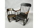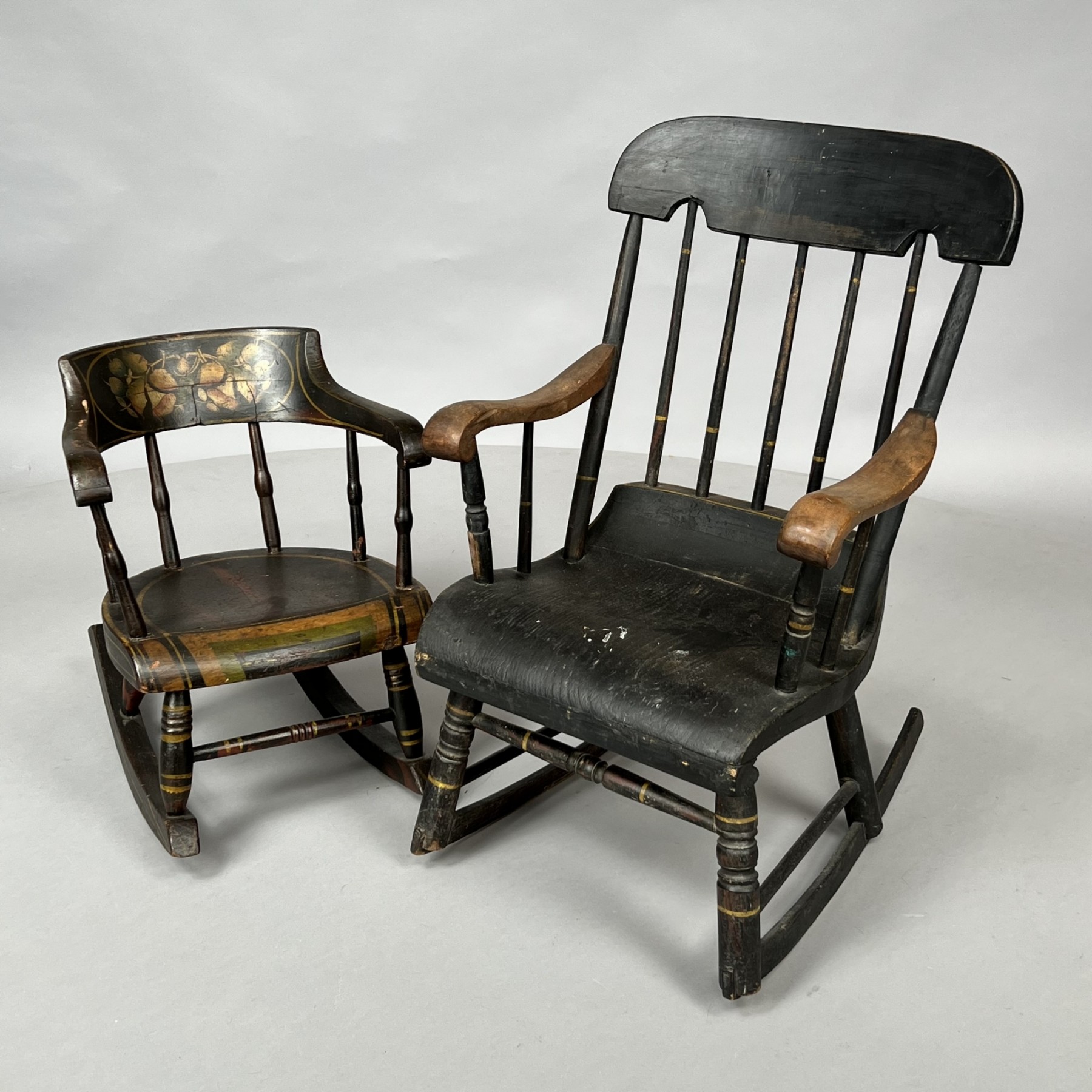 The first a firehouse Windsor with stencil decorated crest rail extending to arms above a plank seat raised on turned legs on rockers. The second a spindle back Windsor, the arched crest rail above a five spindle back, shaped arms and a plank seat, raised on turned legs on rockers.