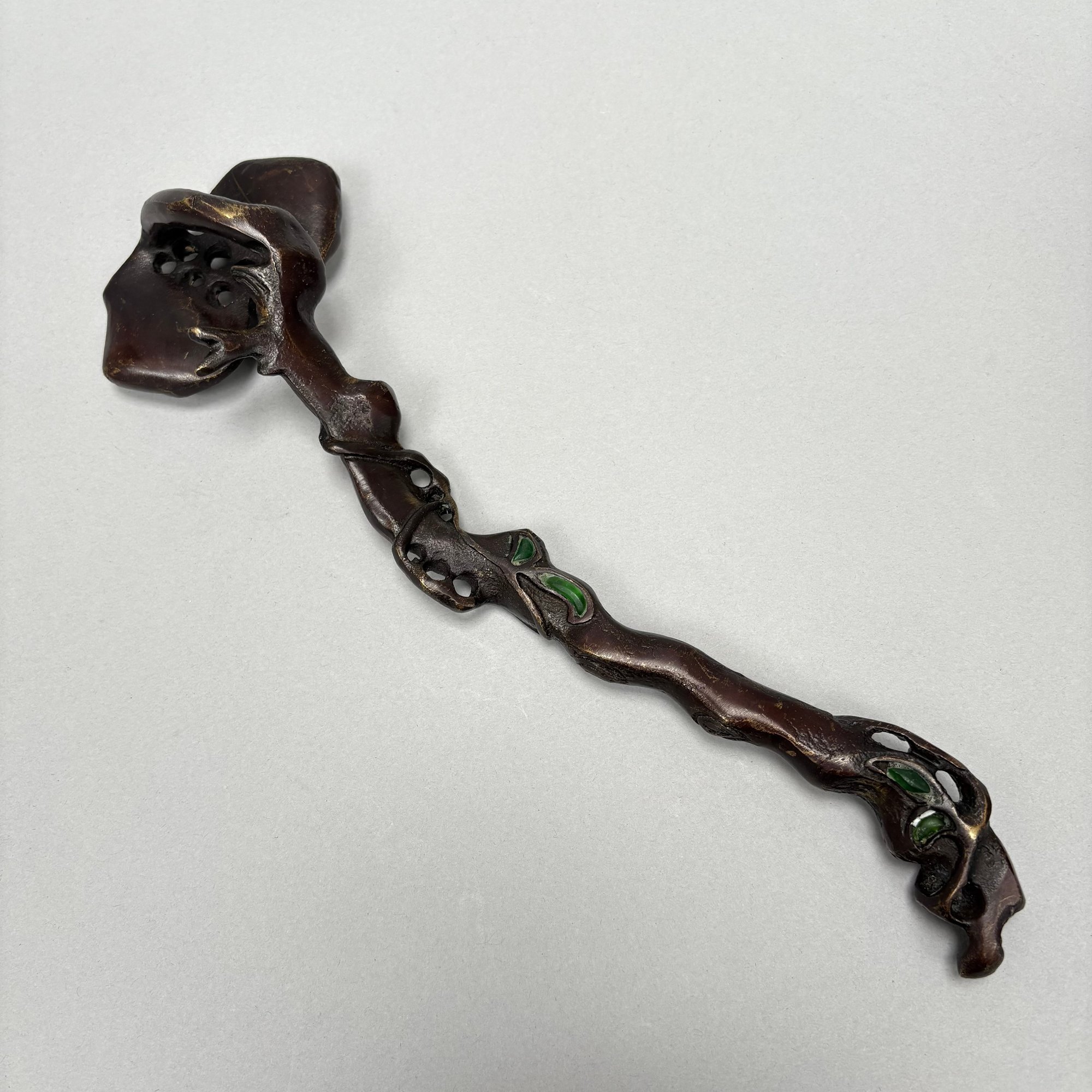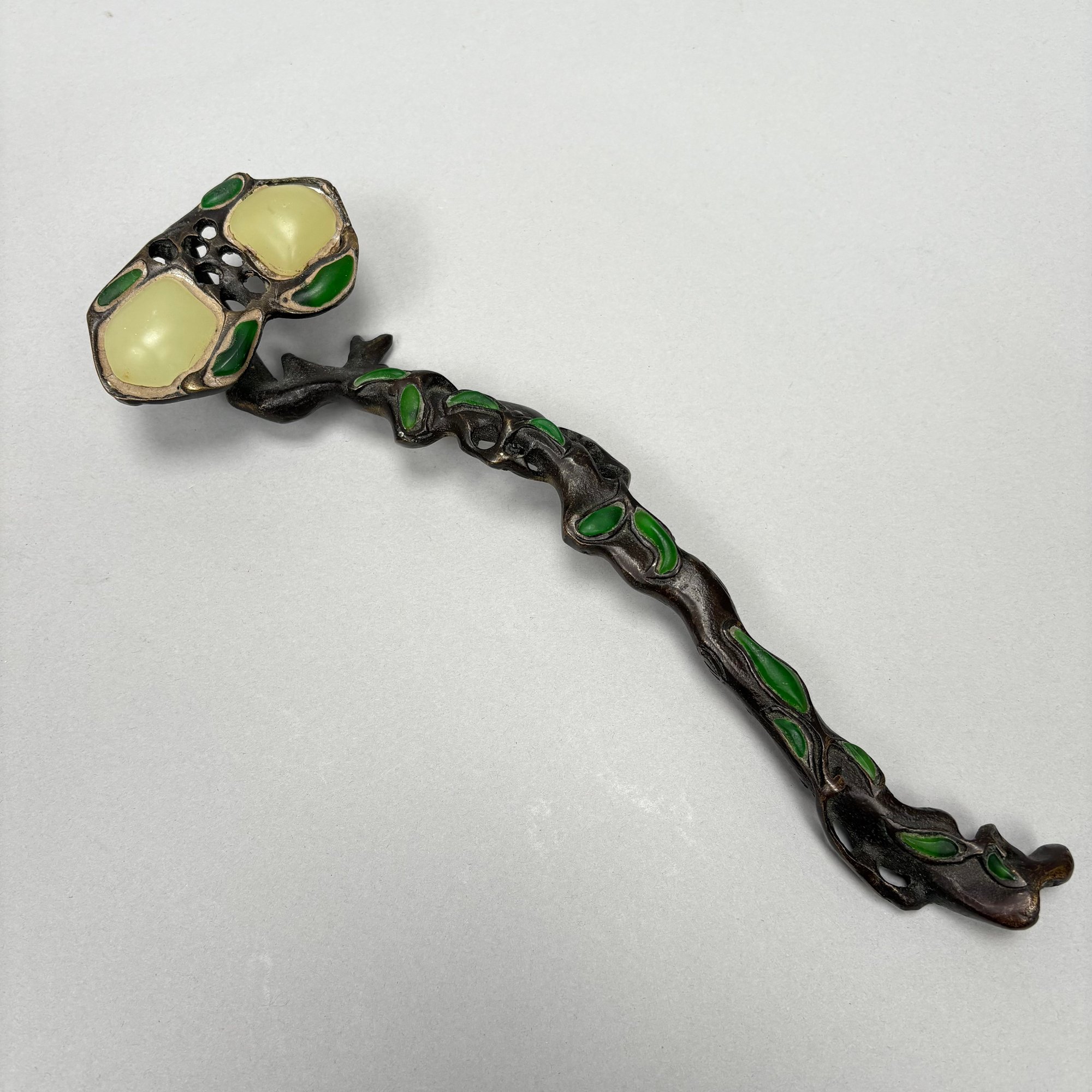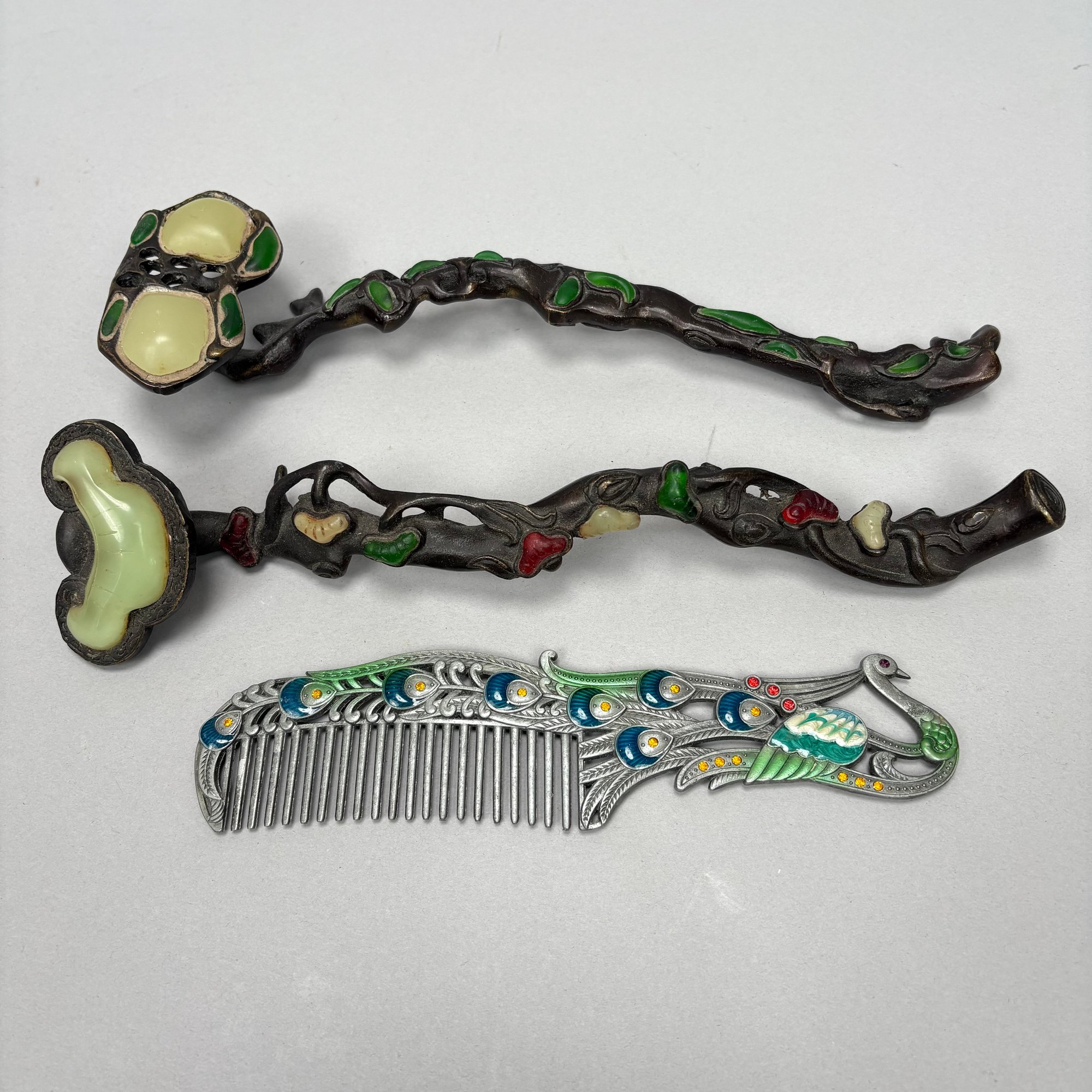 Two Chinese Bronze and Hardstone-Mounted Ruyi Head Scepters and an Enamelled Peacock Comb.