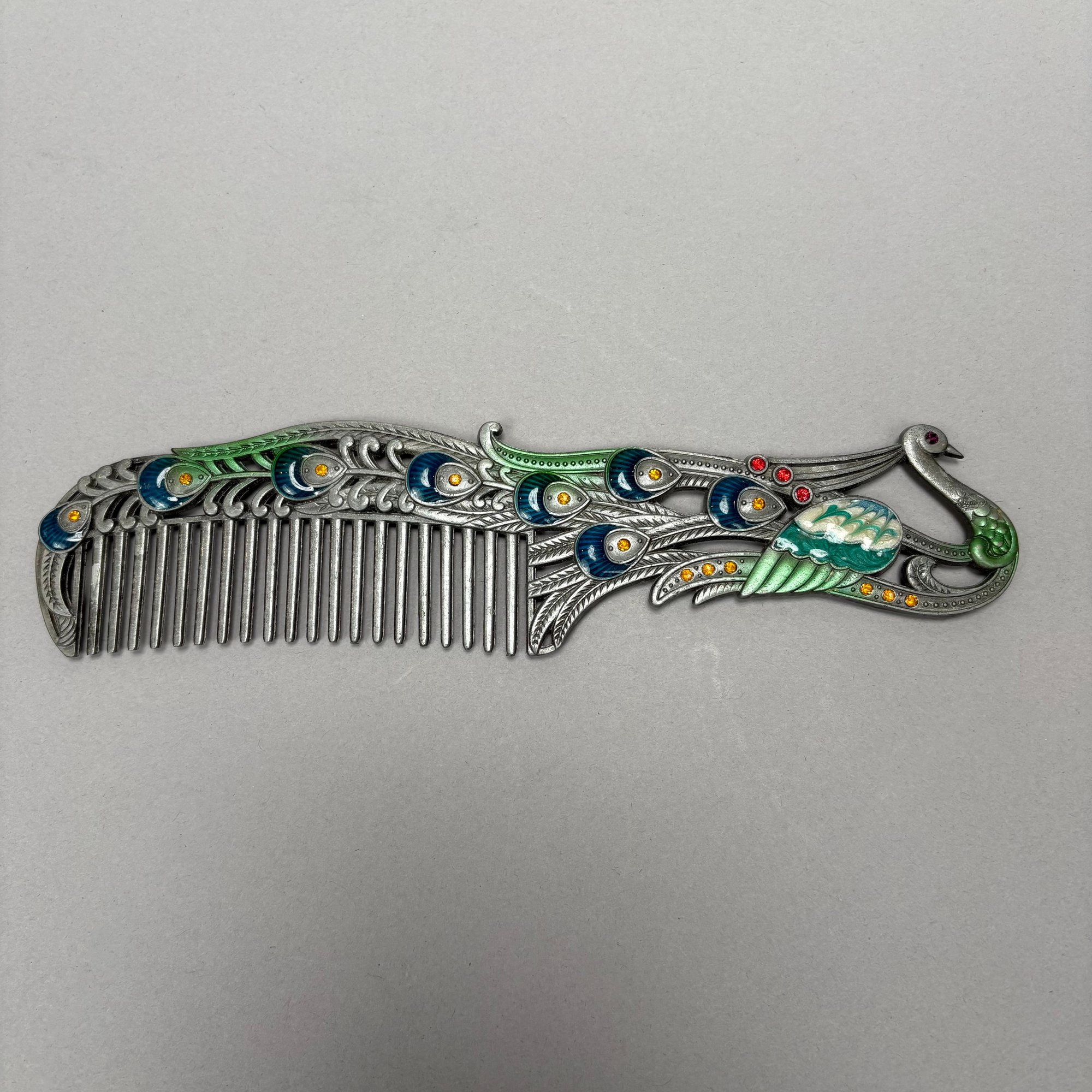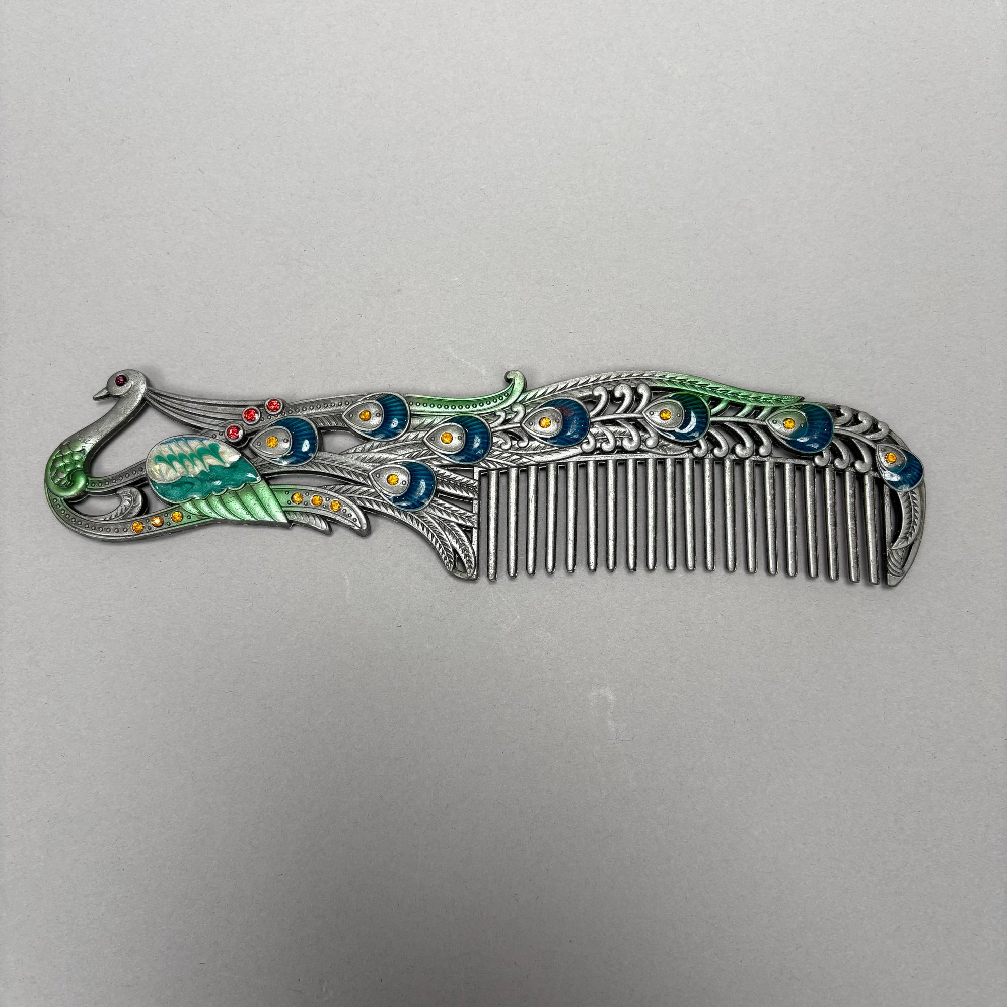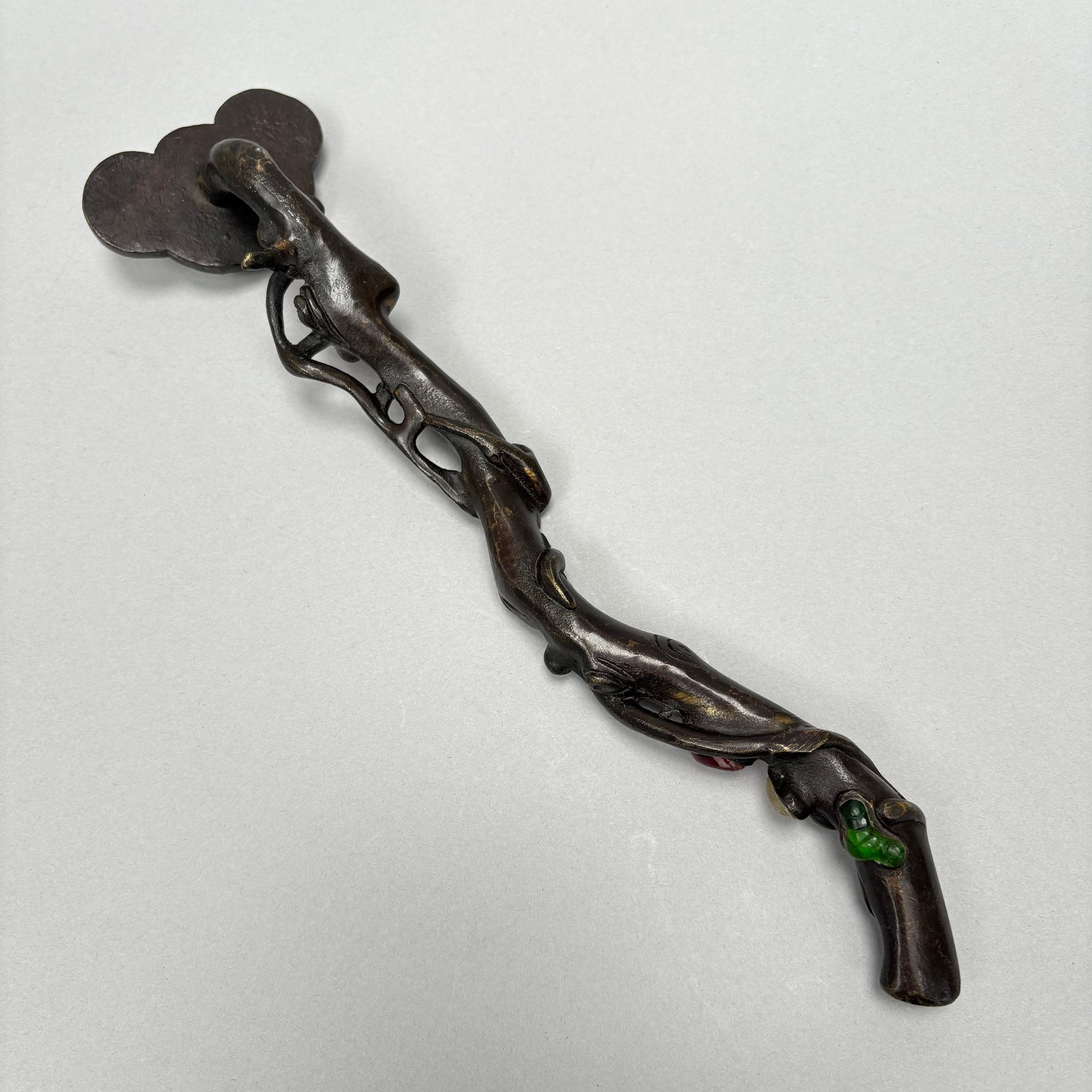 Two Chinese Bronze and Hardstone-Mounted Ruyi Head Scepters and an Enamelled Peacock Comb.
