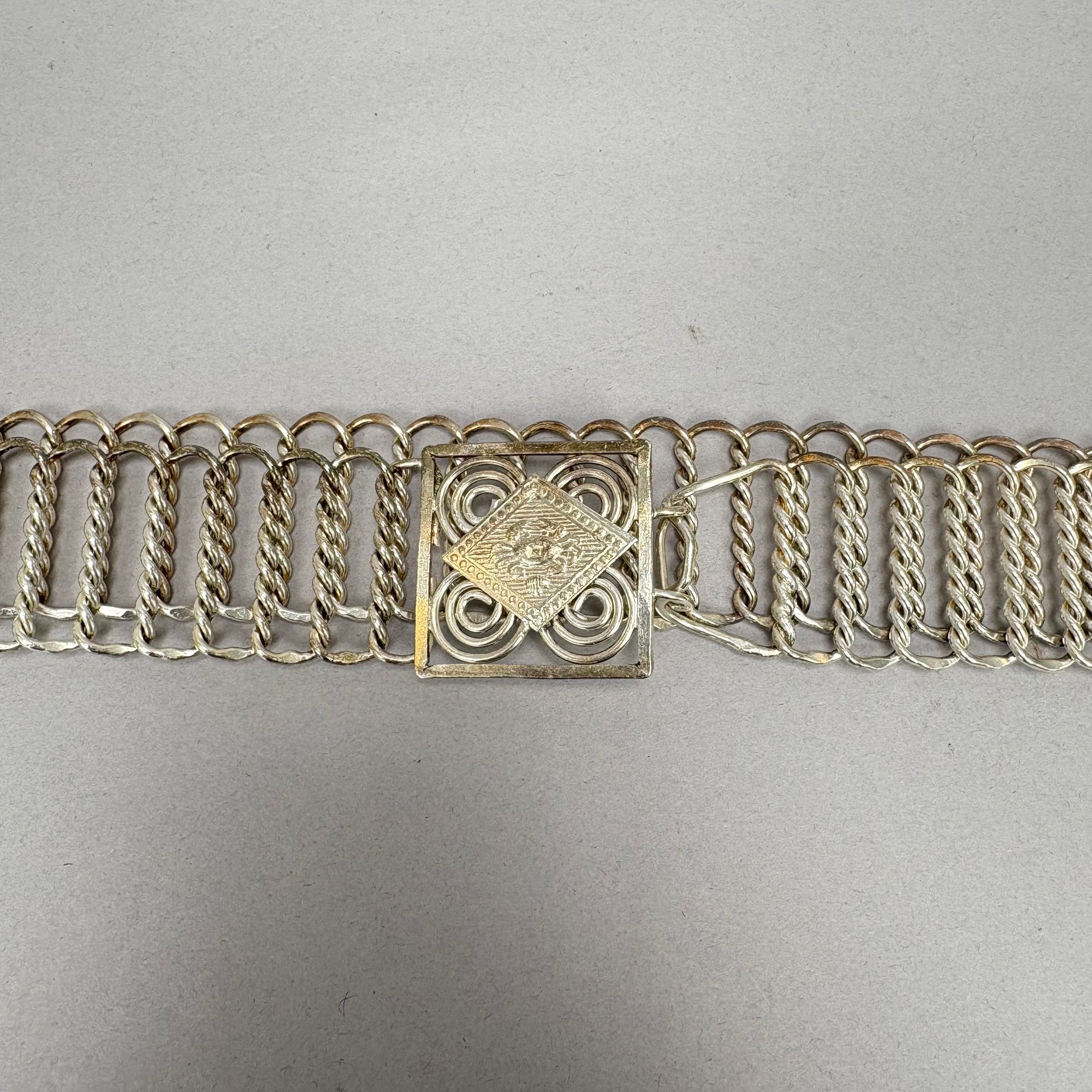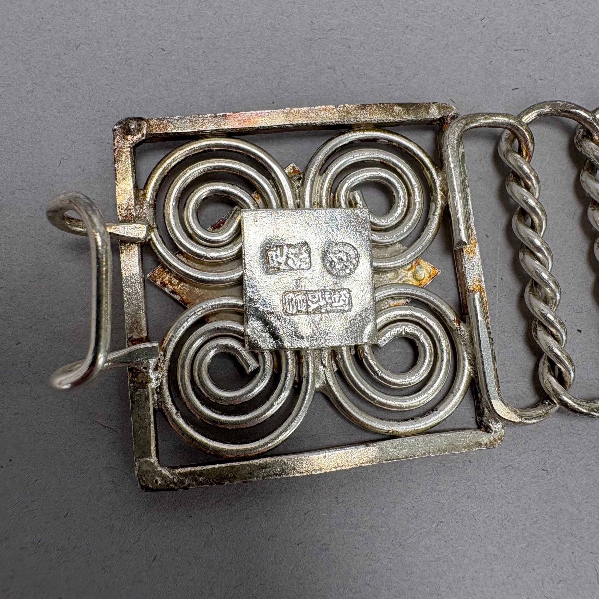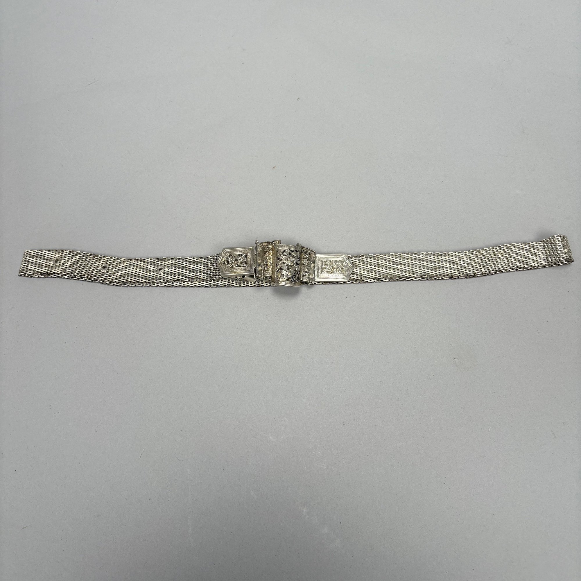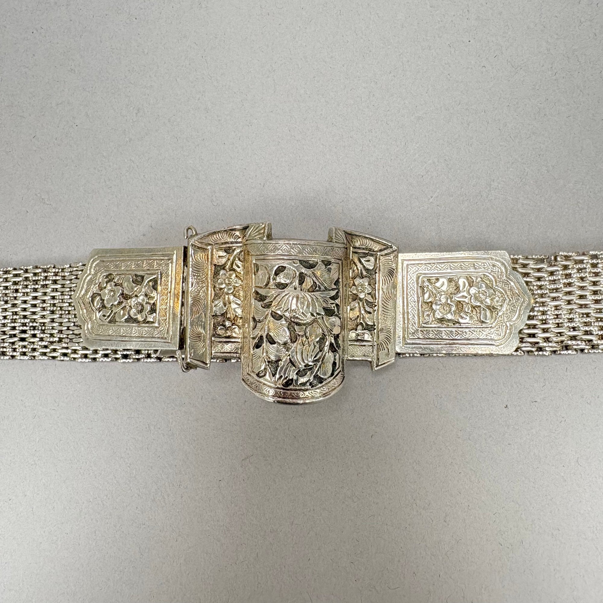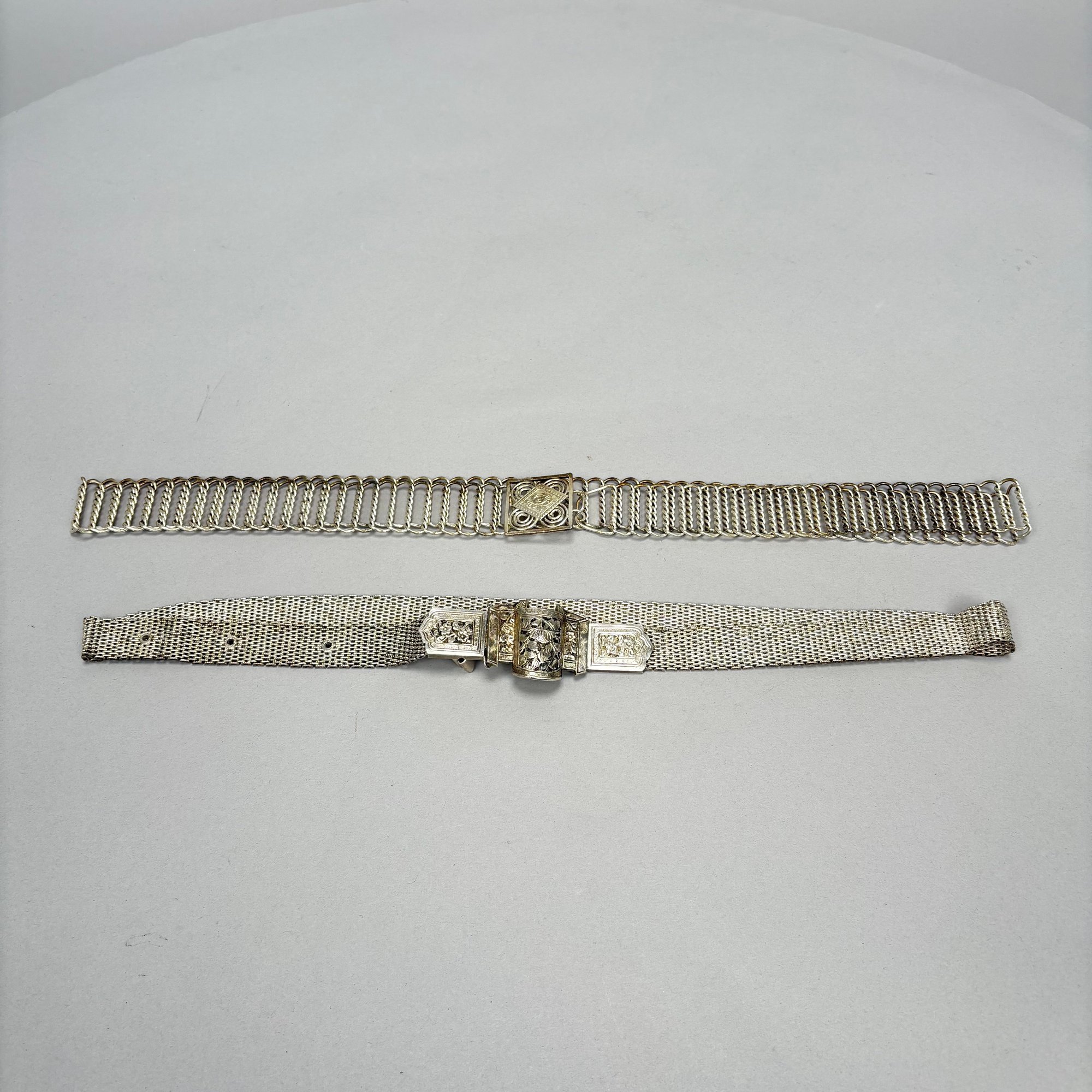 Two Chinese Silver Belts. One chased and engraved with flowers and floral sprays, each marked on the buckle.