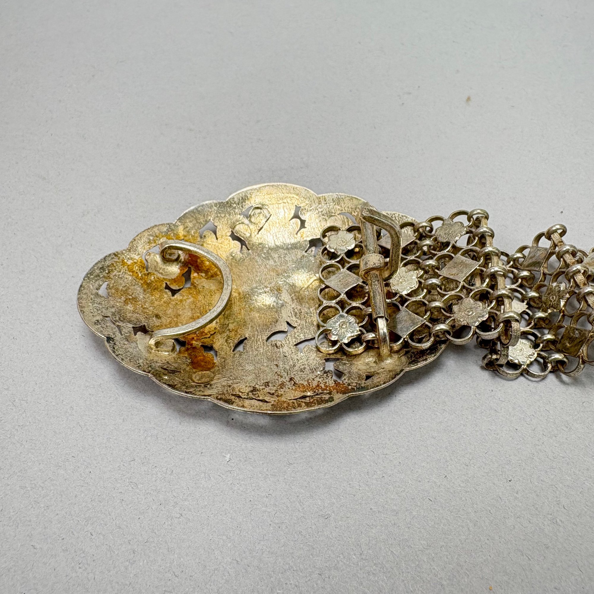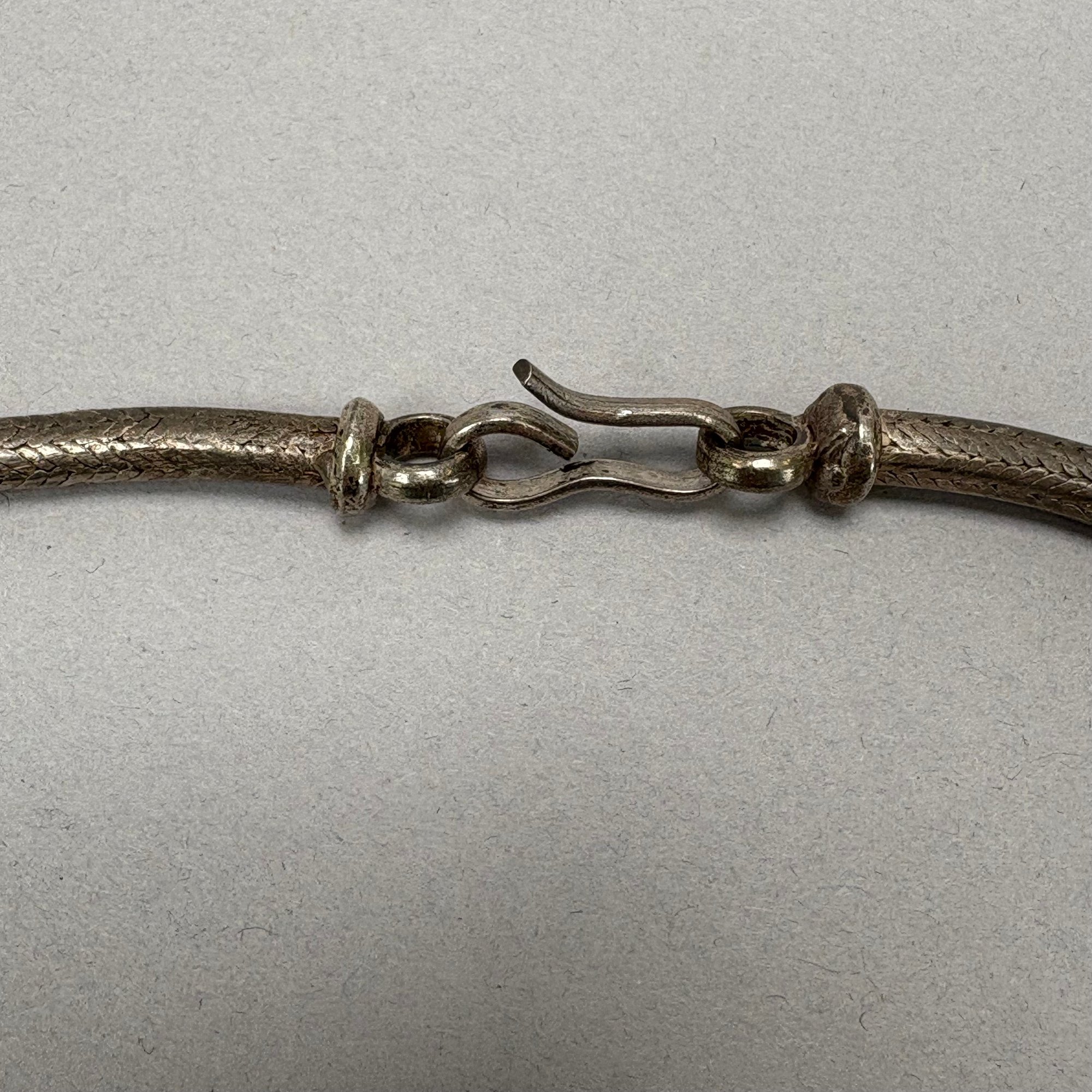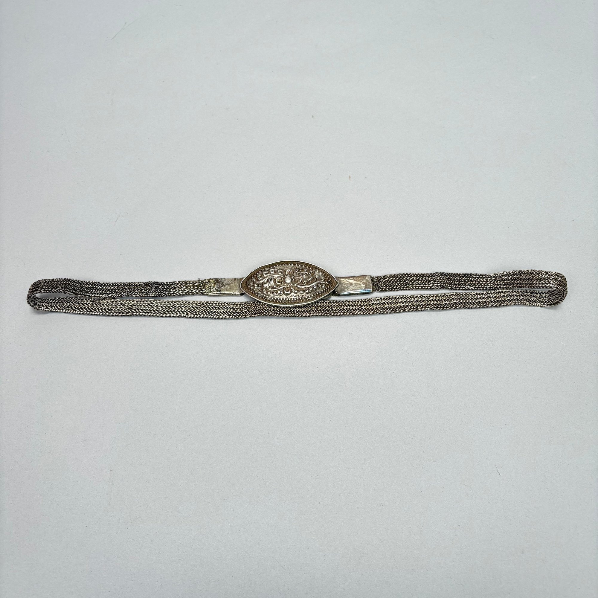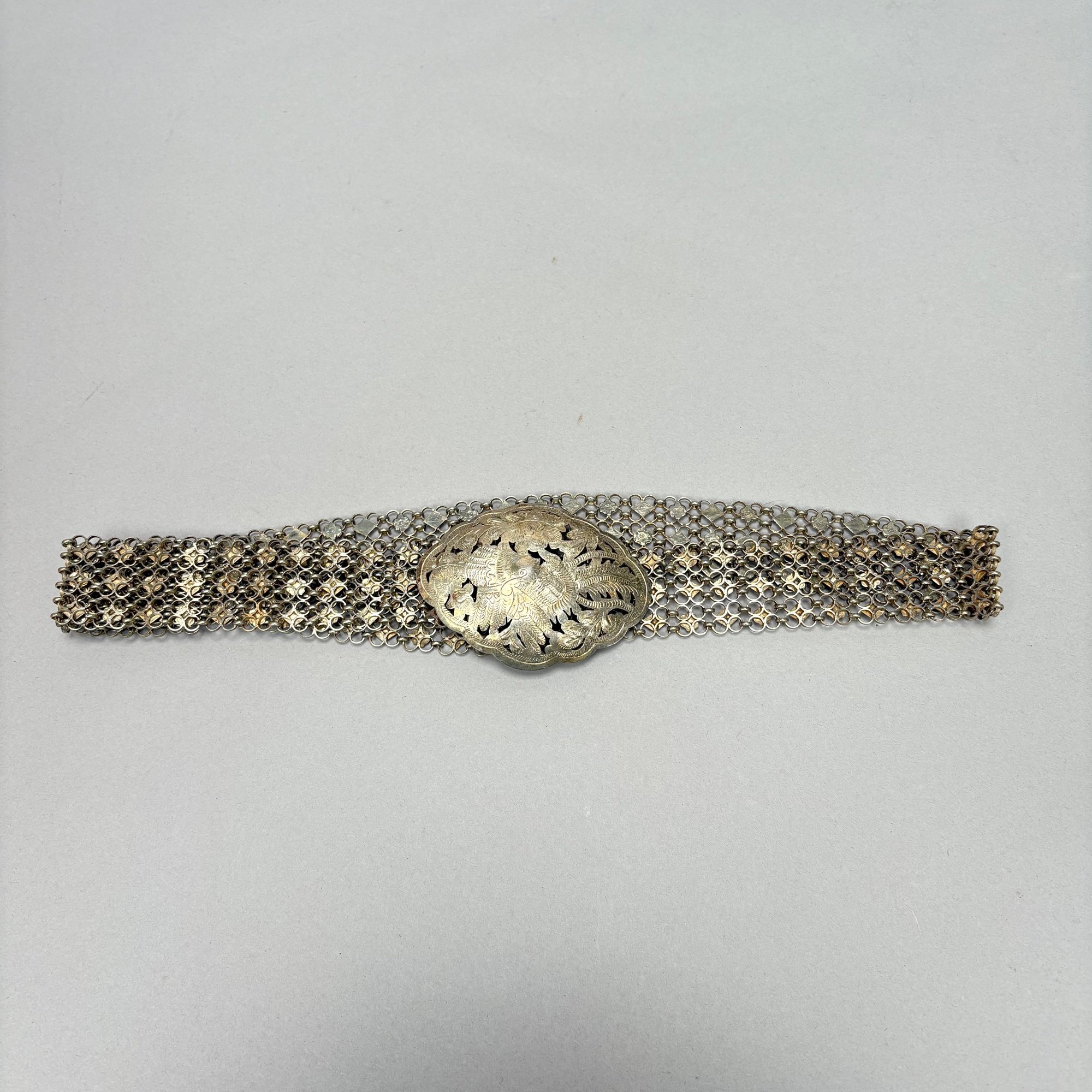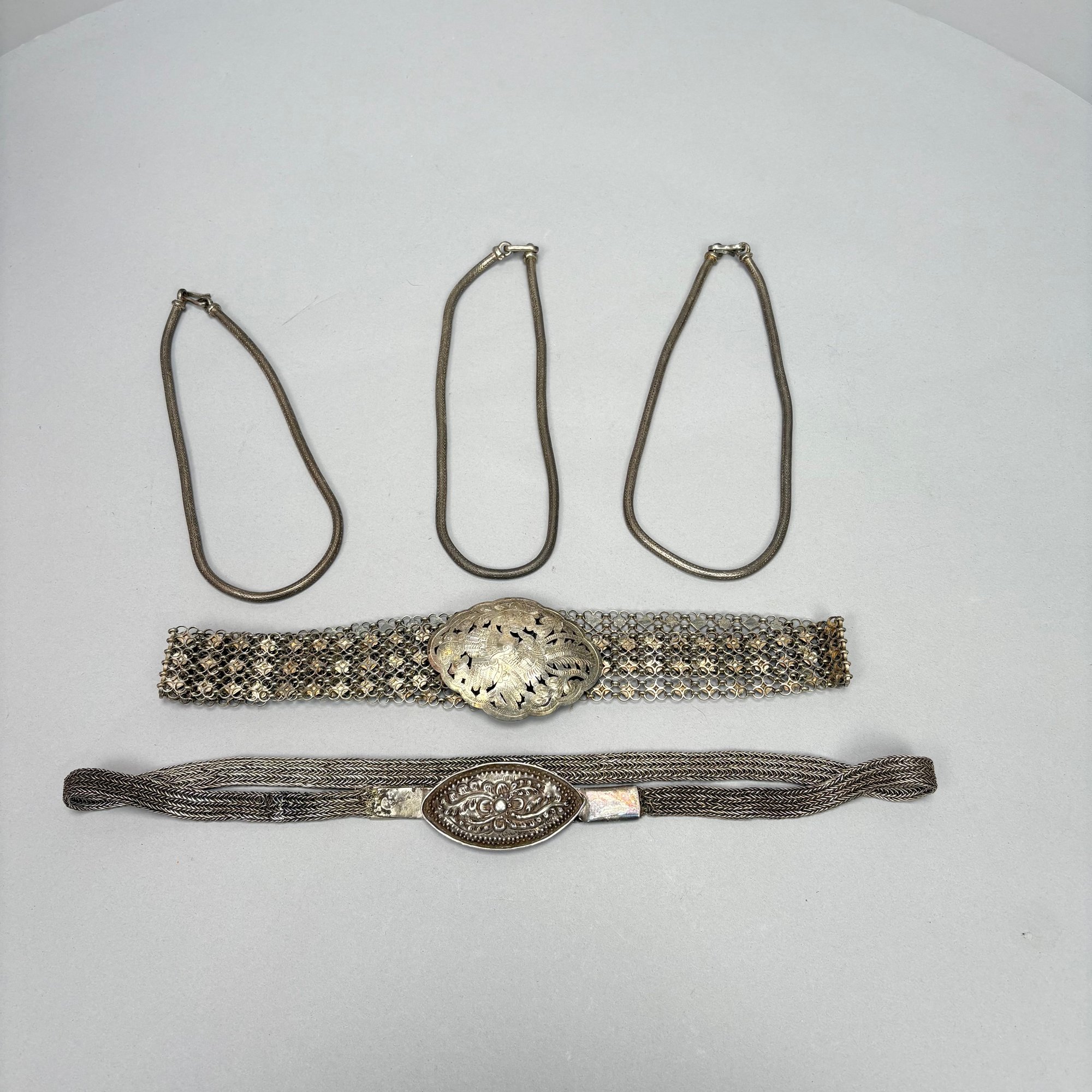 Two Chinese Silver Belts and Three Chokers. The longest belt with buckle pierced and engraved with a phoenix, flowers and leaves, all unmarked.