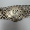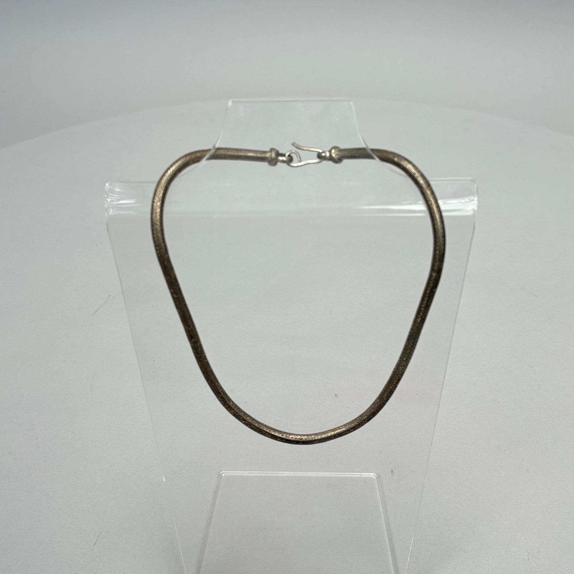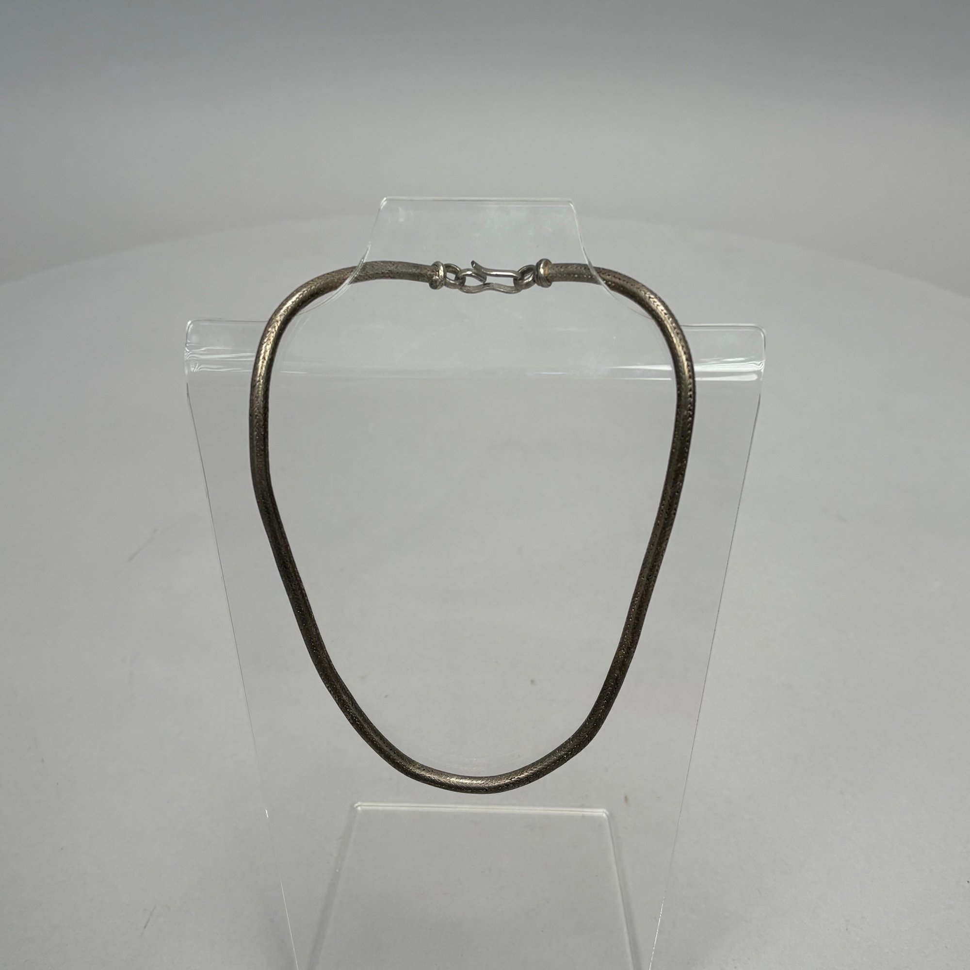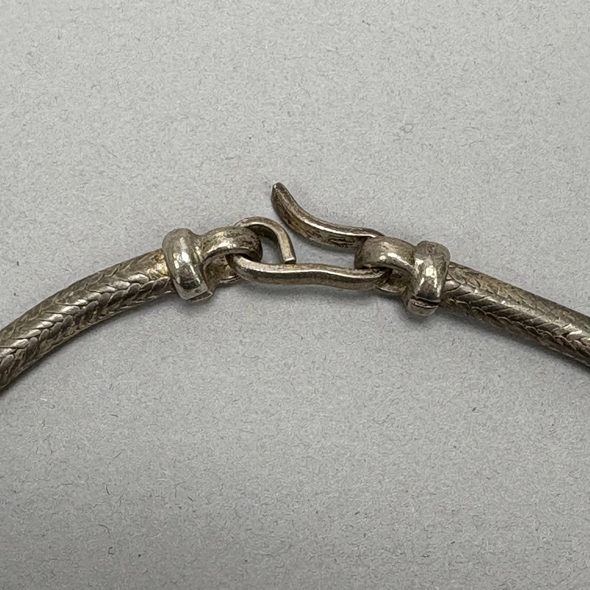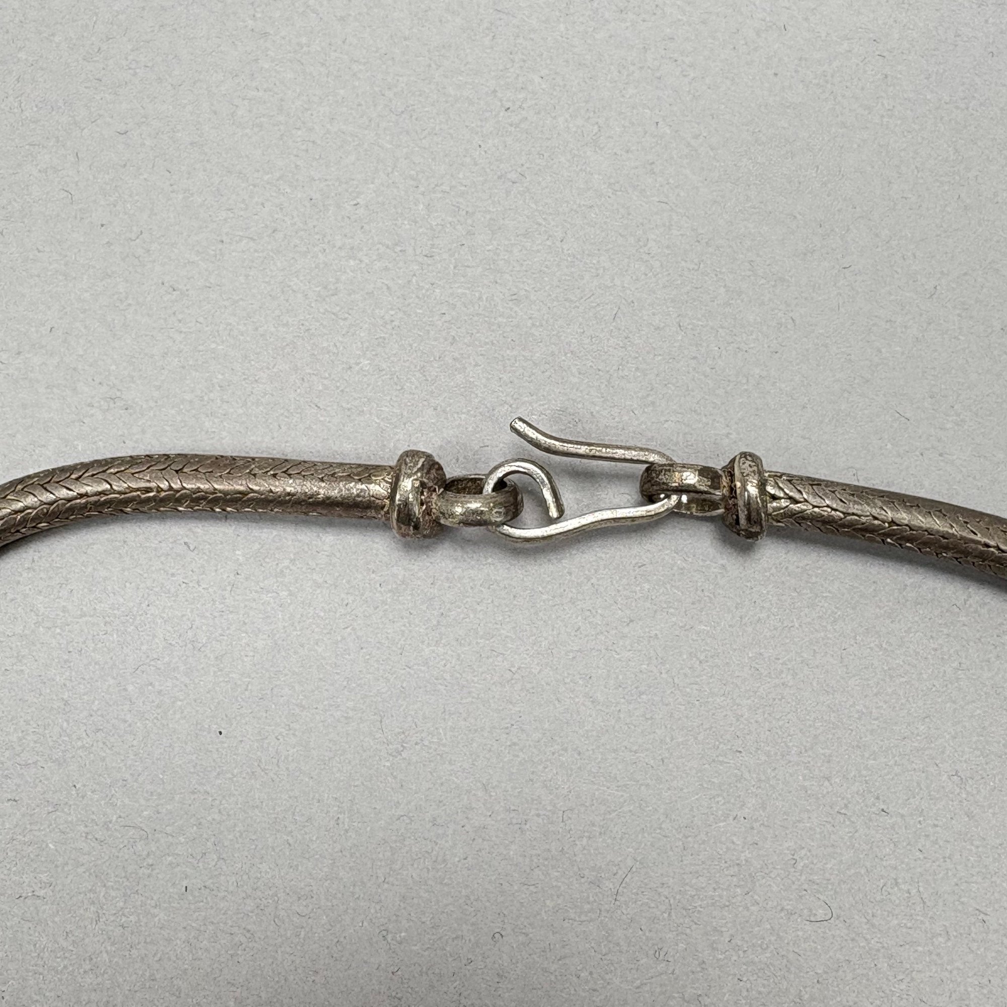 Two Chinese Silver Belts and Three Chokers. The longest belt with buckle pierced and engraved with a phoenix, flowers and leaves, all unmarked.