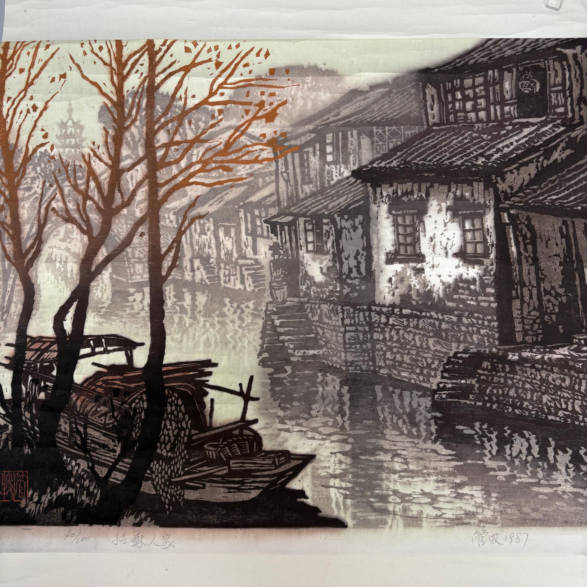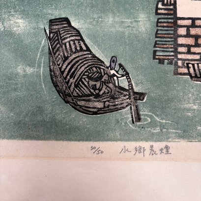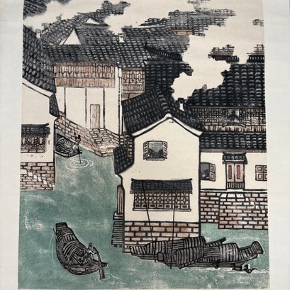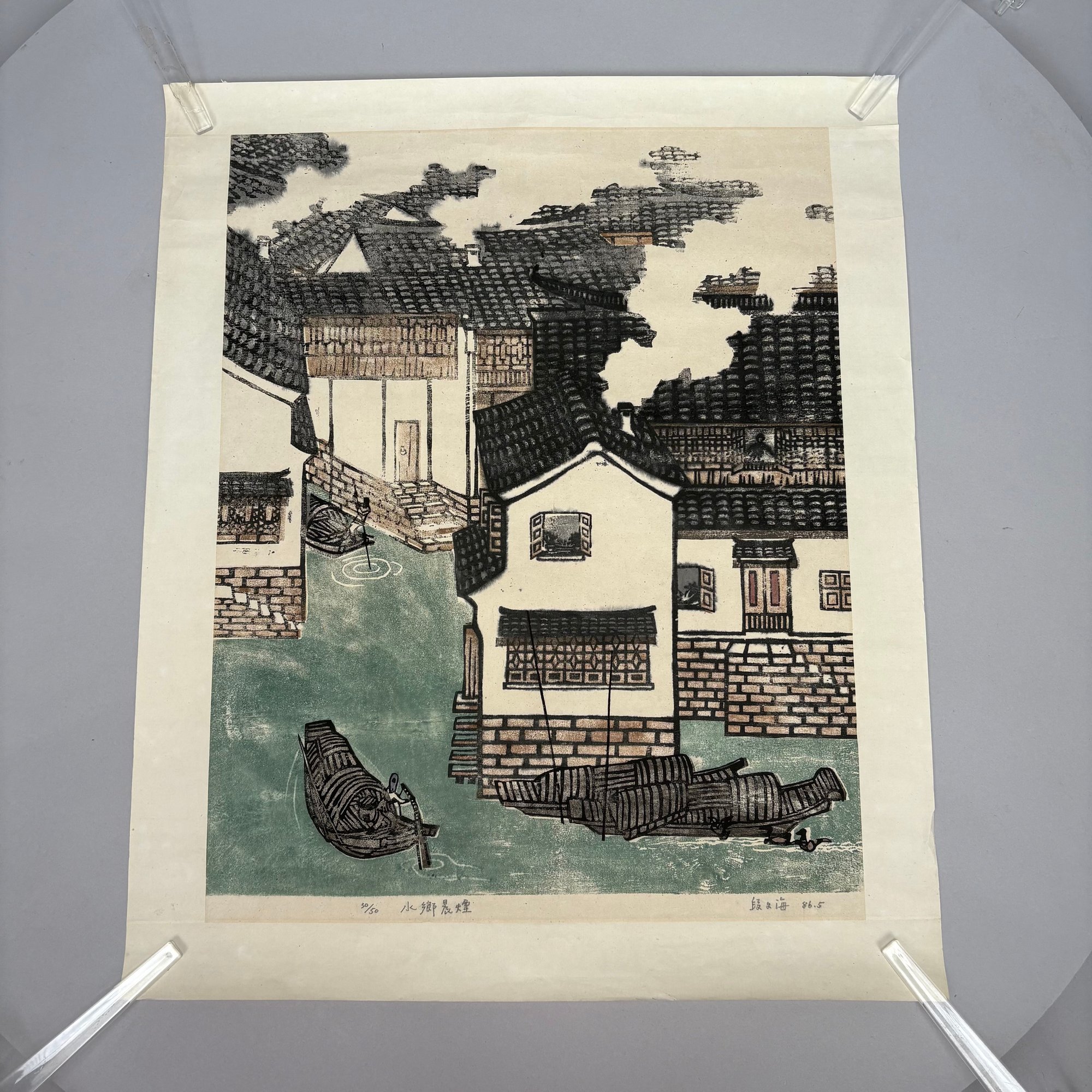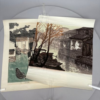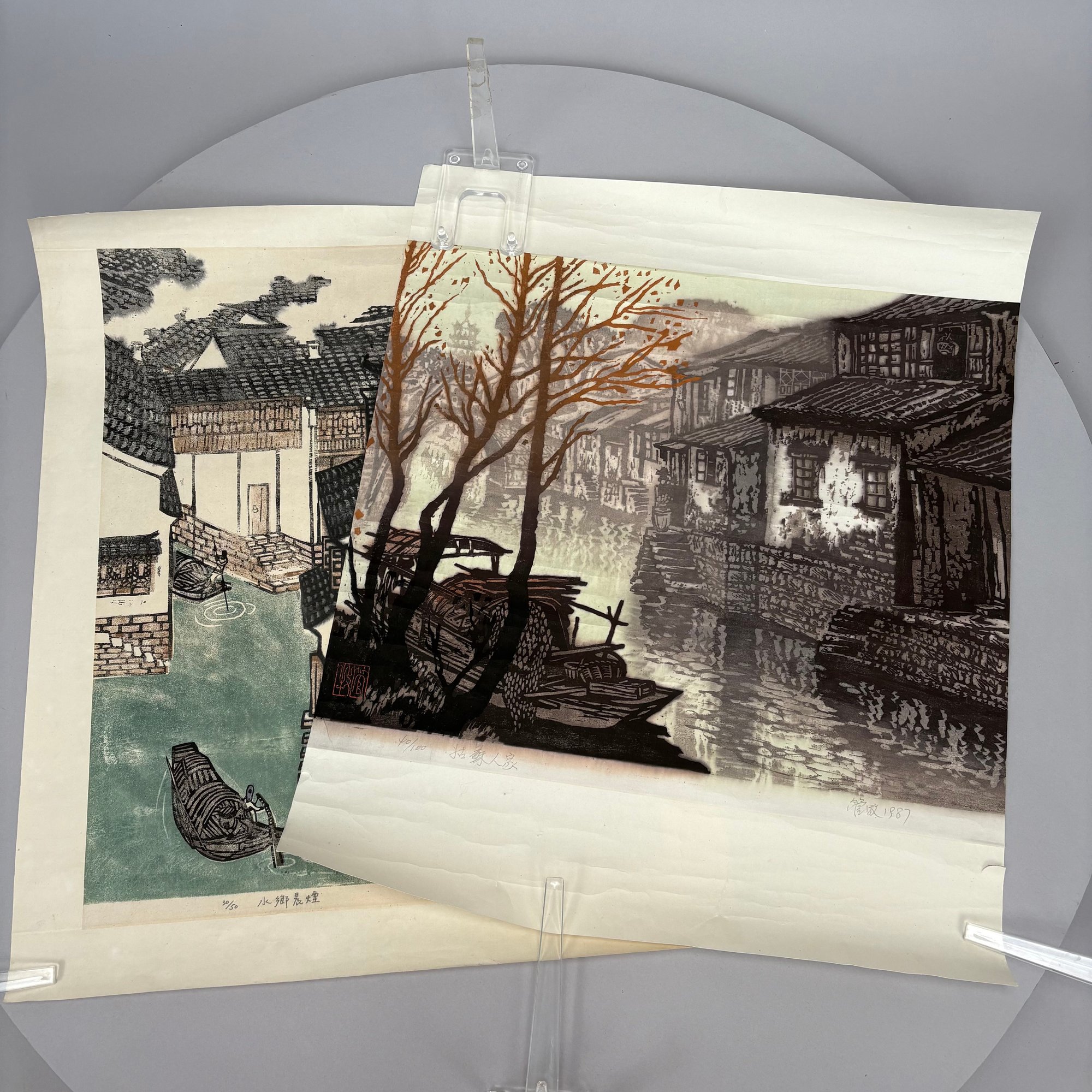 Two Chinese Woodblock Prints. The first depicting two figures rowing sampans through a village, the second a sampan beside a stream and building, each signed by the artist in pencil, the first numbered 30/50, the second 40/100.