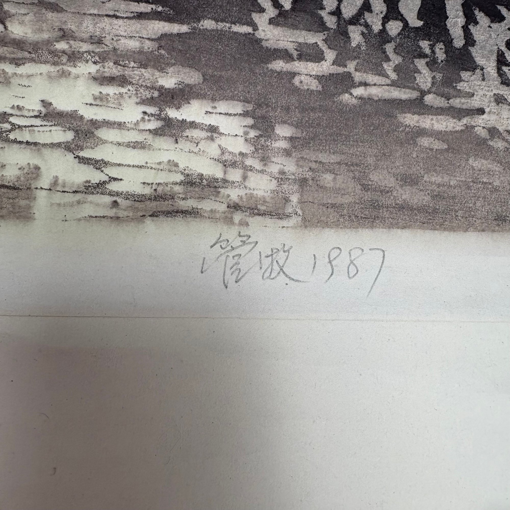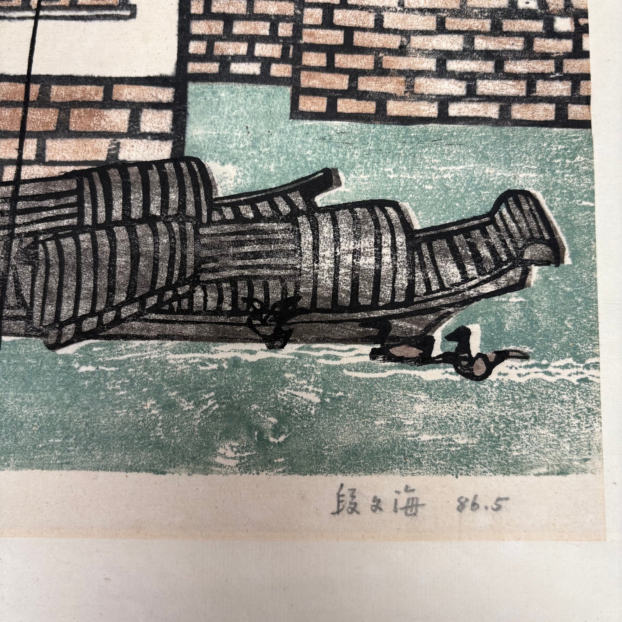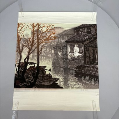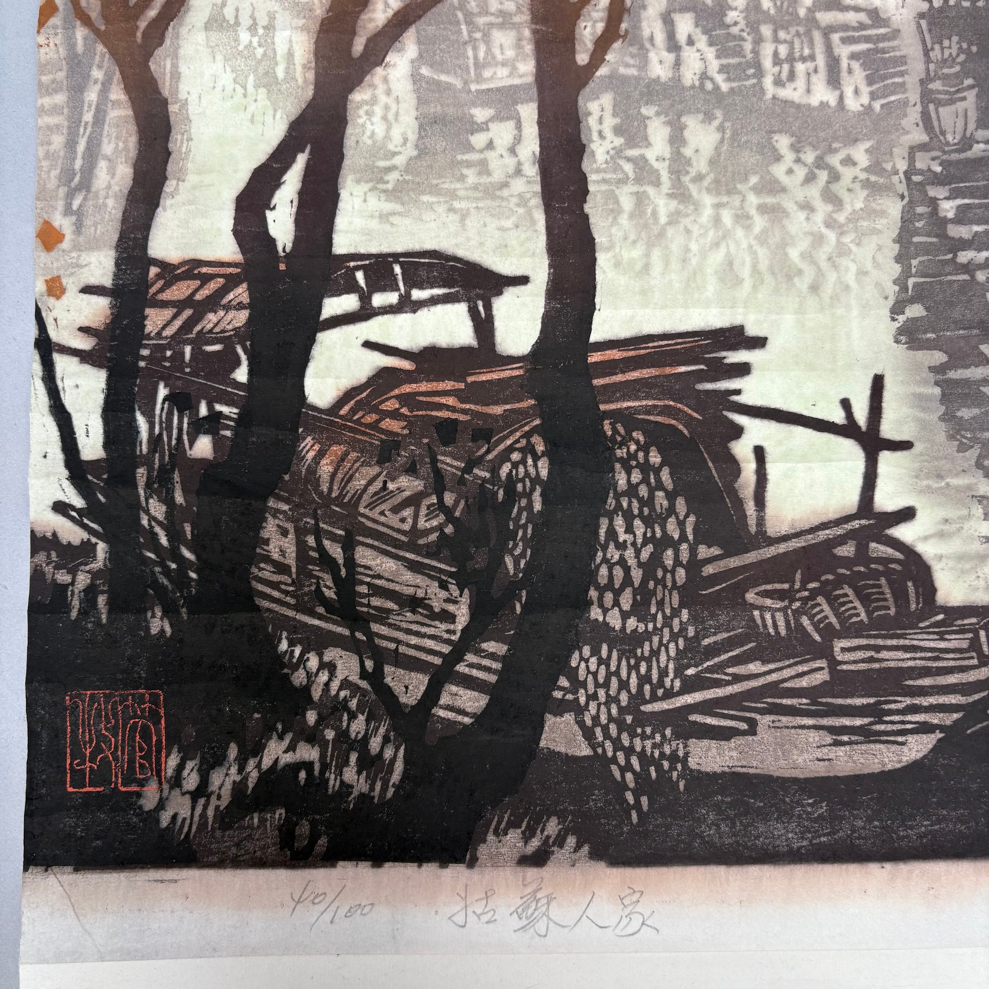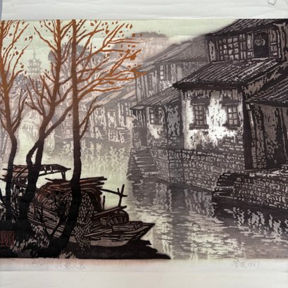 Two Chinese Woodblock Prints. The first depicting two figures rowing sampans through a village, the second a sampan beside a stream and building, each signed by the artist in pencil, the first numbered 30/50, the second 40/100.