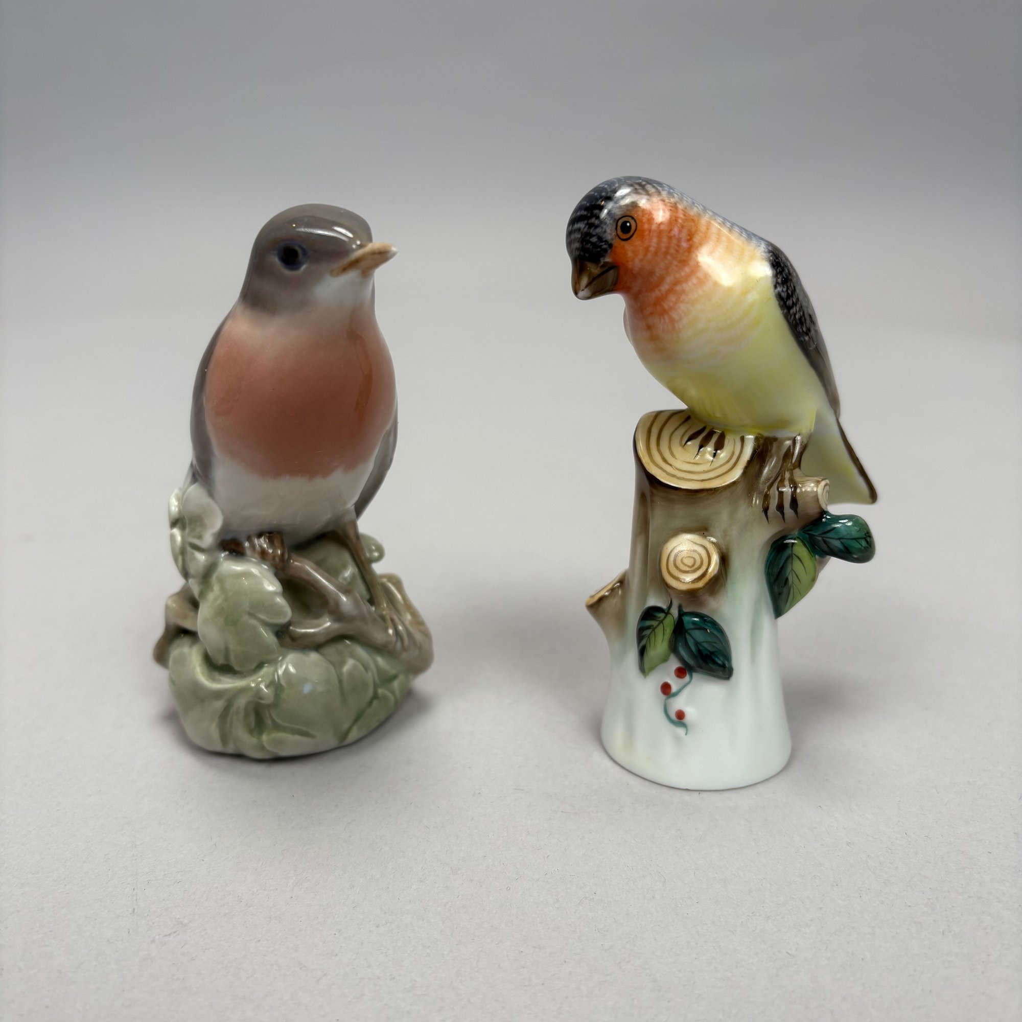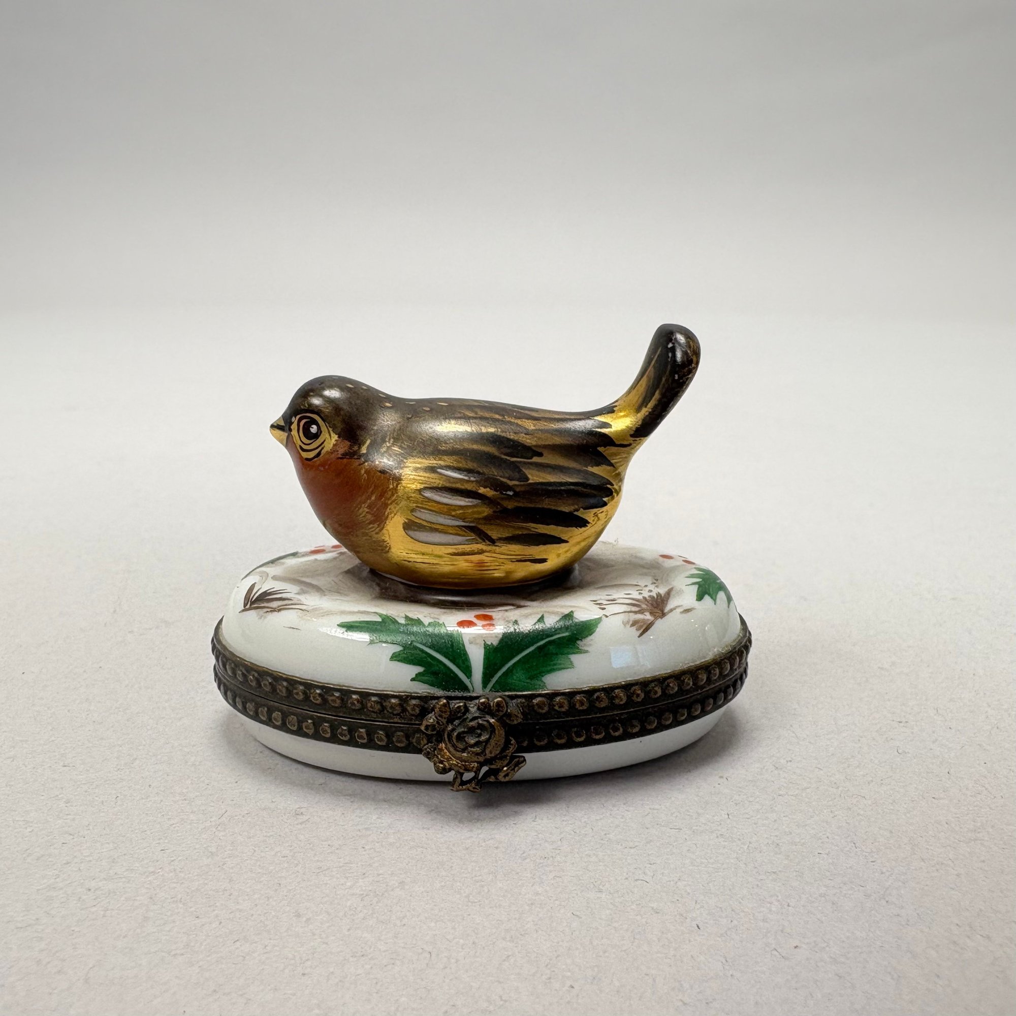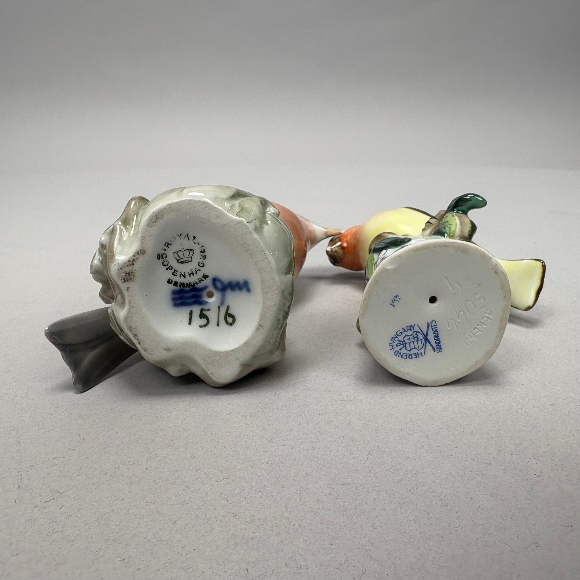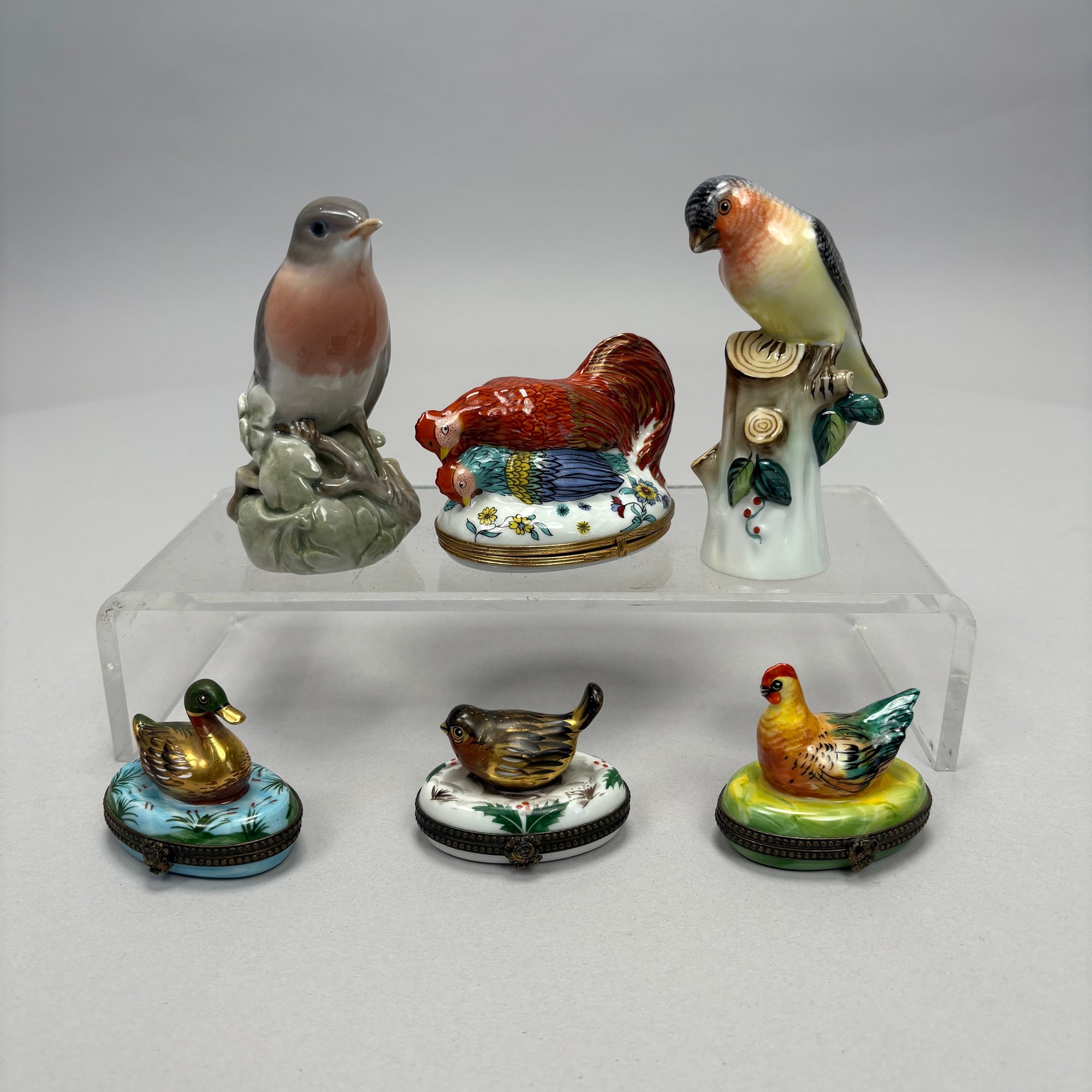 Two Continental Porcelain Figures and Four Limoges Boxes, 20th Century. Comprising a Royal Copenhagen Robin by the artist Peter Herold, 1962, printed crown, "ROYAL COPENHAGEN DENMARK," wave marks and "JM" in underglaze-blue, "1516" in green enamel; a Herend bird on a winter tree stump with holly, printed "HEREND HUNGARY HANDPAINTED" factory mark, number "197;" and four Limoges trinket boxes of a rooster and hen, a hen on a nest, a duck and a songbird, various marks.