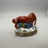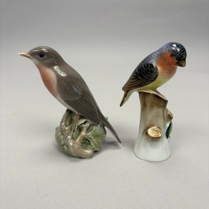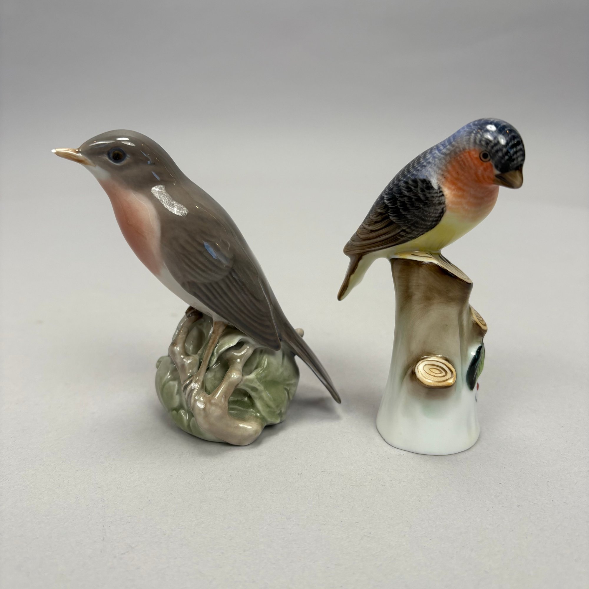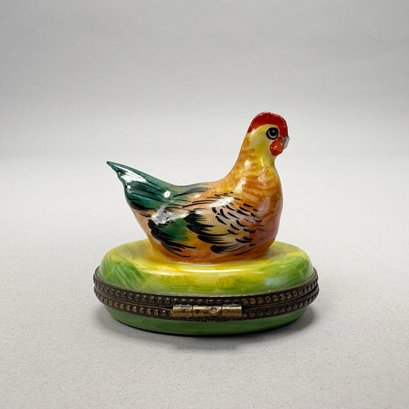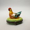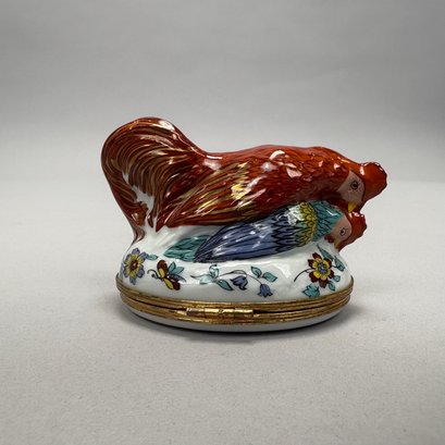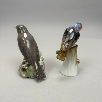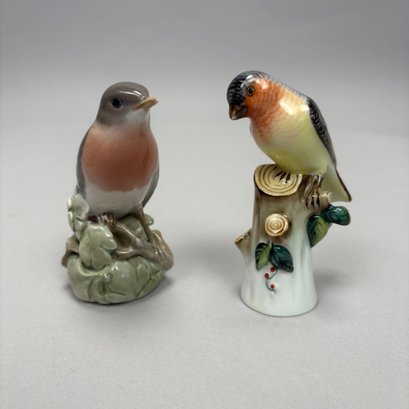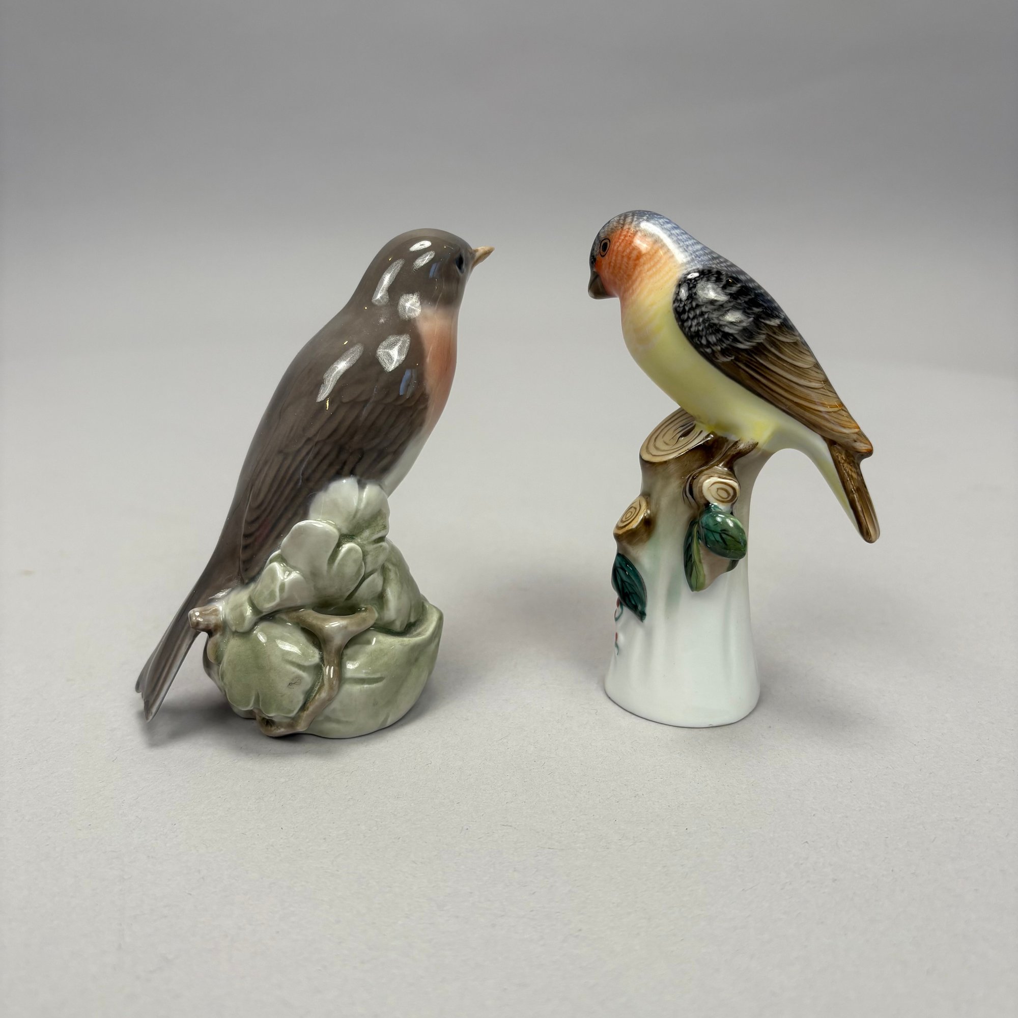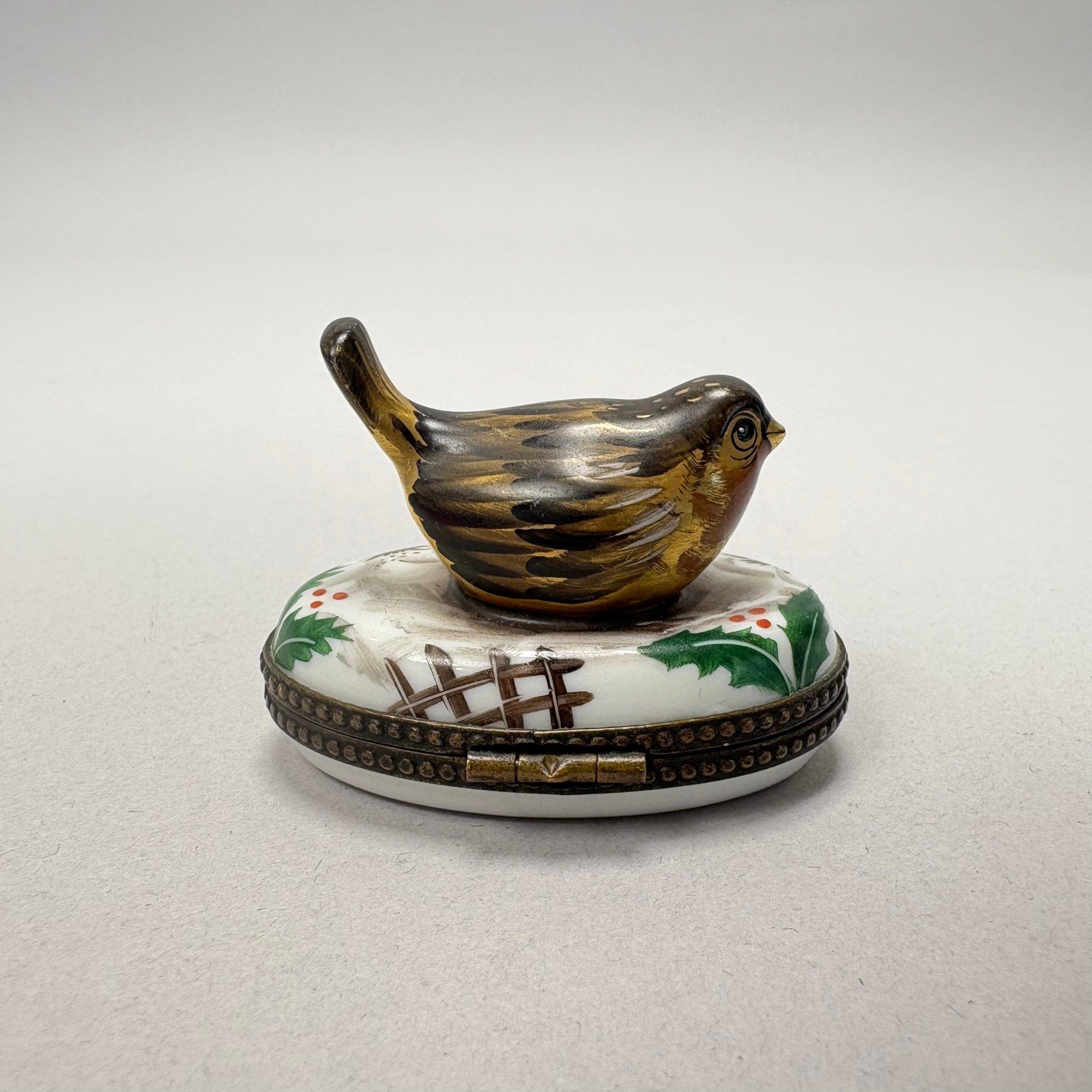 Two Continental Porcelain Figures and Four Limoges Boxes, 20th Century. Comprising a Royal Copenhagen Robin by the artist Peter Herold, 1962, printed crown, "ROYAL COPENHAGEN DENMARK," wave marks and "JM" in underglaze-blue, "1516" in green enamel; a Herend bird on a winter tree stump with holly, printed "HEREND HUNGARY HANDPAINTED" factory mark, number "197;" and four Limoges trinket boxes of a rooster and hen, a hen on a nest, a duck and a songbird, various marks.