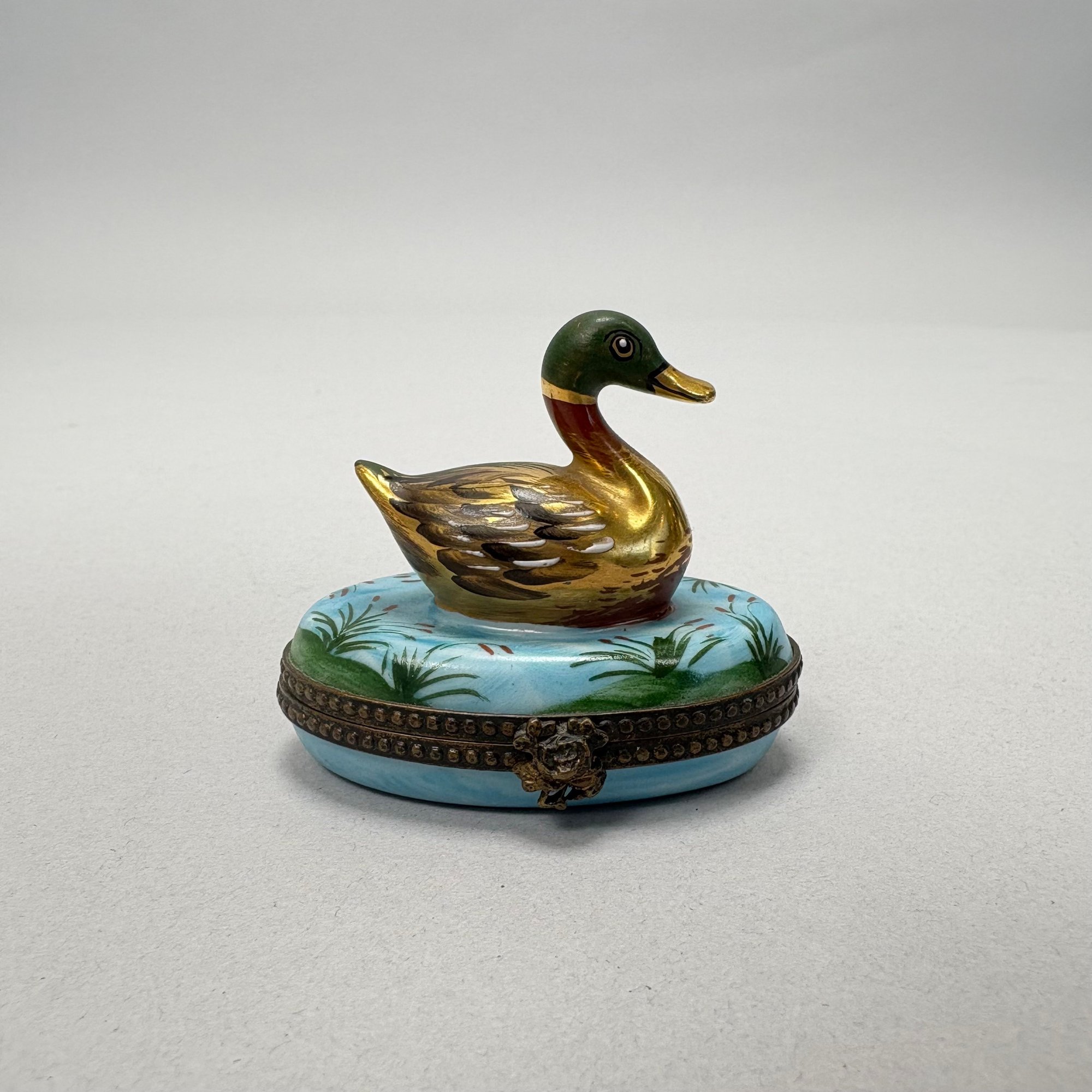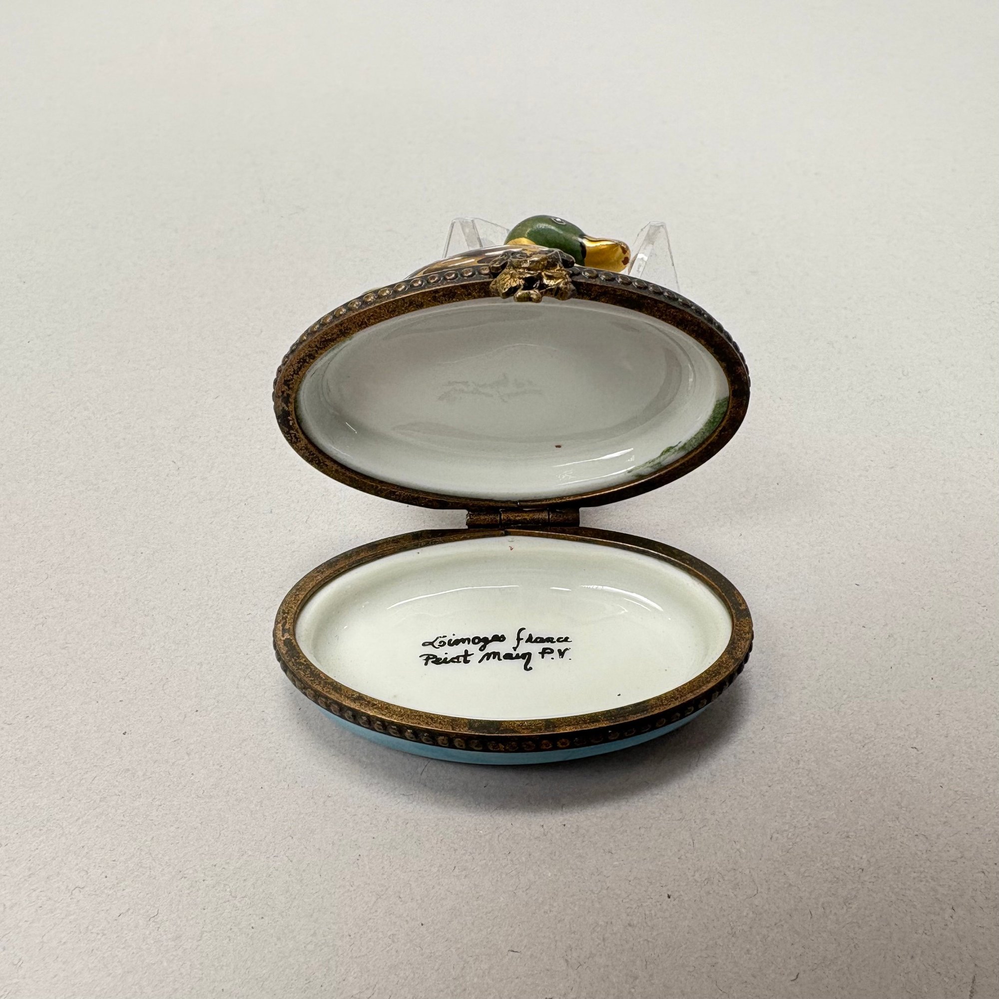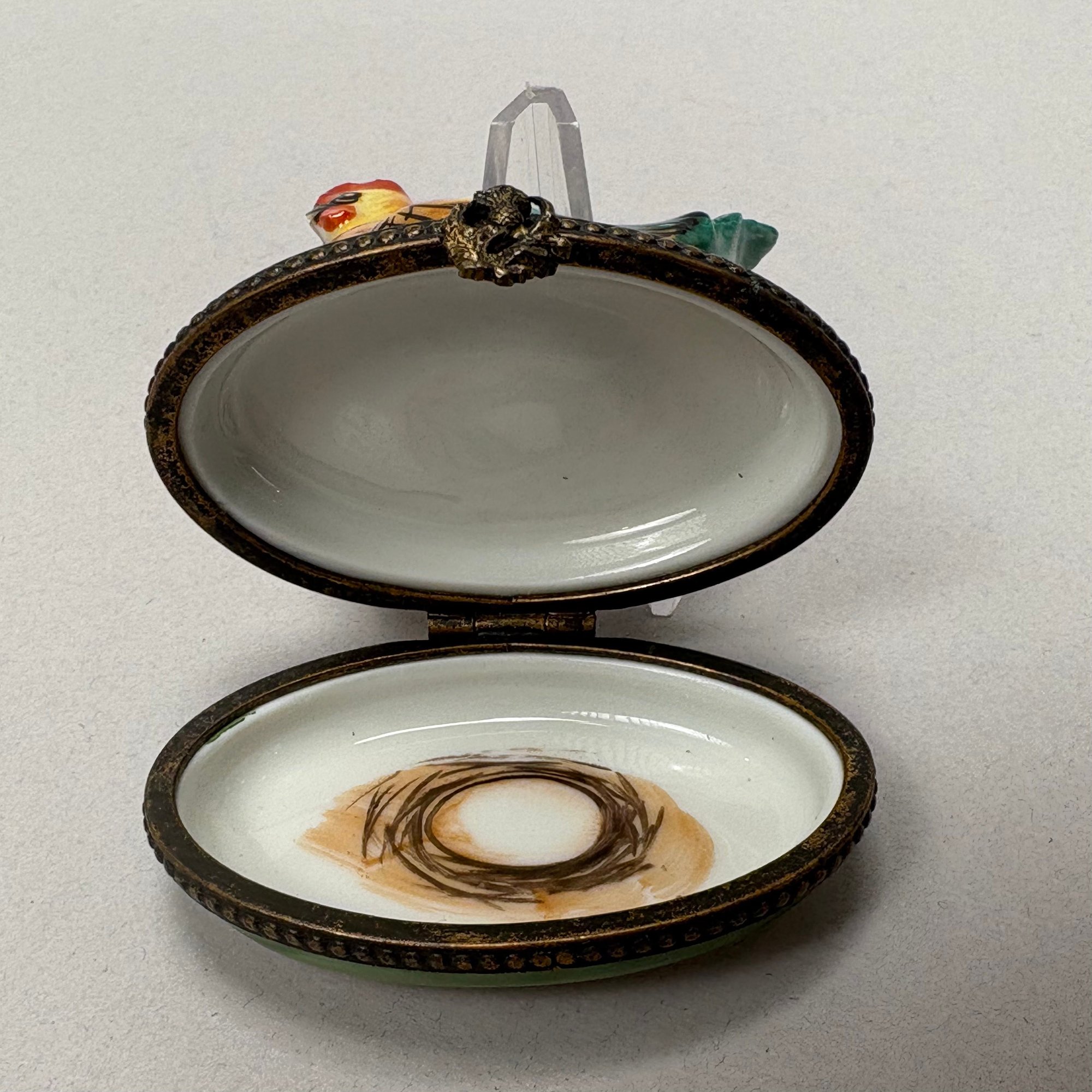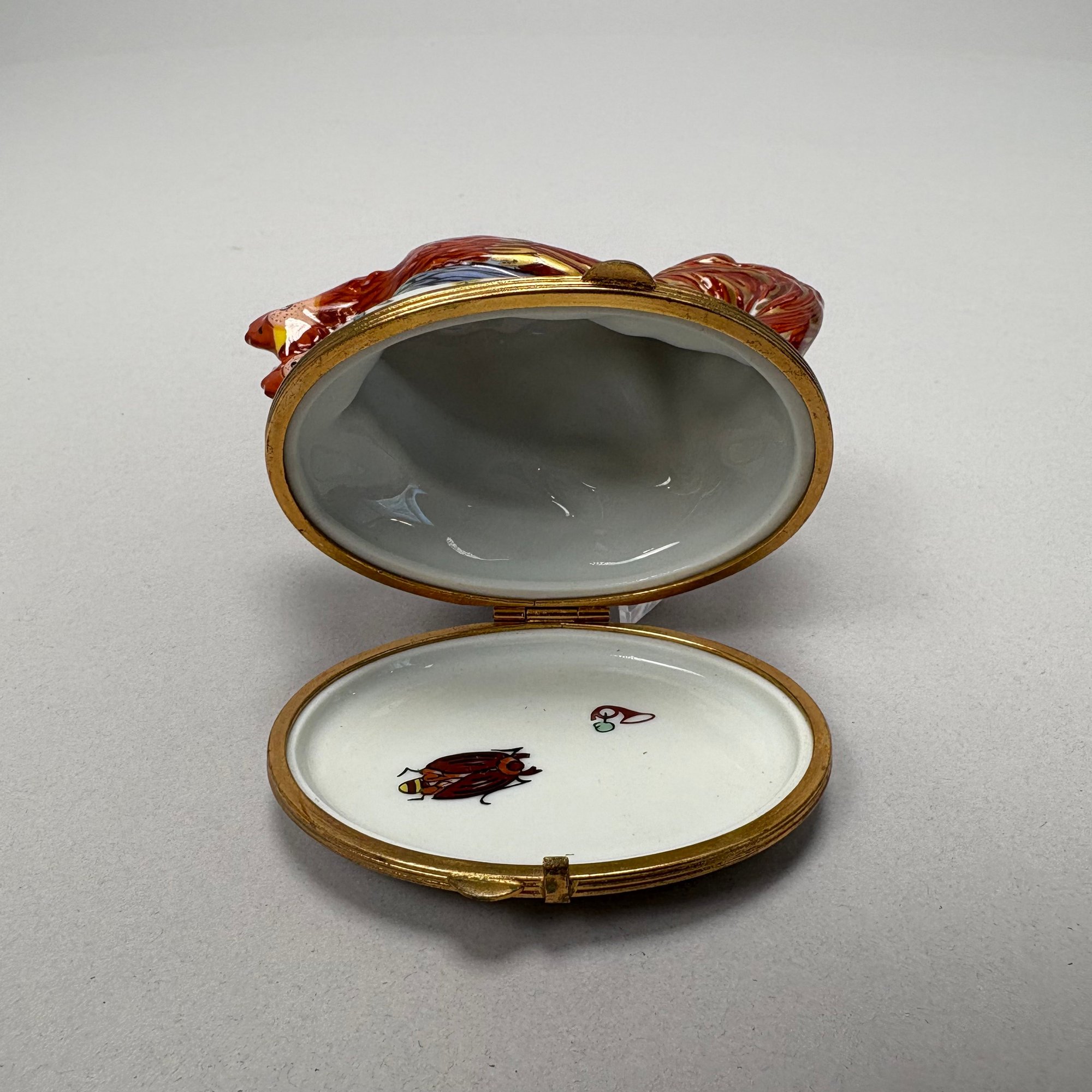 Two Continental Porcelain Figures and Four Limoges Boxes, 20th Century. Comprising a Royal Copenhagen Robin by the artist Peter Herold, 1962, printed crown, "ROYAL COPENHAGEN DENMARK," wave marks and "JM" in underglaze-blue, "1516" in green enamel; a Herend bird on a winter tree stump with holly, printed "HEREND HUNGARY HANDPAINTED" factory mark, number "197;" and four Limoges trinket boxes of a rooster and hen, a hen on a nest, a duck and a songbird, various marks.
