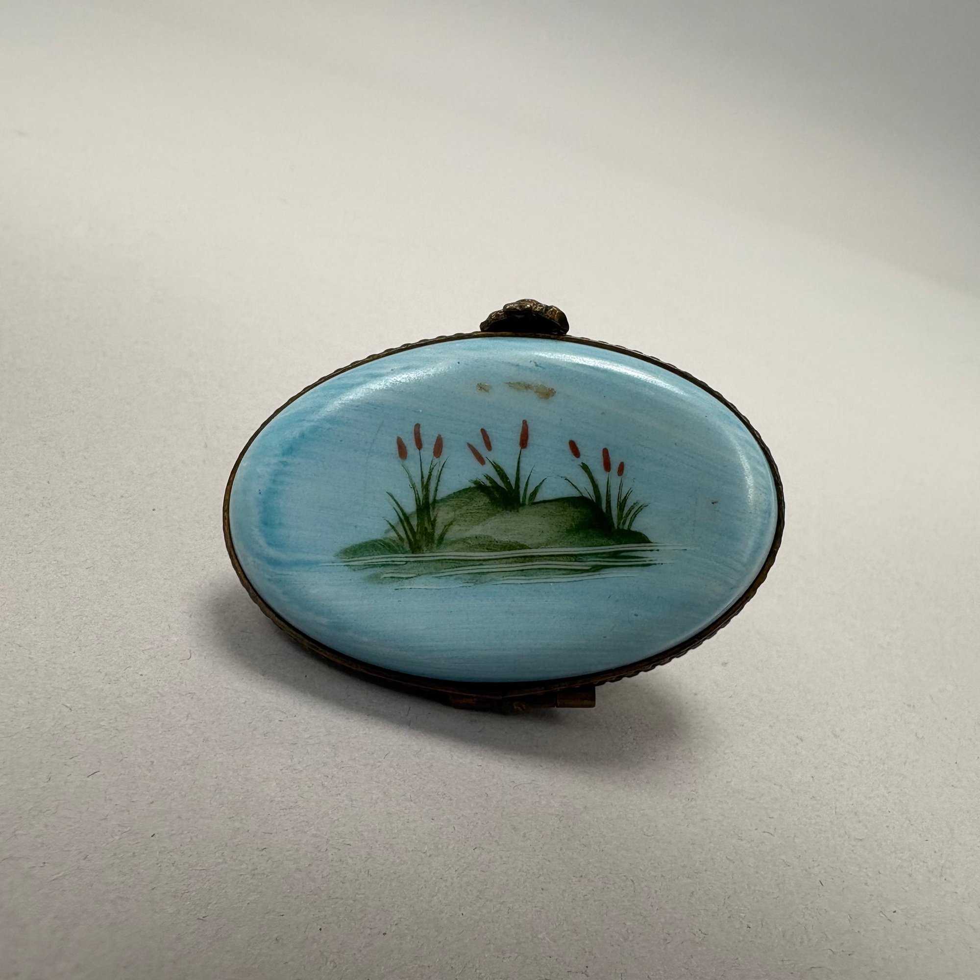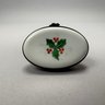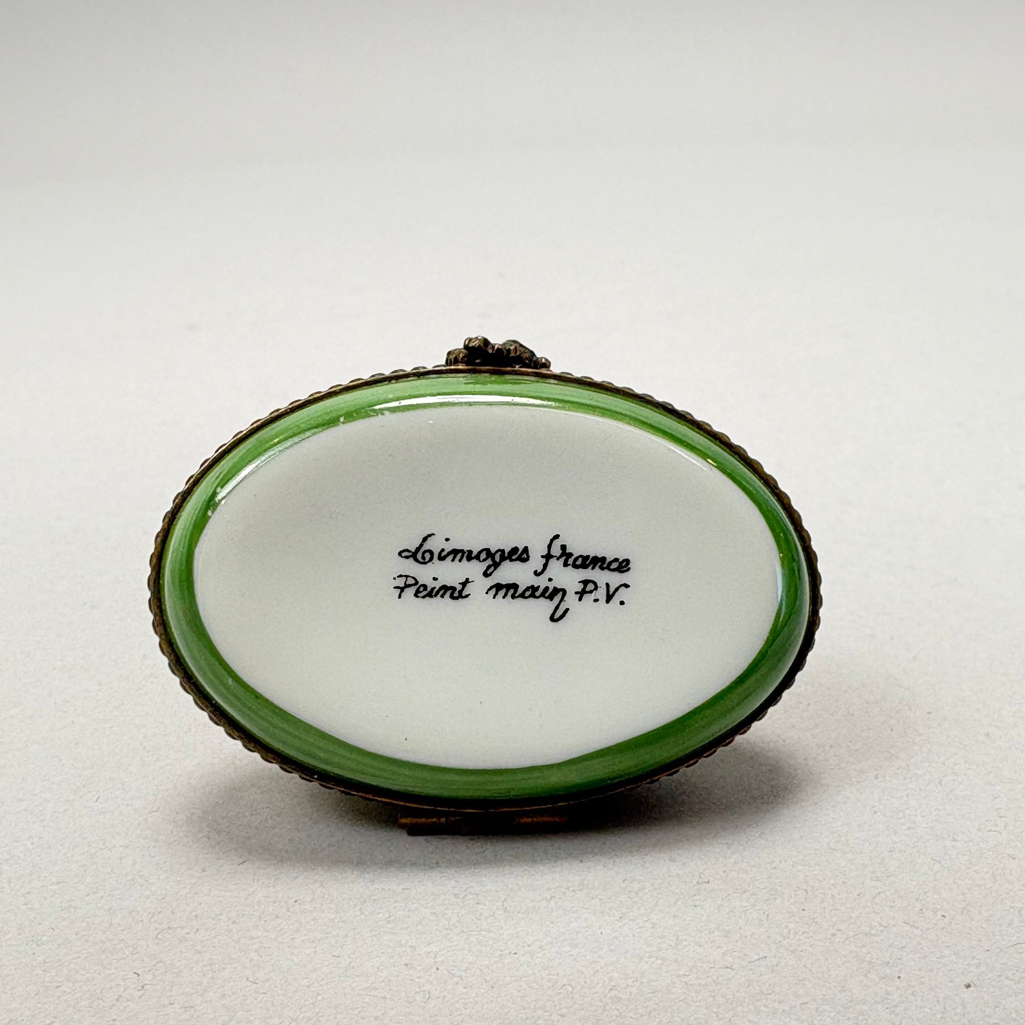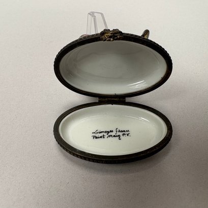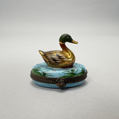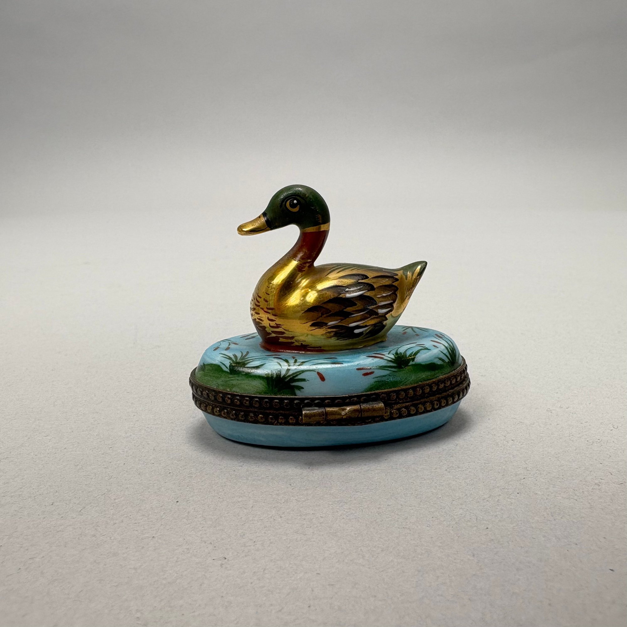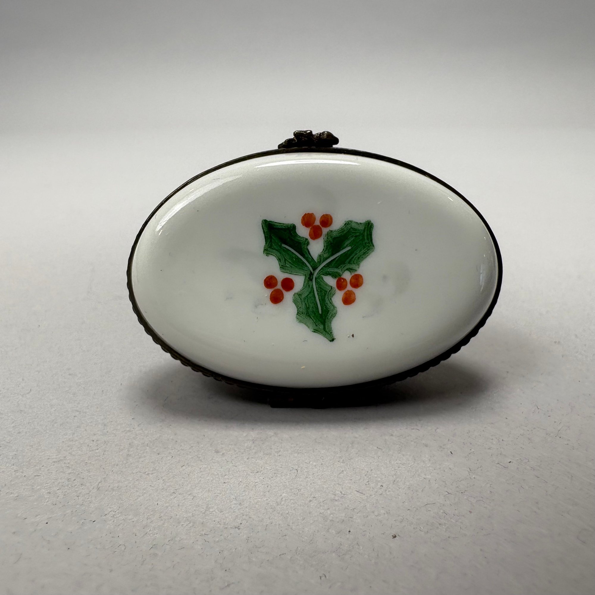 Two Continental Porcelain Figures and Four Limoges Boxes, 20th Century. Comprising a Royal Copenhagen Robin by the artist Peter Herold, 1962, printed crown, "ROYAL COPENHAGEN DENMARK," wave marks and "JM" in underglaze-blue, "1516" in green enamel; a Herend bird on a winter tree stump with holly, printed "HEREND HUNGARY HANDPAINTED" factory mark, number "197;" and four Limoges trinket boxes of a rooster and hen, a hen on a nest, a duck and a songbird, various marks.
