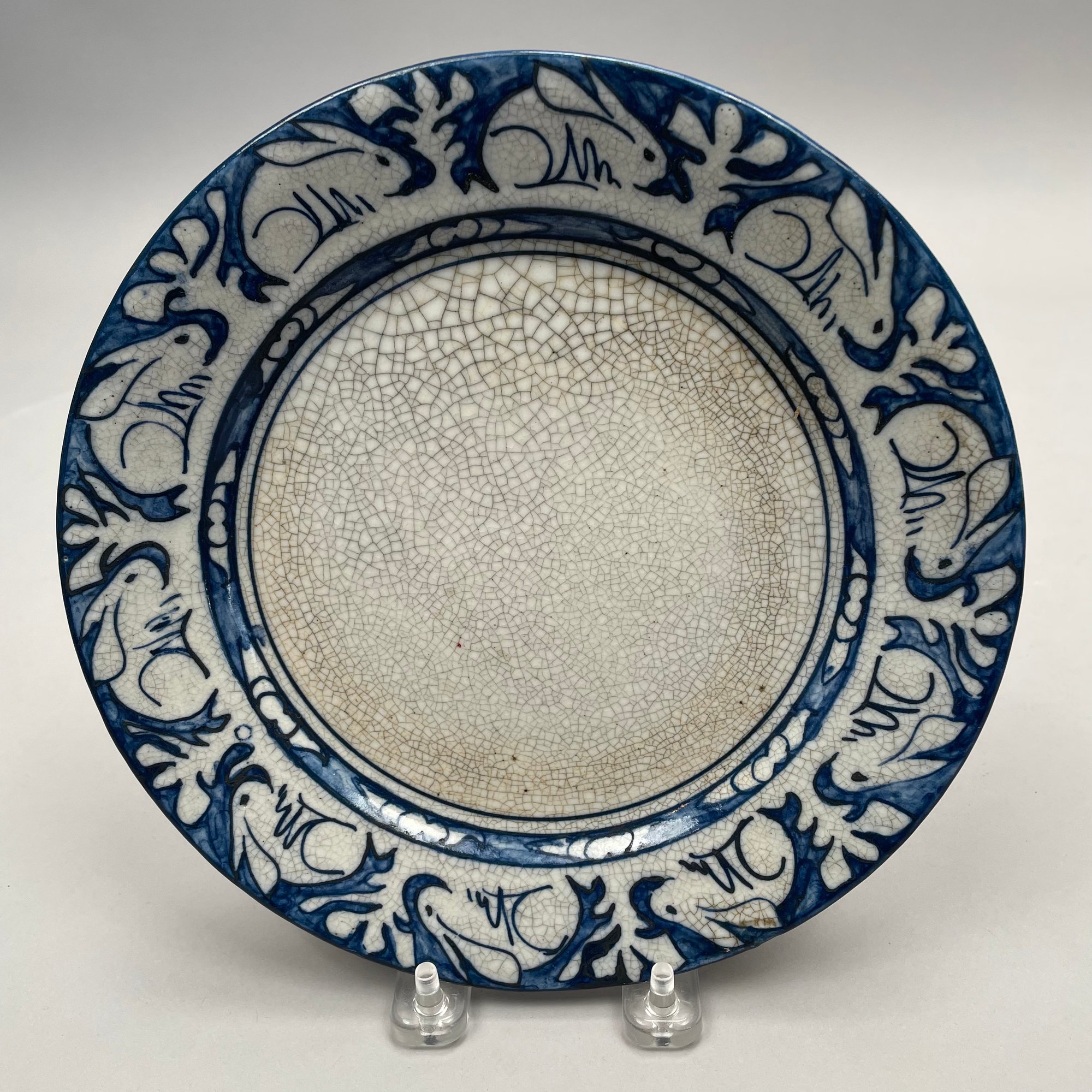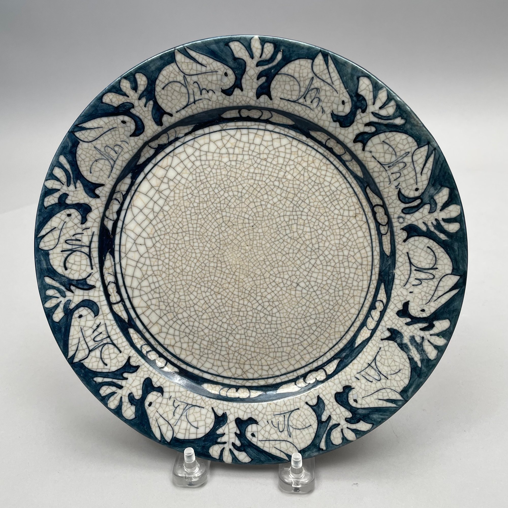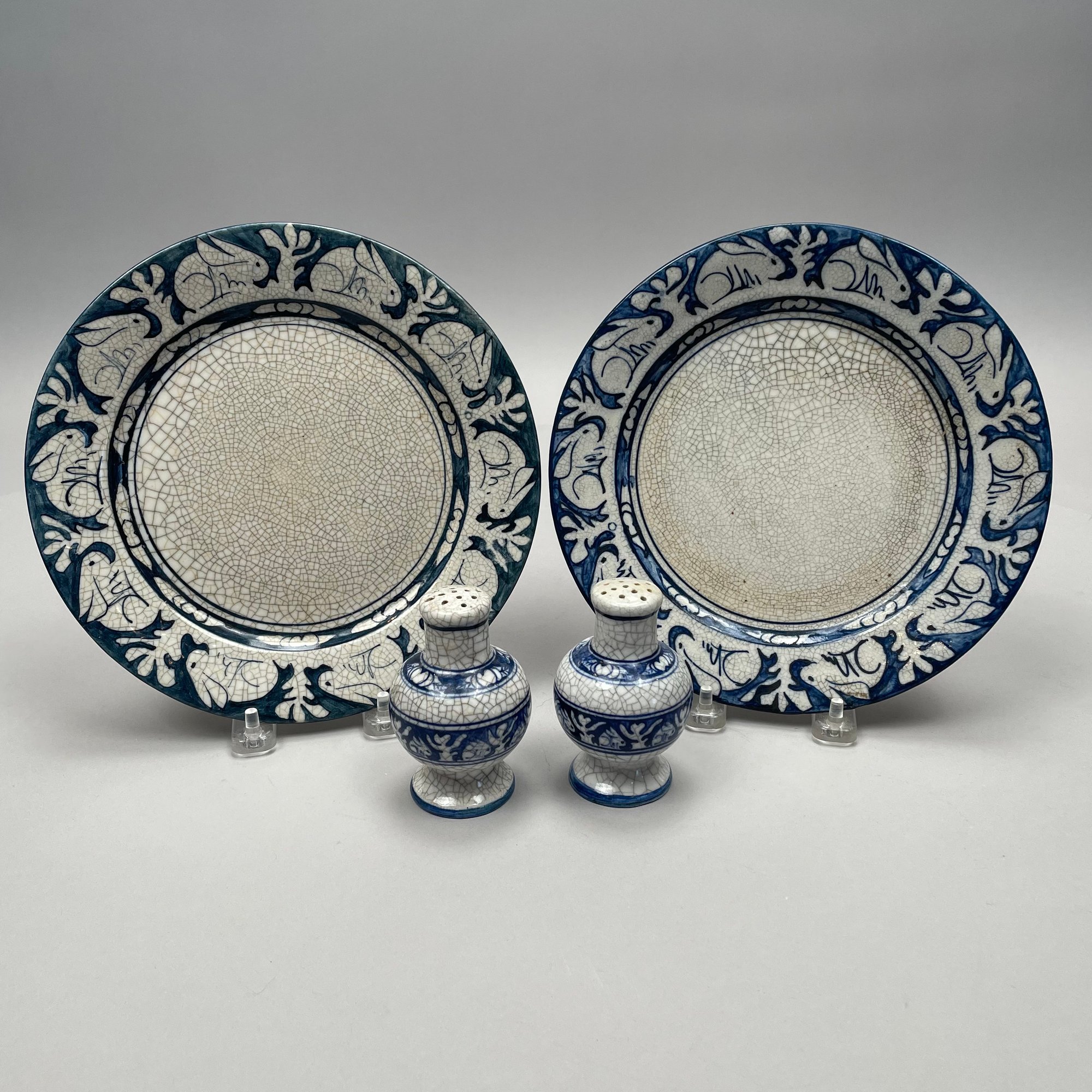 Two Dedham Pottery 'Rabbit' Plates and Two Salt Shakers, Dedham, Massachusetts, 1929-43. Each plate impressed with one rabbit, and printed with the "DEDHAM POTTERY" rabbit stamp in underglaze-blue, the shakers each painted "D.P." in blue.