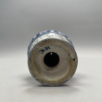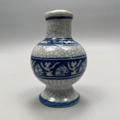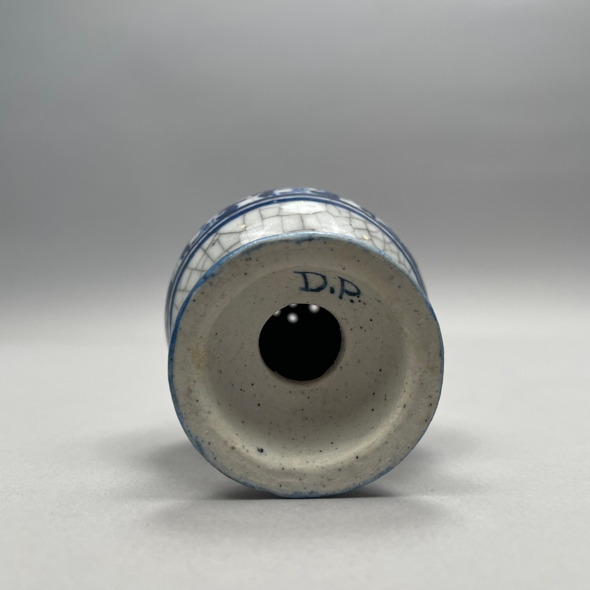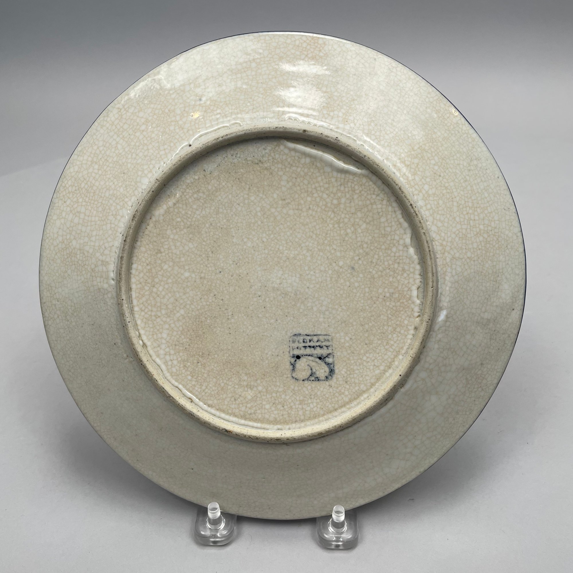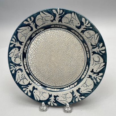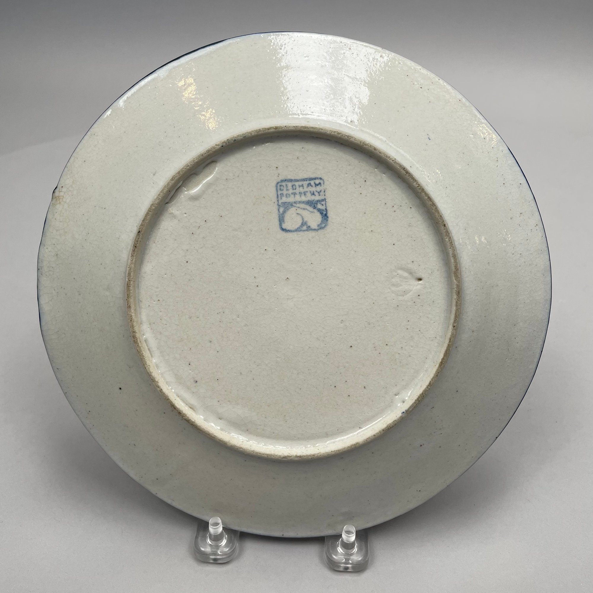 Two Dedham Pottery 'Rabbit' Plates and Two Salt Shakers, Dedham, Massachusetts, 1929-43. Each plate impressed with one rabbit, and printed with the "DEDHAM POTTERY" rabbit stamp in underglaze-blue, the shakers each painted "D.P." in blue.