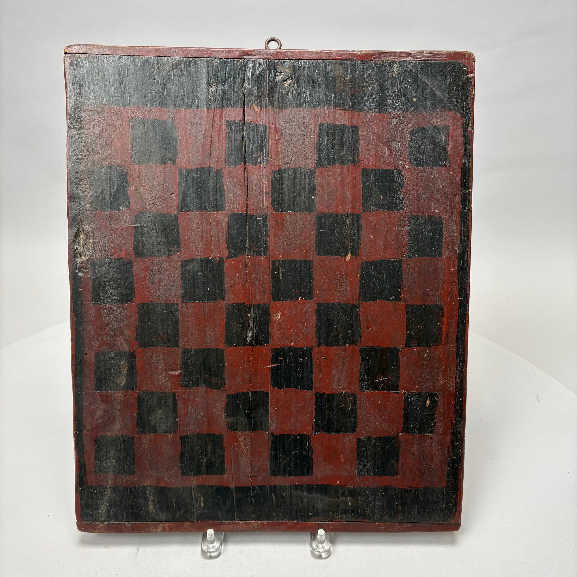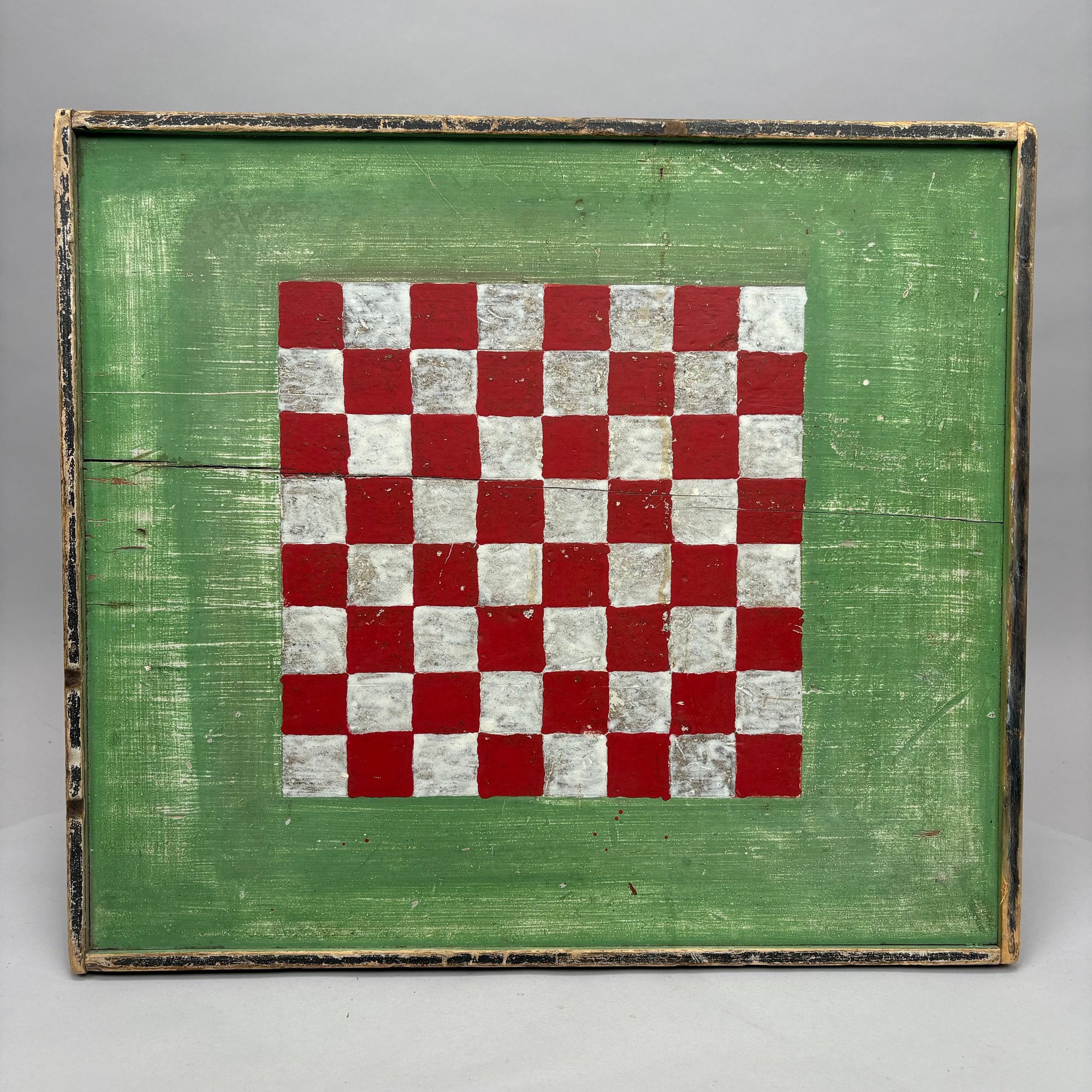 Two Folk Art Painted Wood Checkerboards, 20th Century. The checkerboard in red and black paint with breadboard ends; the checkerboard in red, white and green paint sketched in pencil on the other side with another playing surface, within an applied edge.