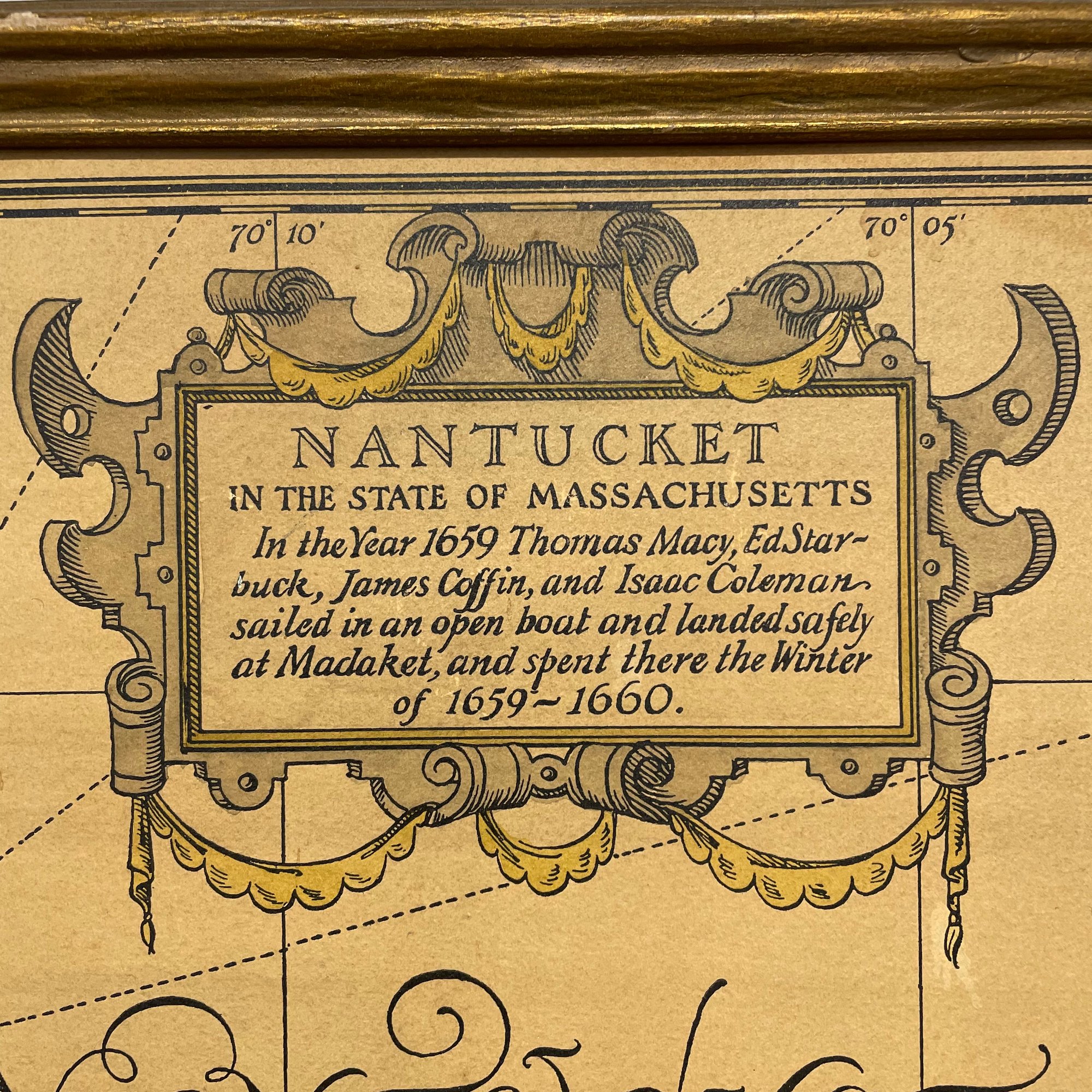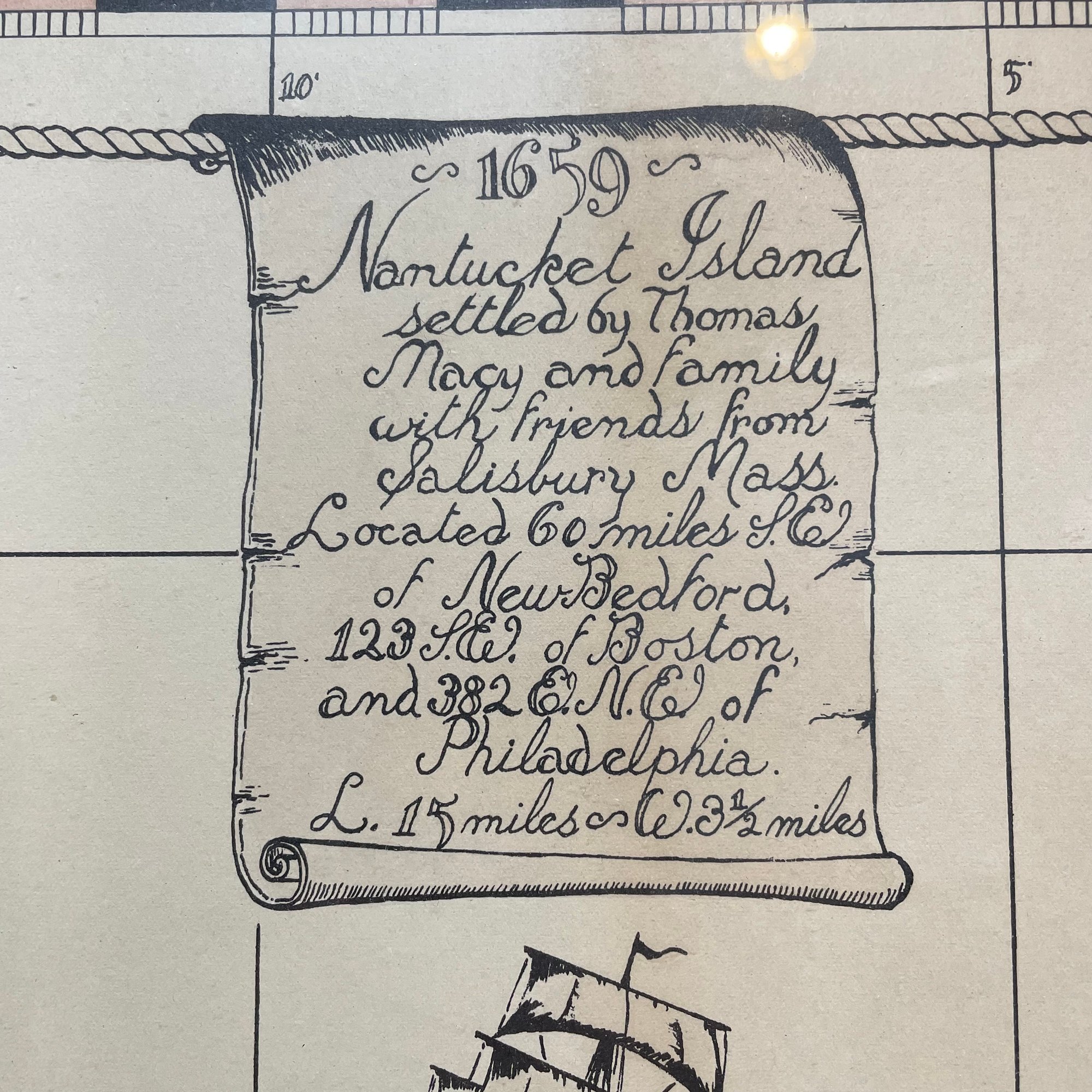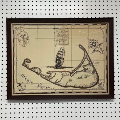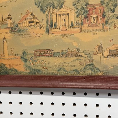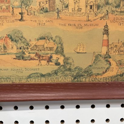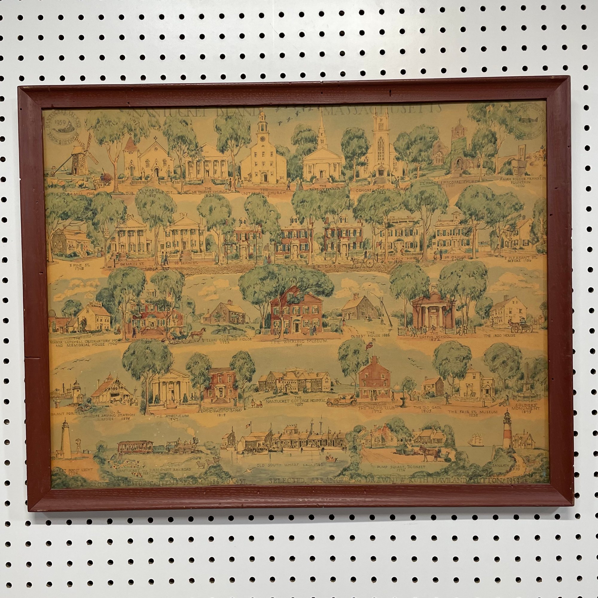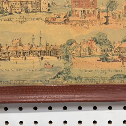 Two Prints of Maps Depicting Nantucket Island, and a Ruth Haviland Sutton Lithograph. The lithograph printed "A GROUP OF HISTORIC ITEMS FROM 1686 TO 1957, SELECTED, ARRANGED AND DRAWN BY RUTH HAVILAND SUTTON, 1959."